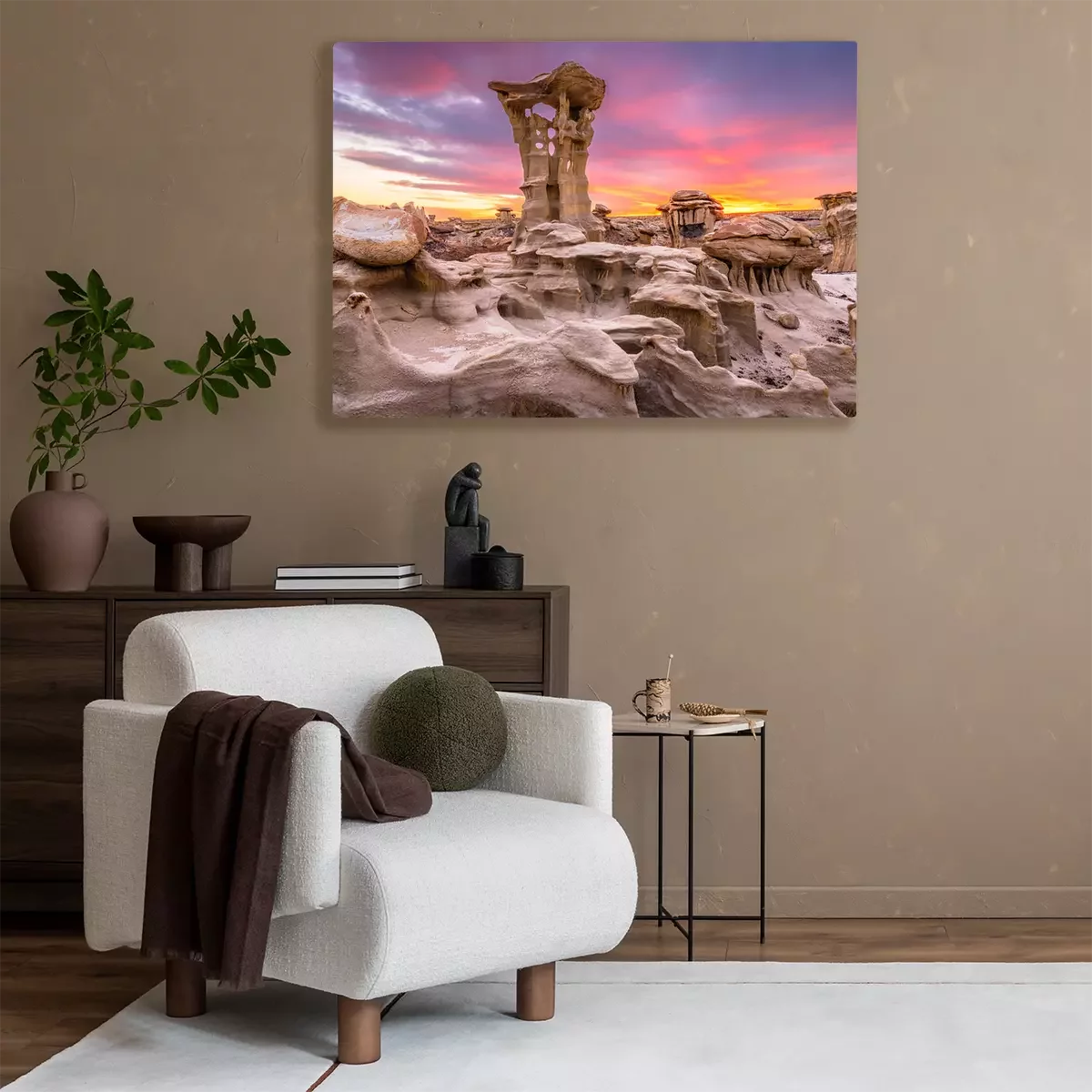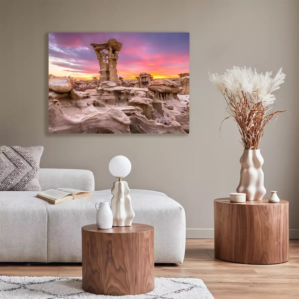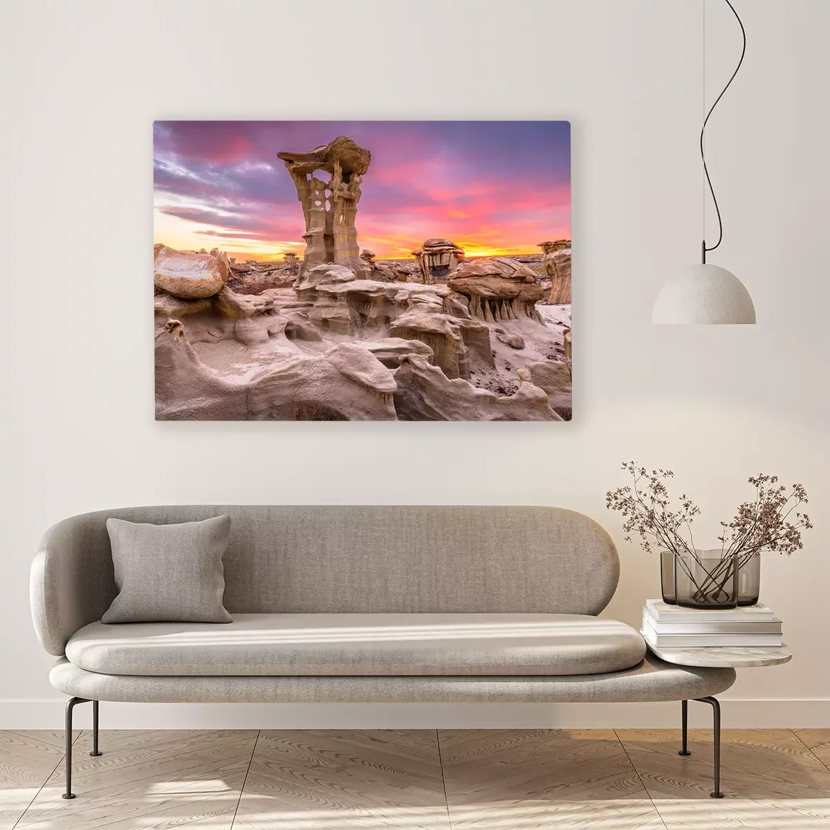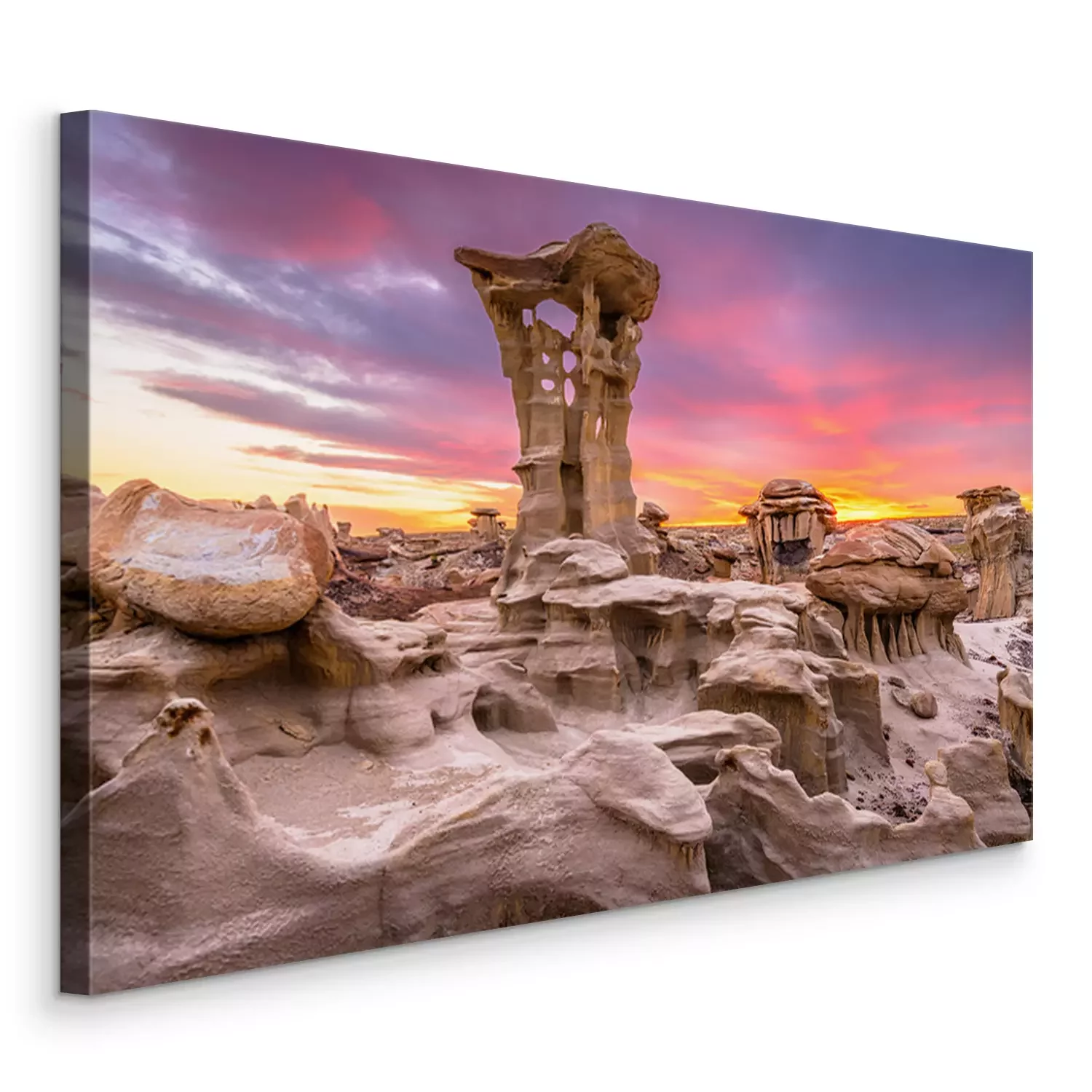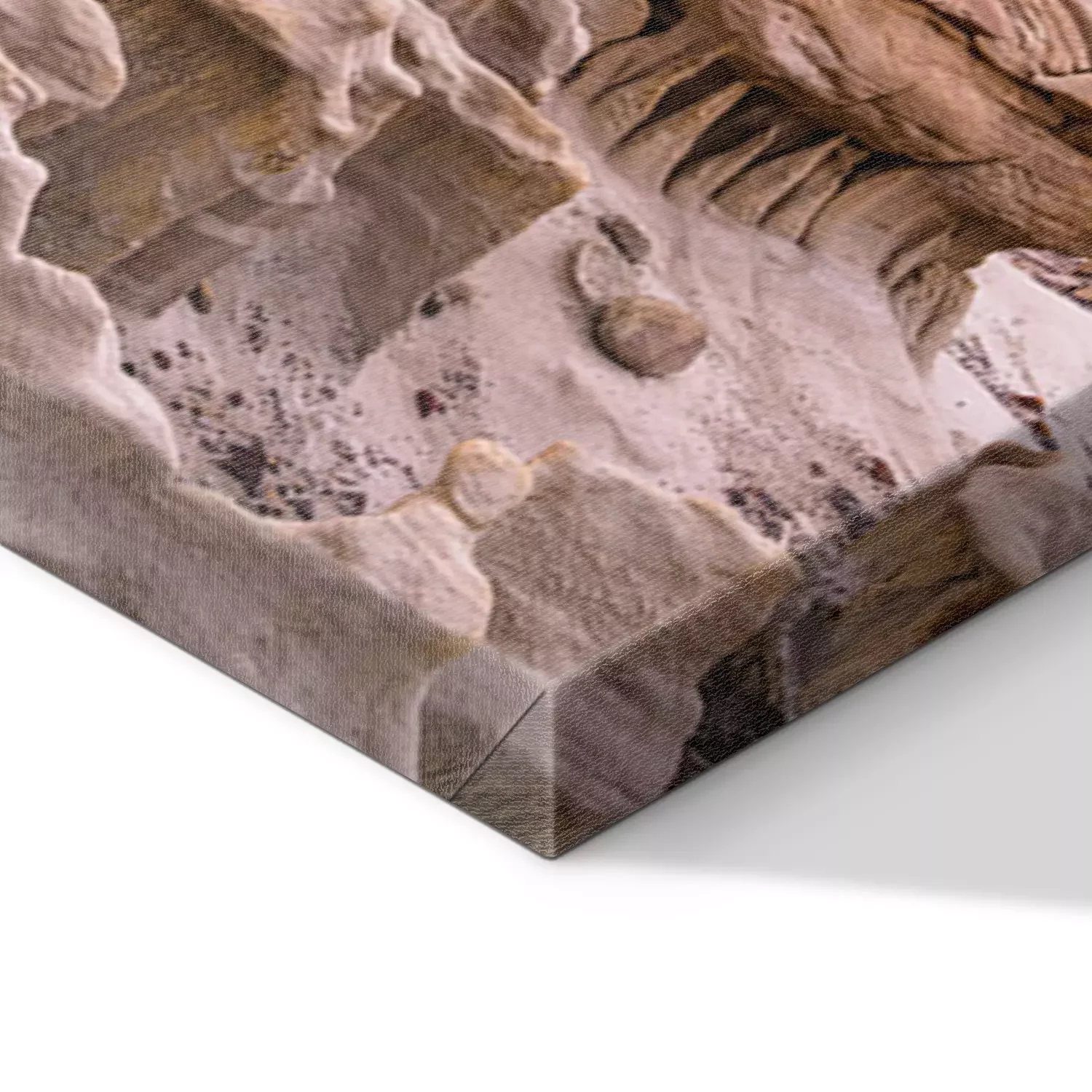 De print wordt aangebracht op hoogwaardig canvas dat op een schildersweefgetouw (spieraam) wordt gespannen. Omdat de print de zijranden bedekt, hoeft het ontwerp niet met een extra kader te worden omlijst. Wij raden ook composities aan die uit meerdere foto's bestaan en zo een coherente compositie vormen.