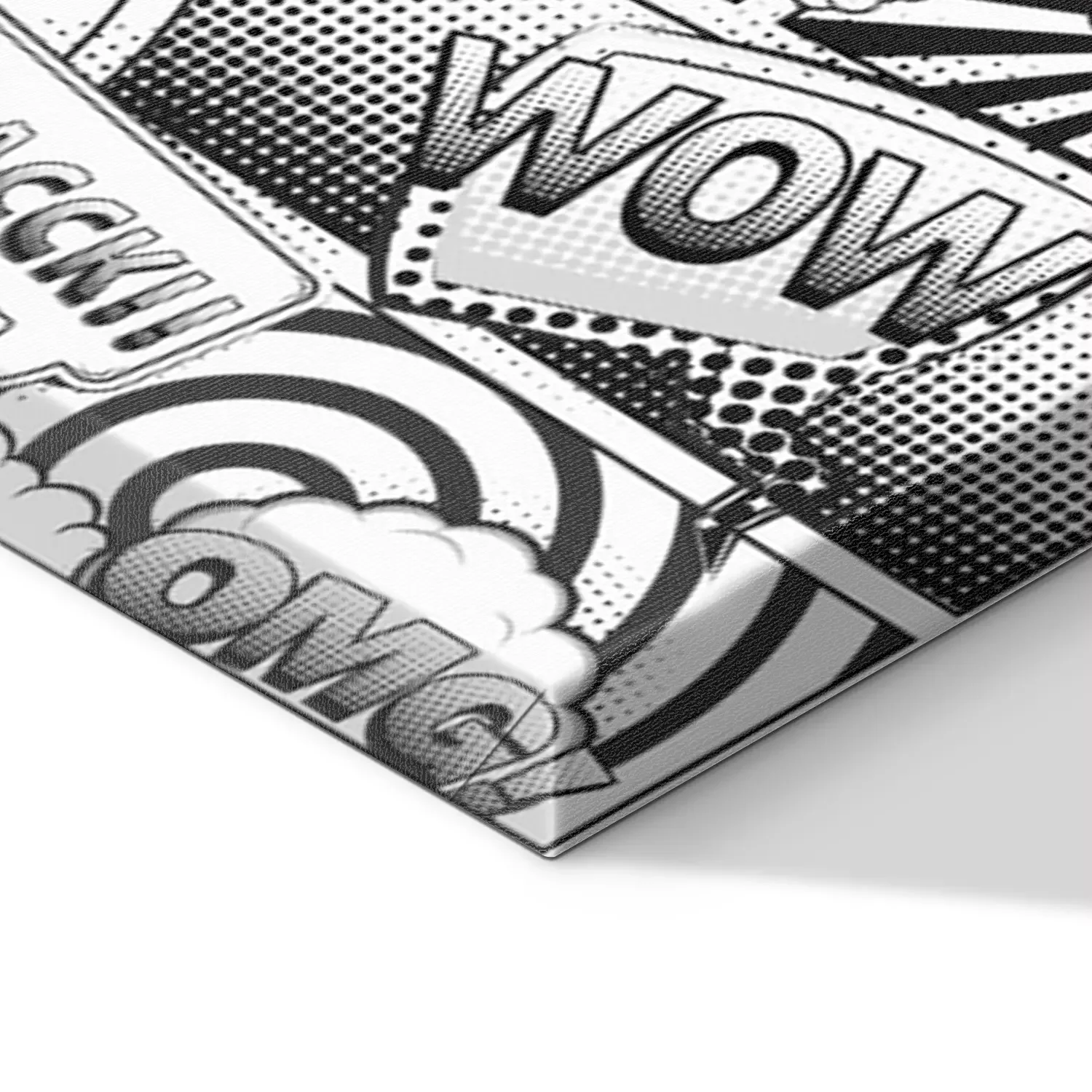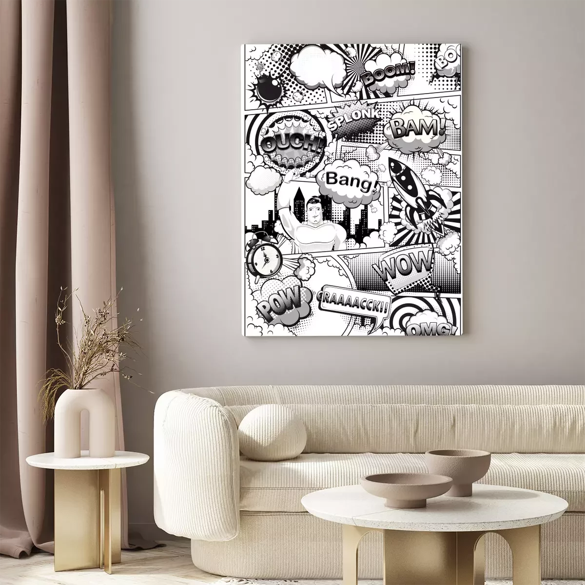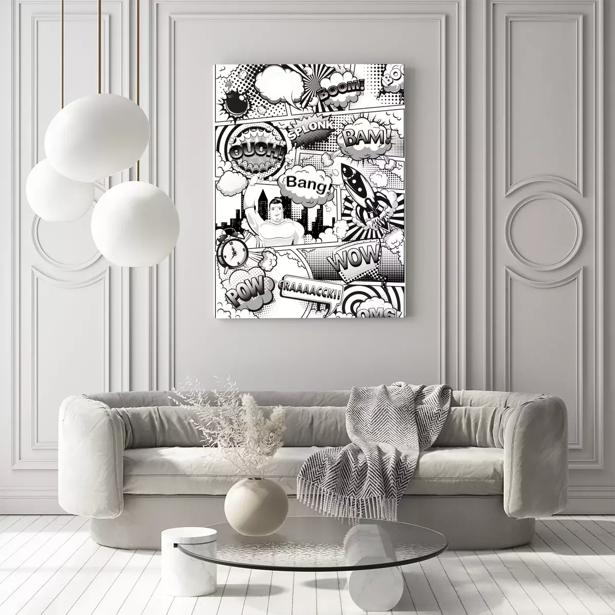 Canvas Black and white comic book page divided by lines with speech bubbles, rocket, superhero and sounds effect. Illustration