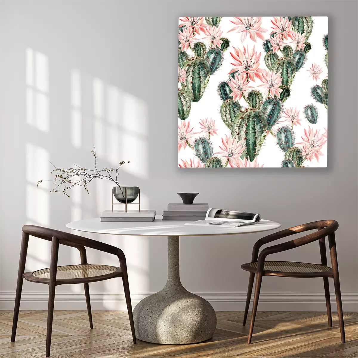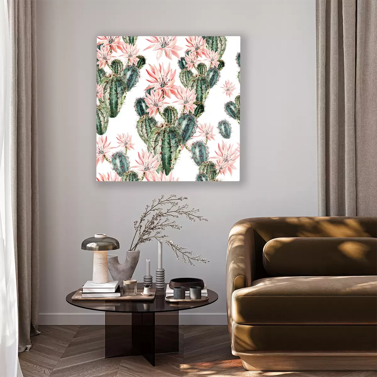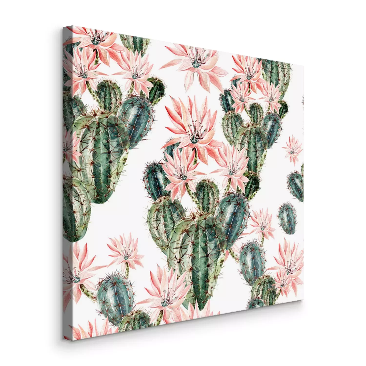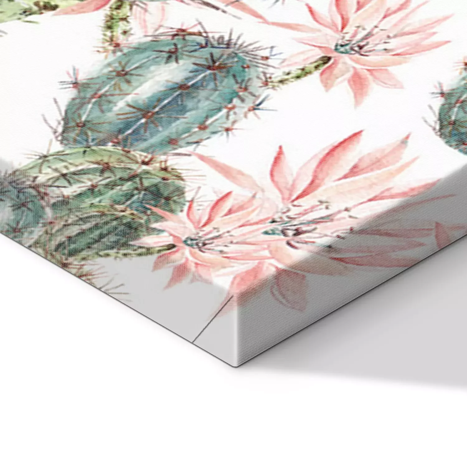 Canvas: Bloeiende cactussen met bloemen geschilderd in aquarel