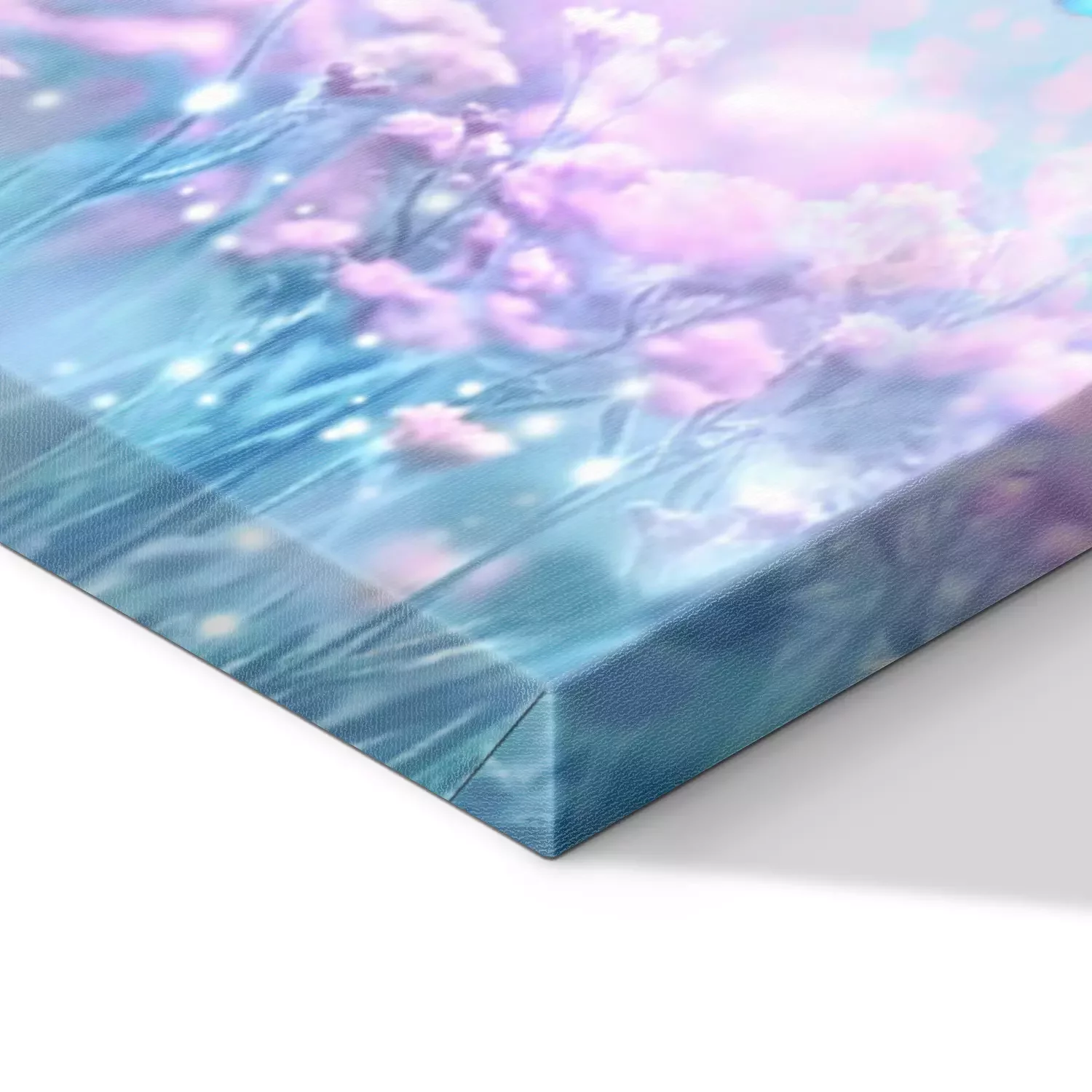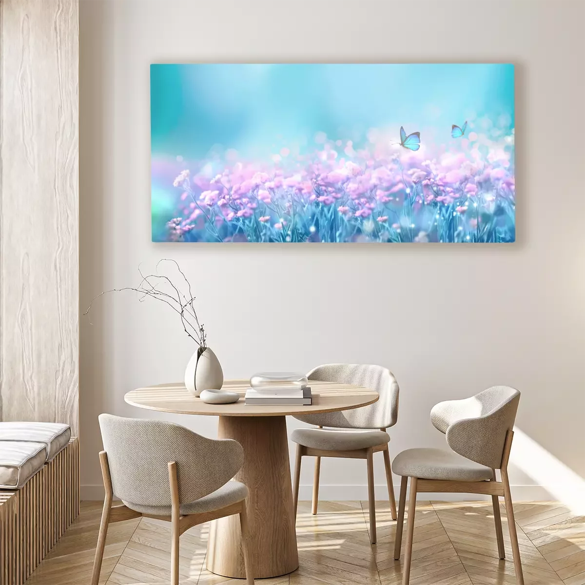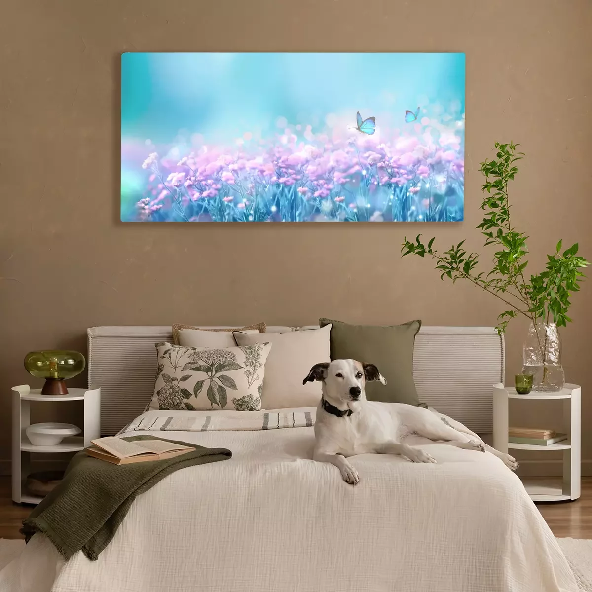 Canvas: Bloemen de lente natuurlijk landschap met wilde roze lila bloemen op weide en fladderende vlinders op blauwe hemelachtergrond. Dromerig zacht lucht artistiek beeld. Soft focus, auteur verwerking.