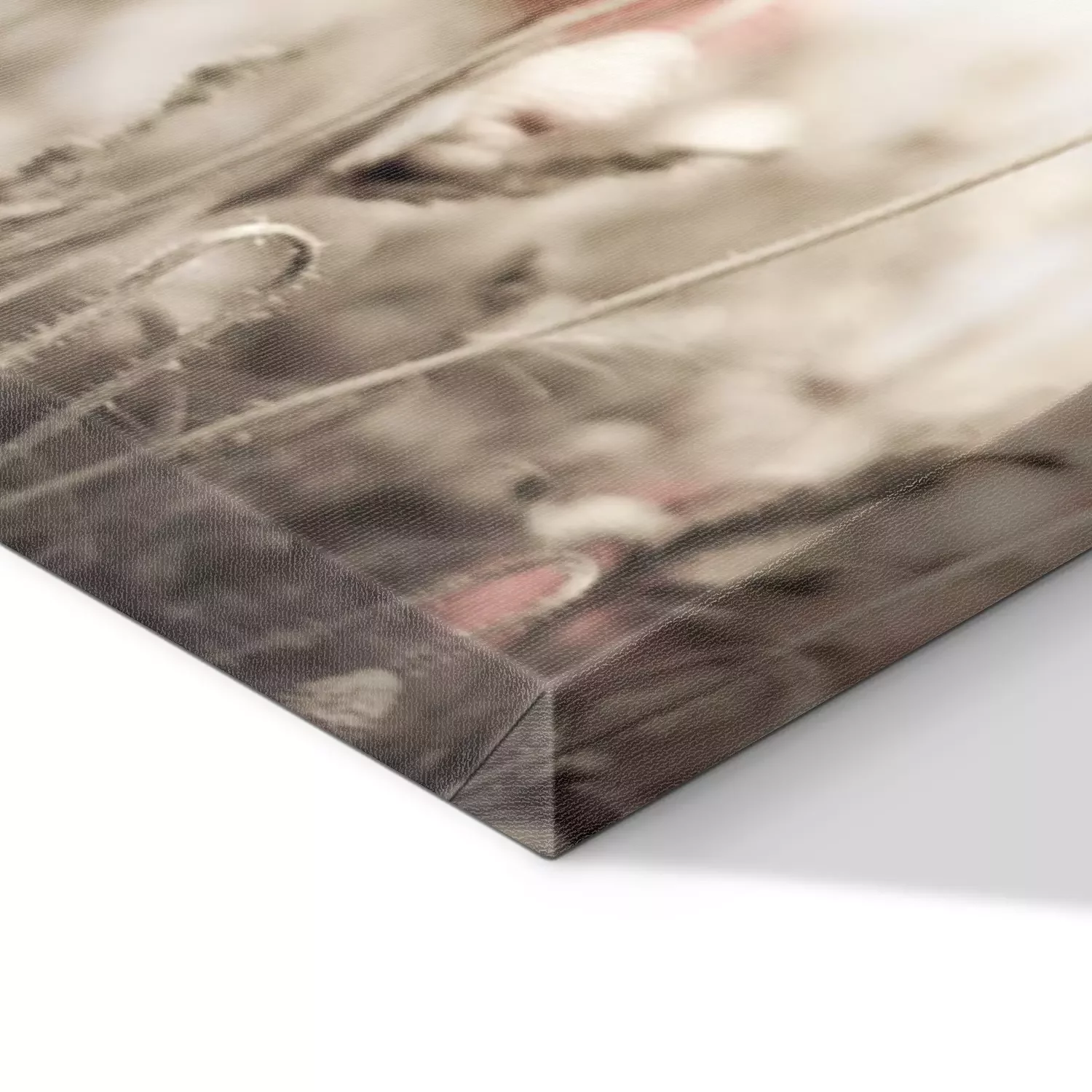 De print wordt aangebracht op hoogwaardig canvas dat op een schildersweefgetouw (spieraam) wordt gespannen. Omdat de print de zijranden bedekt, hoeft het ontwerp niet met een extra kader te worden omlijst. Wij raden ook composities aan die uit meerdere foto's bestaan en zo een coherente compositie vormen.