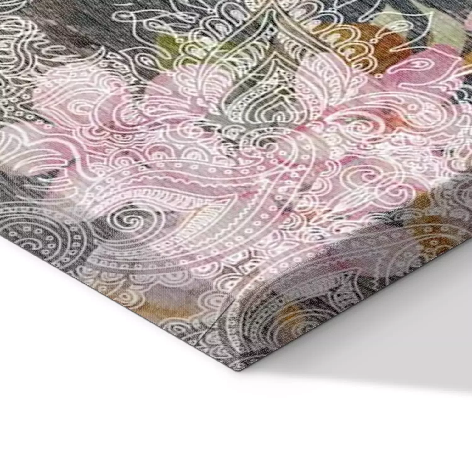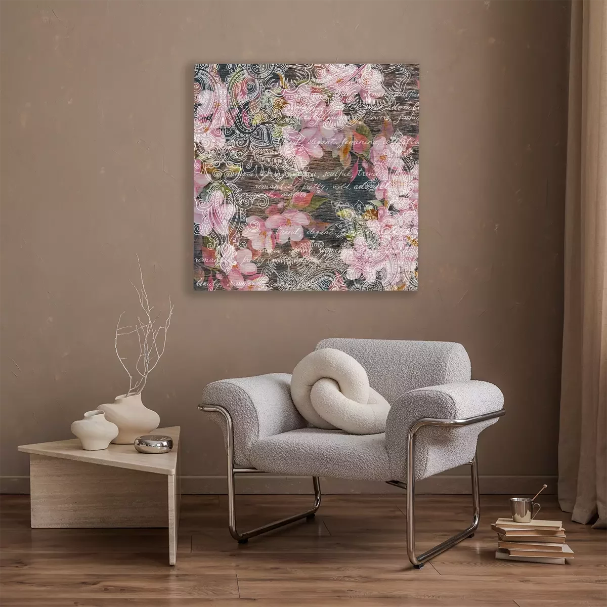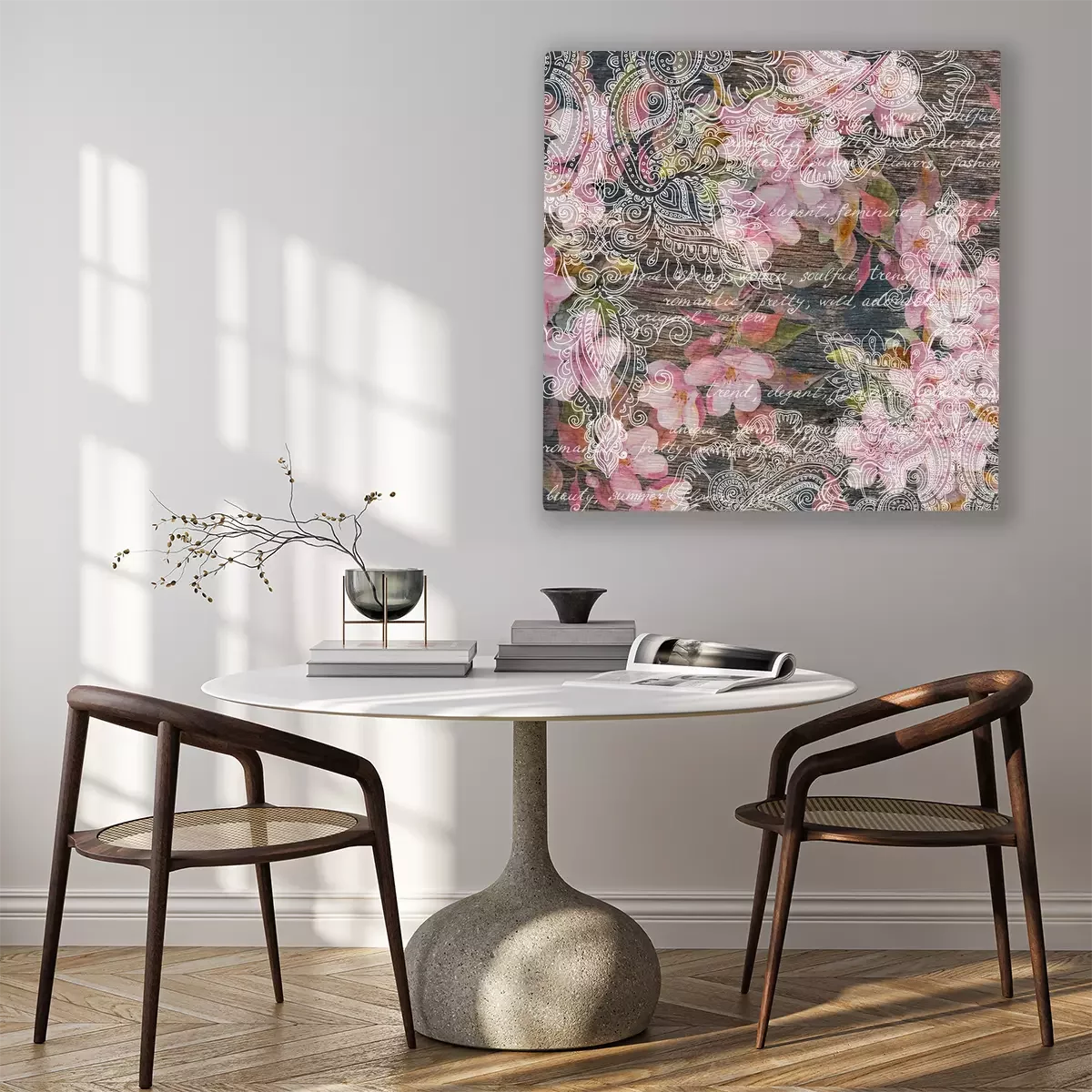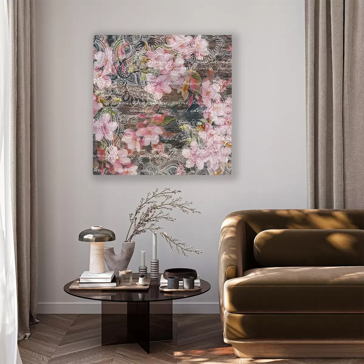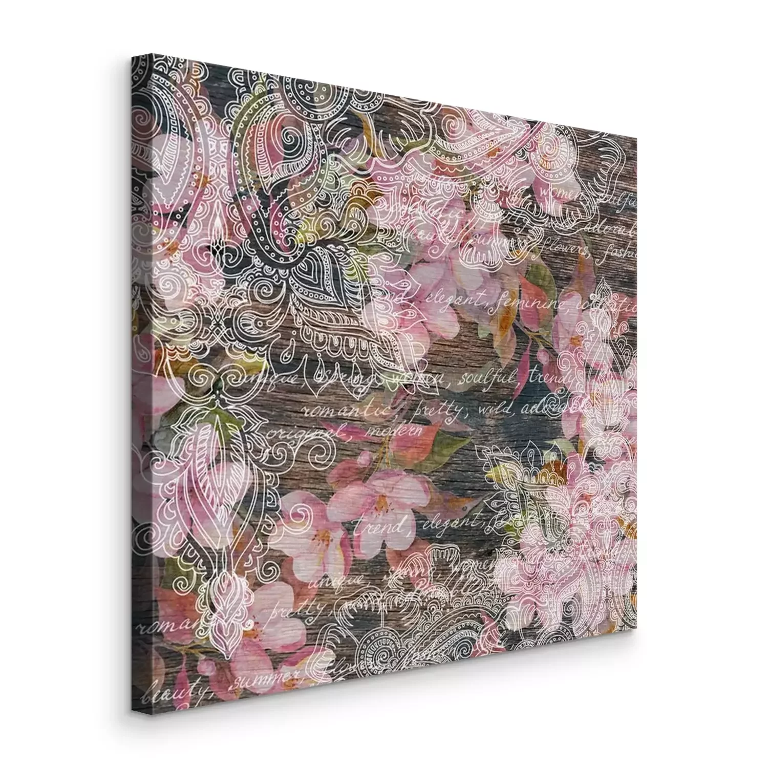 Canvas Bloemen, indian sierontwerp, houtstructuur. Aquarel, handgeschreven notitie