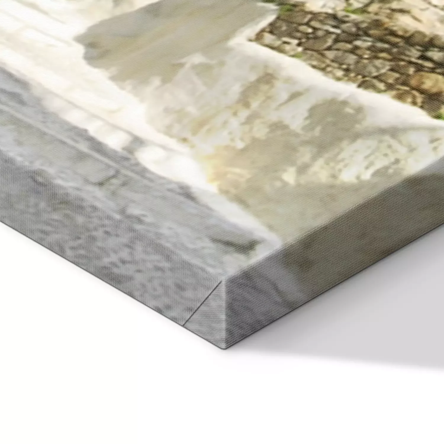 De print wordt aangebracht op hoogwaardig canvas dat op een schildersweefgetouw (spieraam) wordt gespannen. Omdat de print de zijranden bedekt, hoeft het ontwerp niet met een extra kader te worden omlijst. Wij raden ook composities aan die uit meerdere foto's bestaan en zo een coherente compositie vormen.