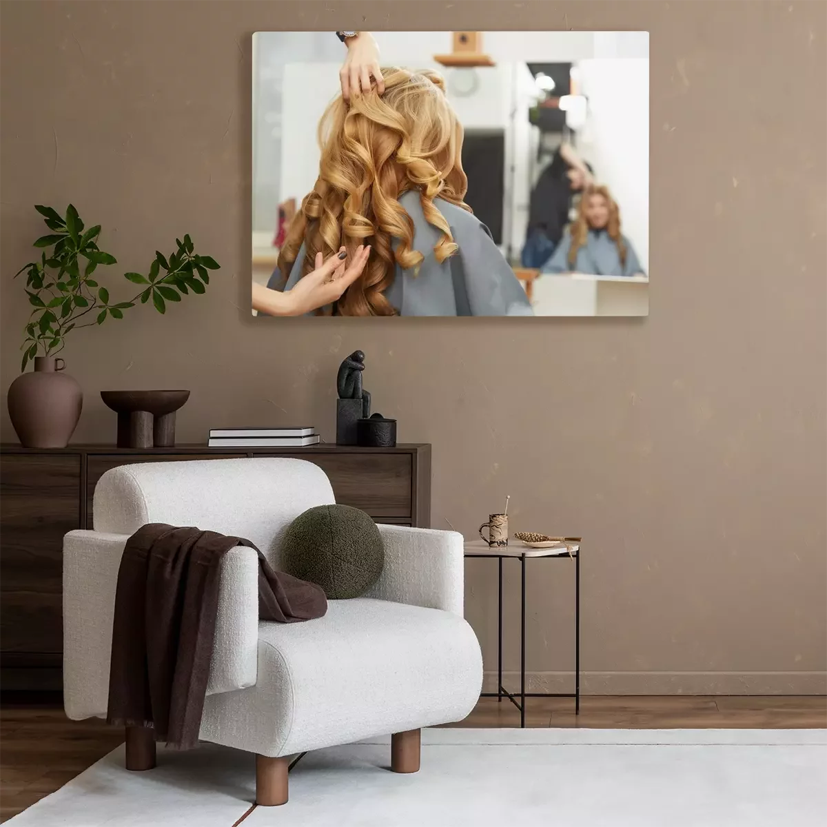 Canvas: Blond krullend haar. Kapsalon doet haarstijl voor jonge vrouw i