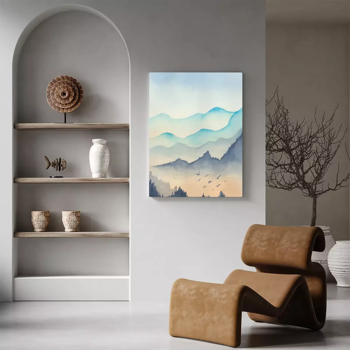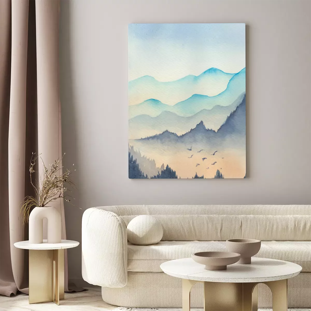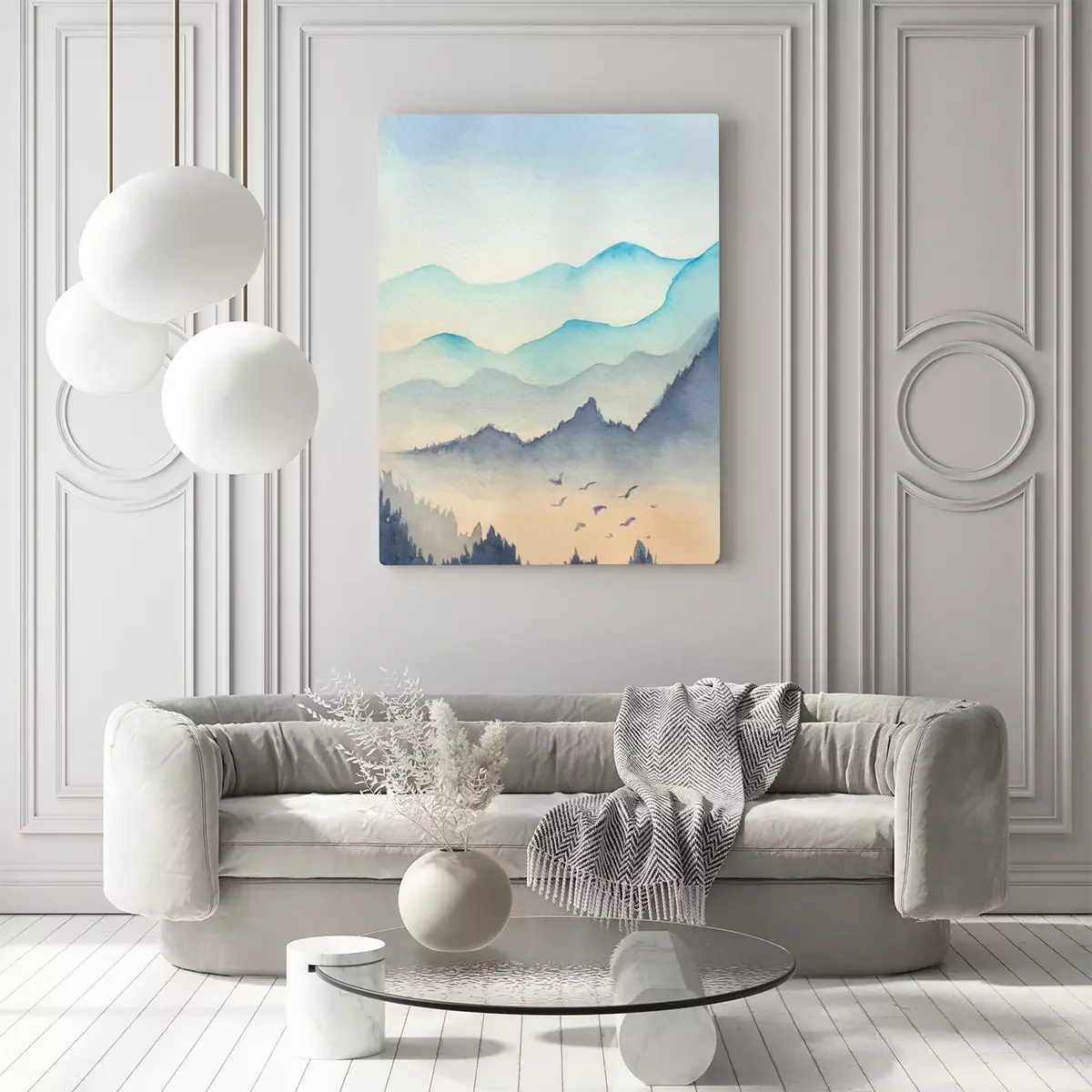 Canvas: Blue mountains landscape in the fog with bird