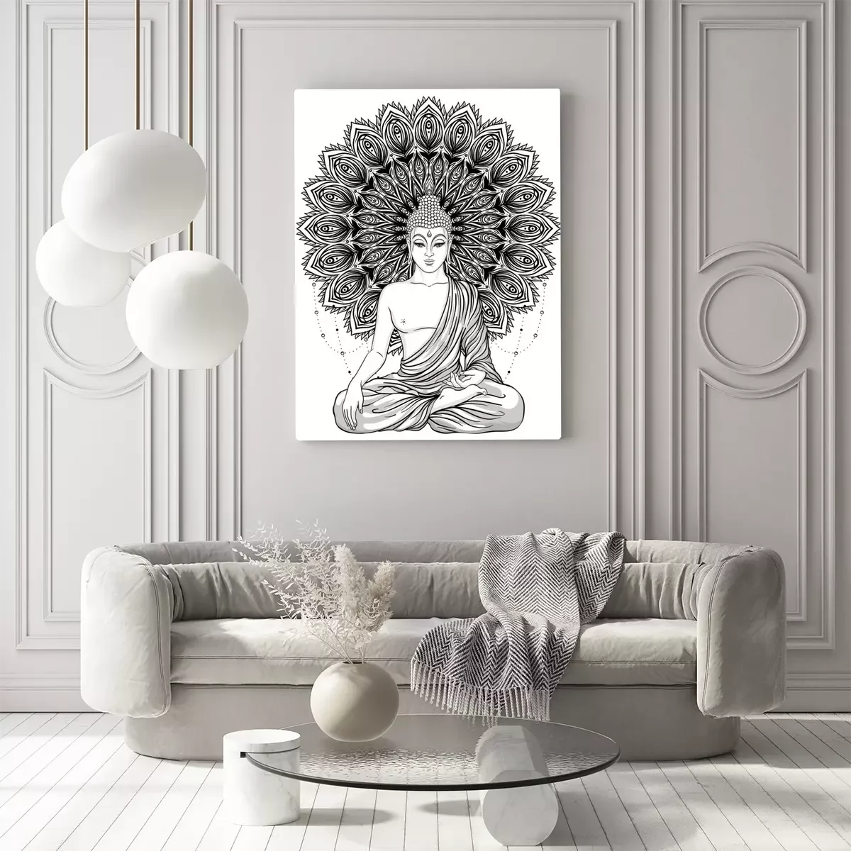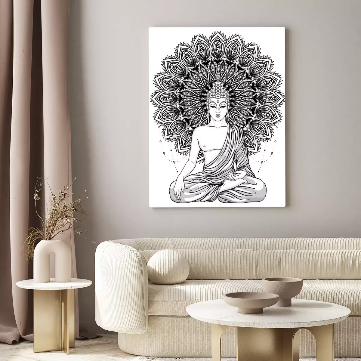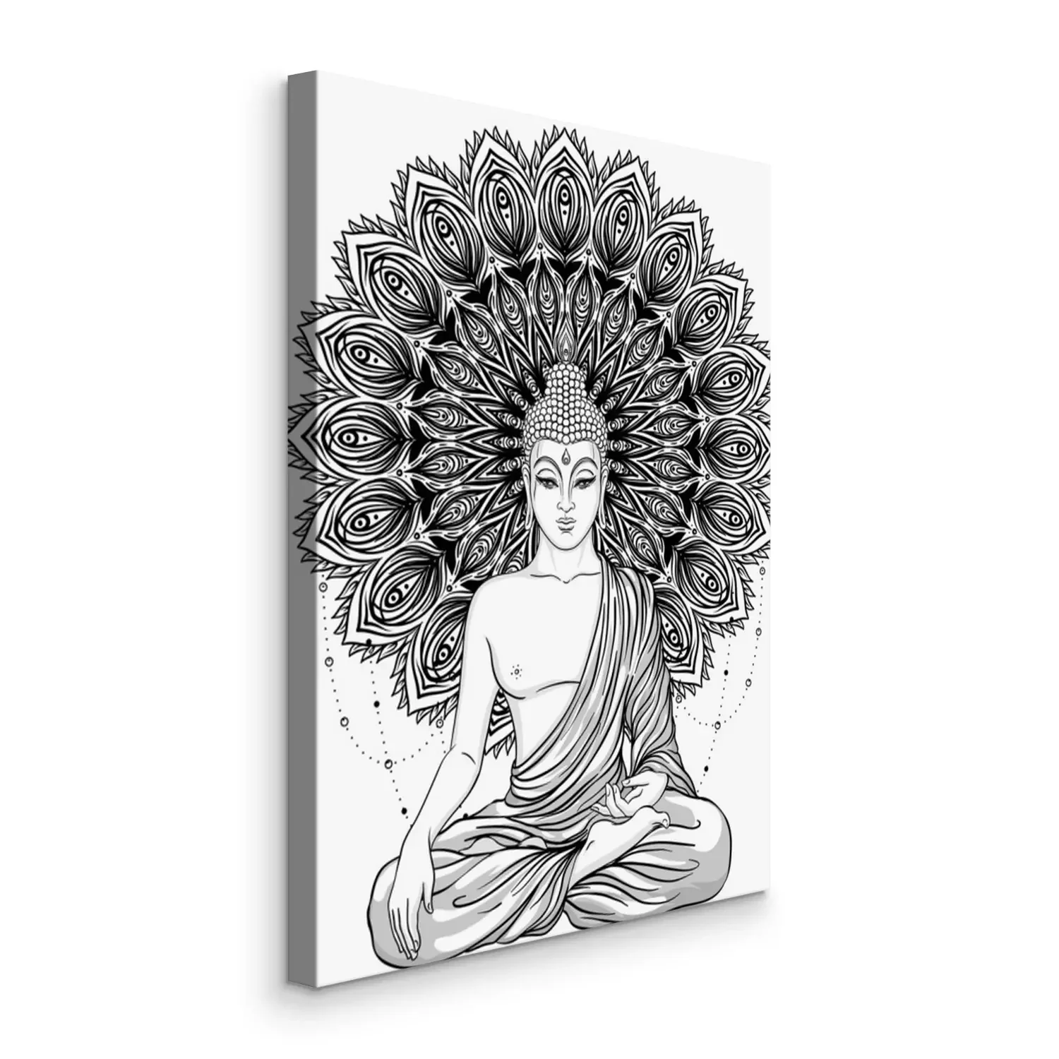 Canvas: Boeddha zitten over versierde roosbloem. Esoterische vintage vector illustratie. Indisch, Boeddhisme, geestelijke kunst. Hippie tattoo, spiritualiteit, Thaise god, yoga zen