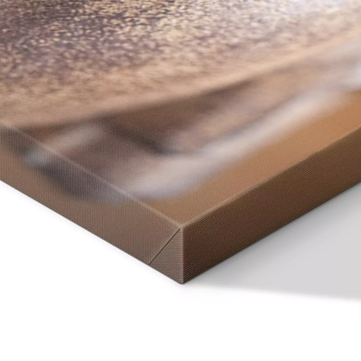 De print wordt aangebracht op hoogwaardig canvas dat op een schildersweefgetouw (spieraam) wordt gespannen. Omdat de print de zijranden bedekt, hoeft het ontwerp niet met een extra kader te worden omlijst. Wij raden ook composities aan die uit meerdere foto's bestaan en zo een coherente compositie vormen.