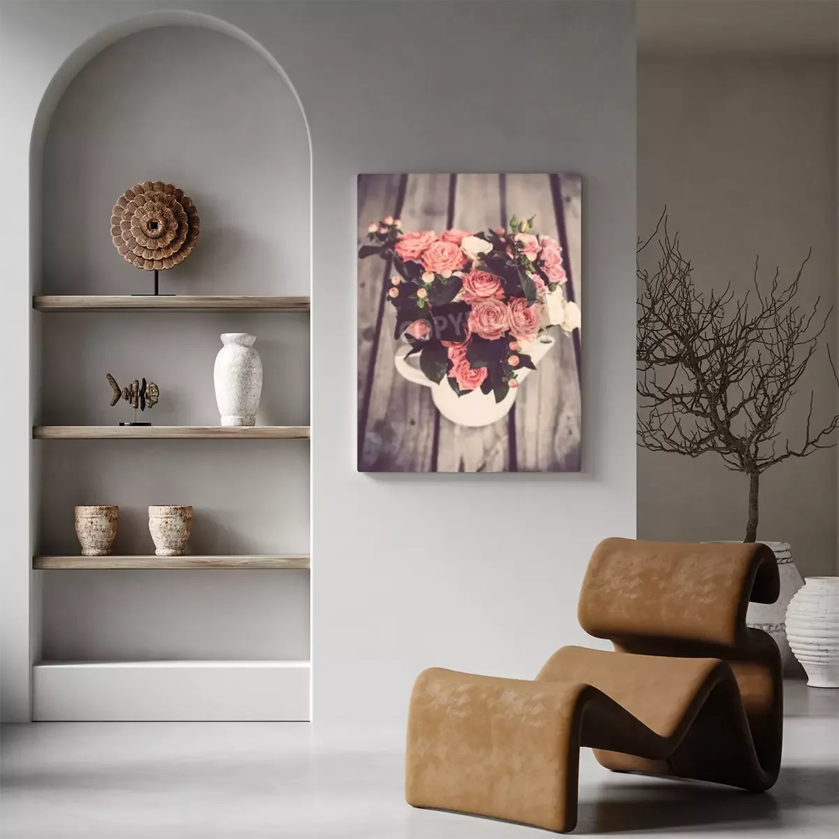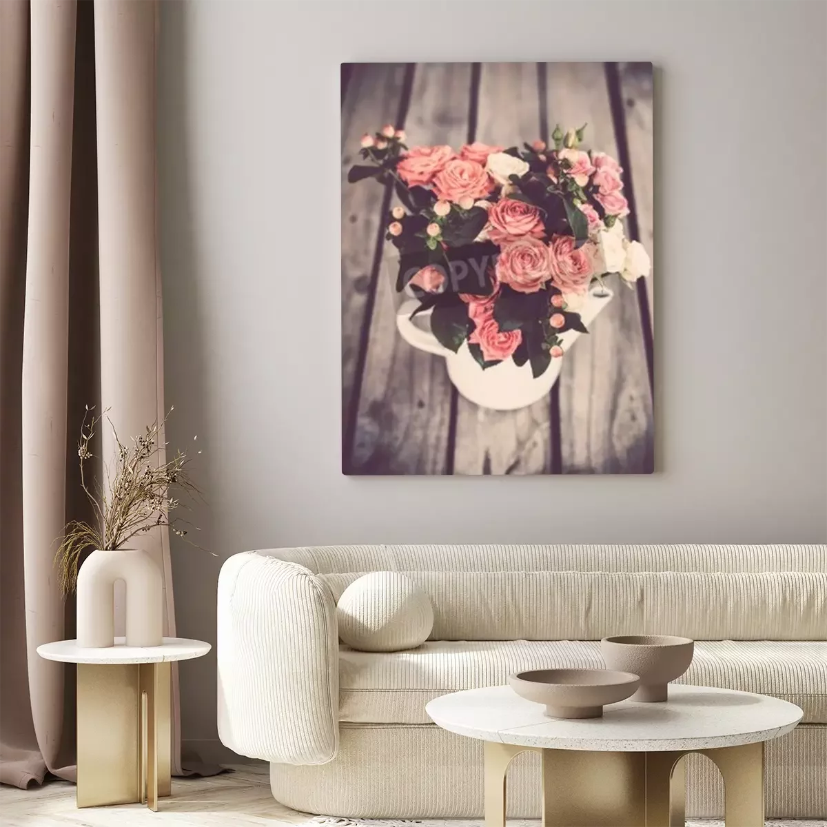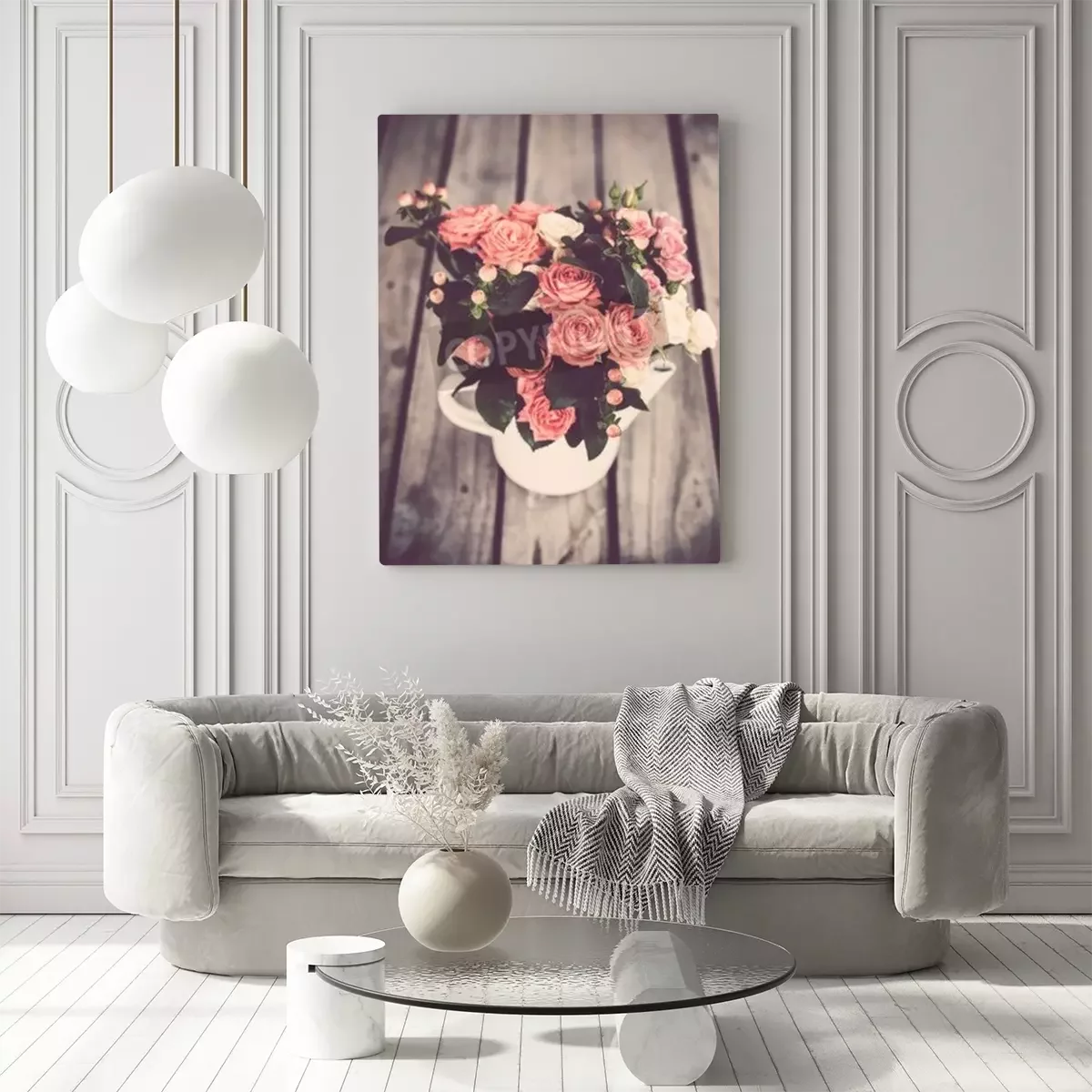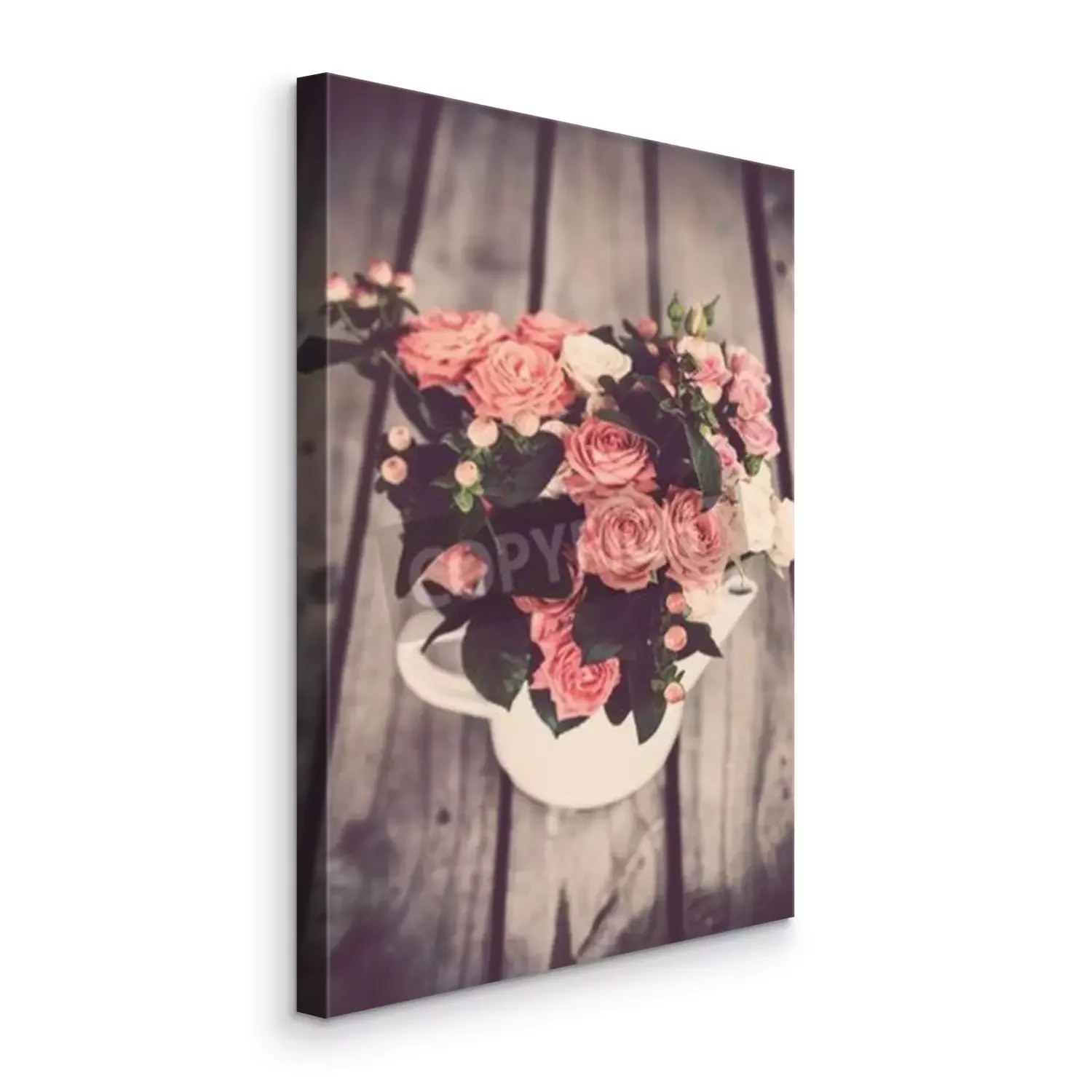 Canvas: Boeket van roze en beige rozen in vintage glazuur koffiepot op oude houten schuurbord achtergrond. Rustieke bloemen met kopie ruimte.