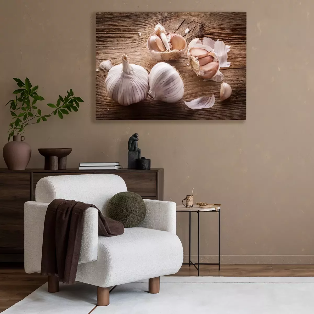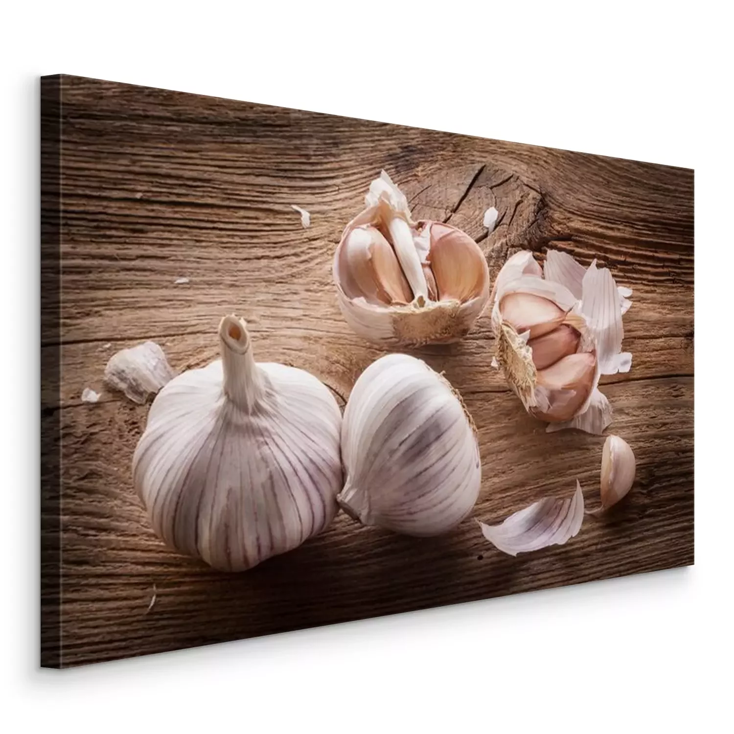 Canvas: Bollen knoflook en kruidnagel op een houten tafel, close-up