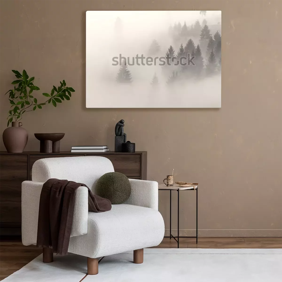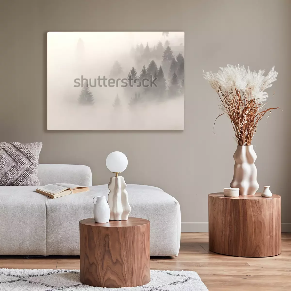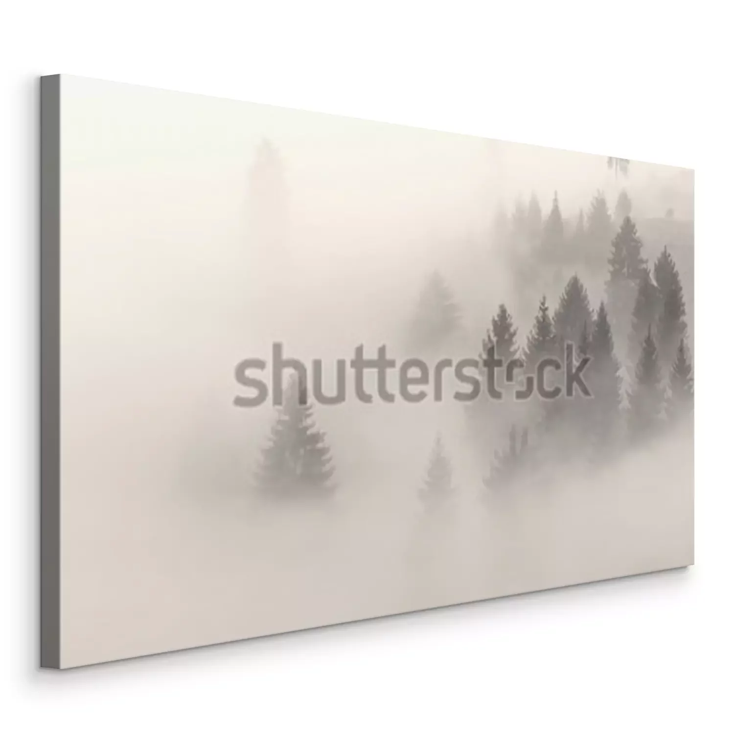 Canvas: Bomen in de mist tegen de achtergrond van de zon