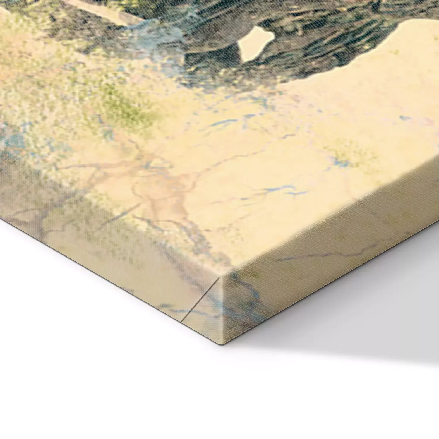 De print wordt aangebracht op hoogwaardig canvas dat op een schildersweefgetouw (spieraam) wordt gespannen. Omdat de print de zijranden bedekt, hoeft het ontwerp niet met een extra kader te worden omlijst. Wij raden ook composities aan die uit meerdere foto's bestaan en zo een coherente compositie vormen.