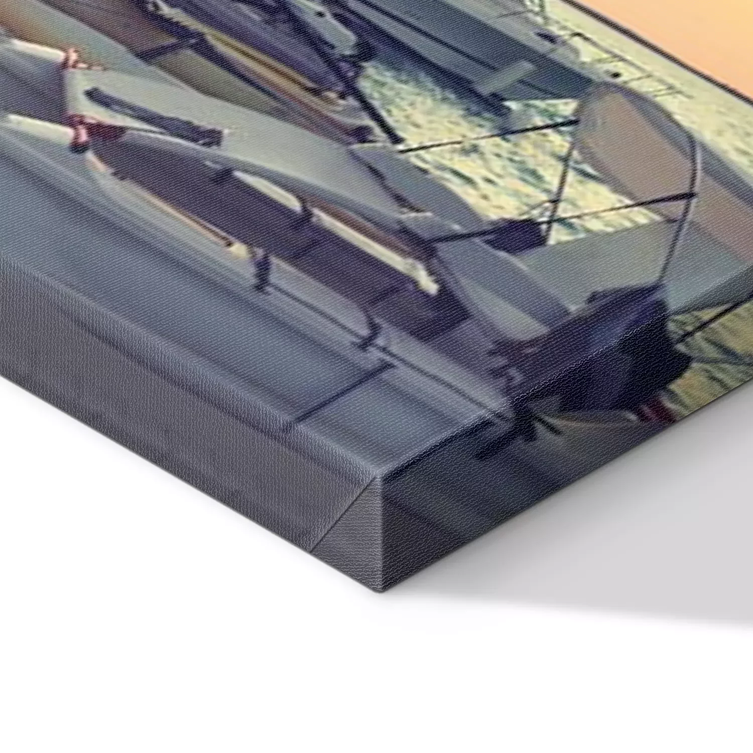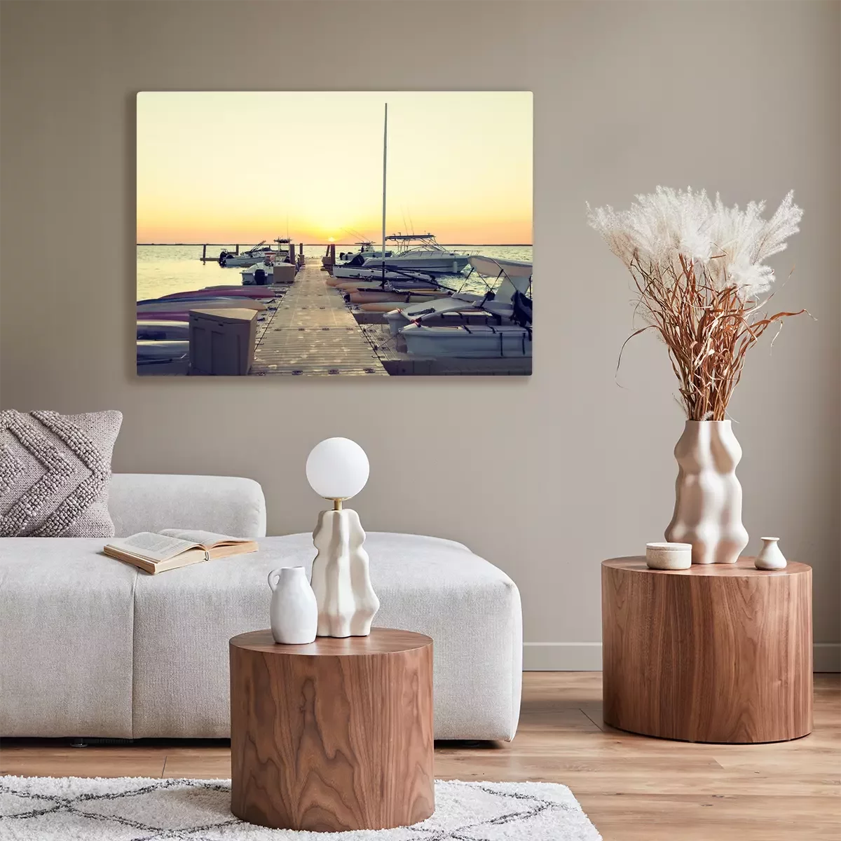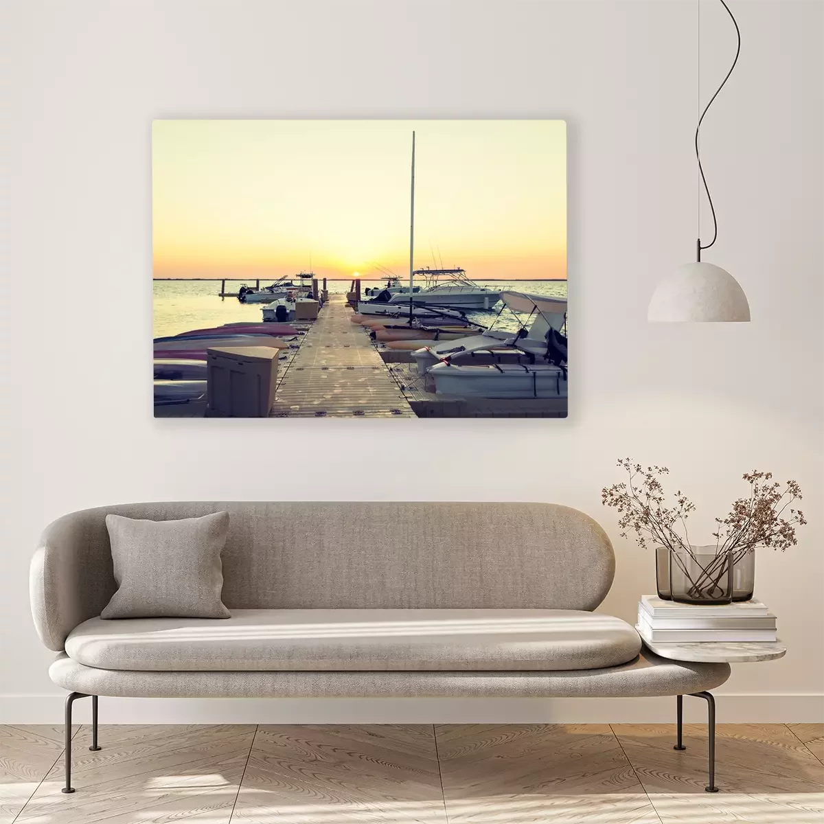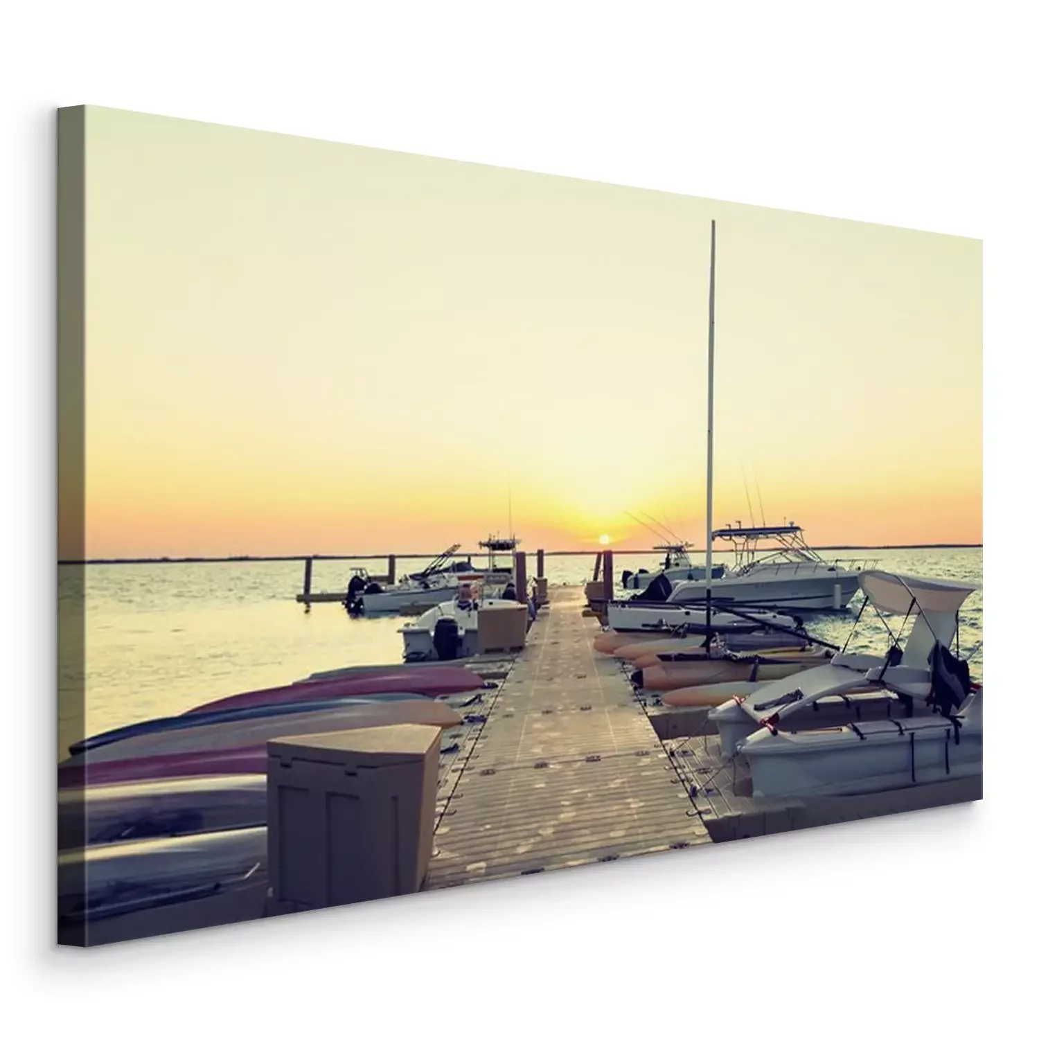Canvas: boten afgemeerd aan de pier bij zonsondergang