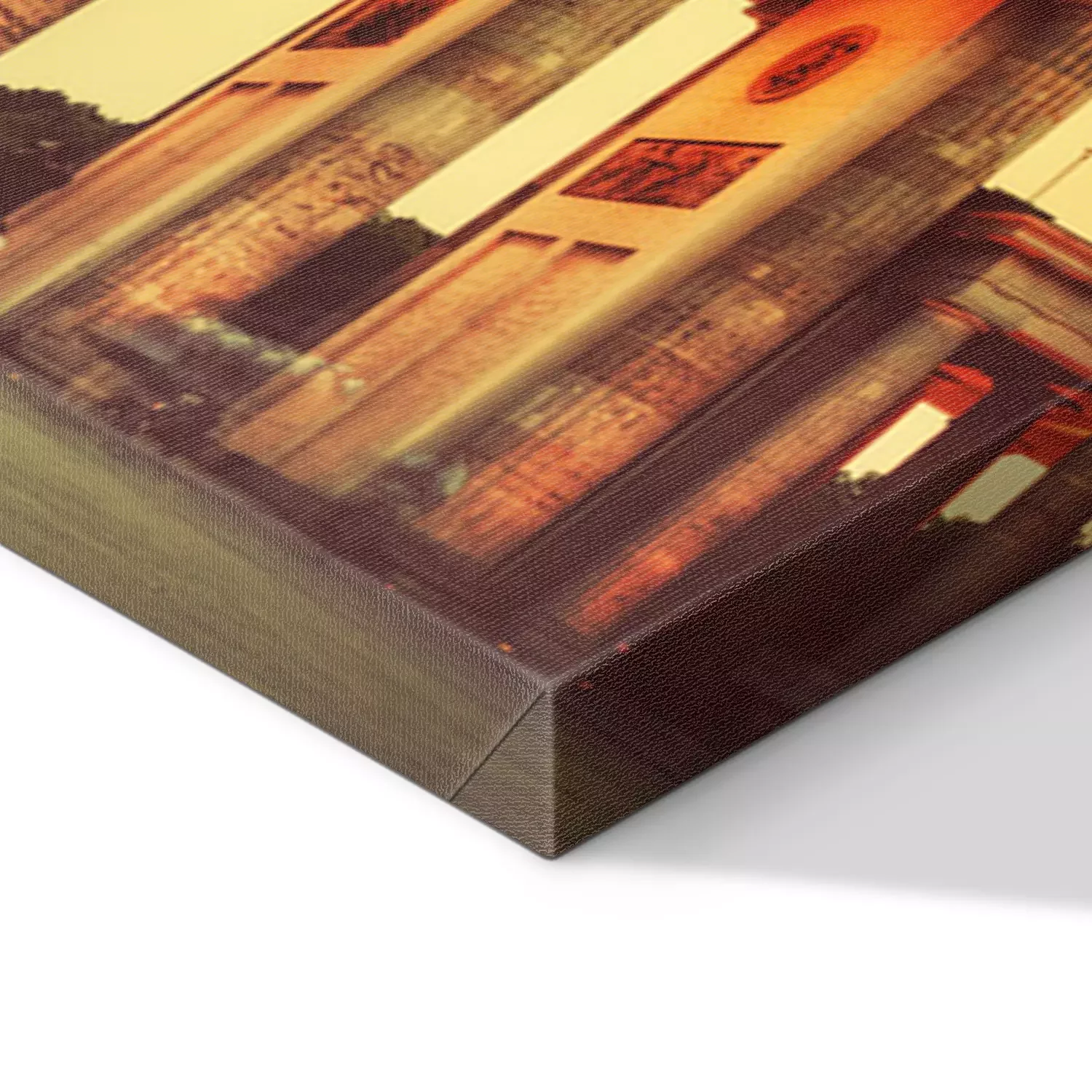 De print wordt aangebracht op hoogwaardig canvas dat op een schildersweefgetouw (spieraam) wordt gespannen. Omdat de print de zijranden bedekt, hoeft het ontwerp niet met een extra kader te worden omlijst. Wij raden ook composities aan die uit meerdere foto's bestaan en zo een coherente compositie vormen.