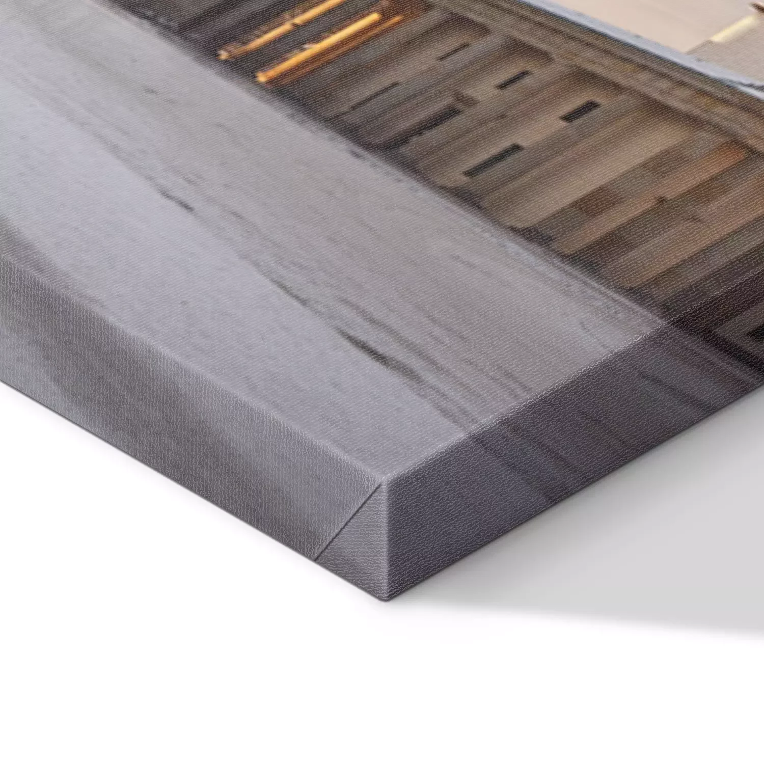 De print wordt aangebracht op hoogwaardig canvas dat op een schildersweefgetouw (spieraam) wordt gespannen. Omdat de print de zijranden bedekt, hoeft het ontwerp niet met een extra kader te worden omlijst. Wij raden ook composities aan die uit meerdere foto's bestaan en zo een coherente compositie vormen.