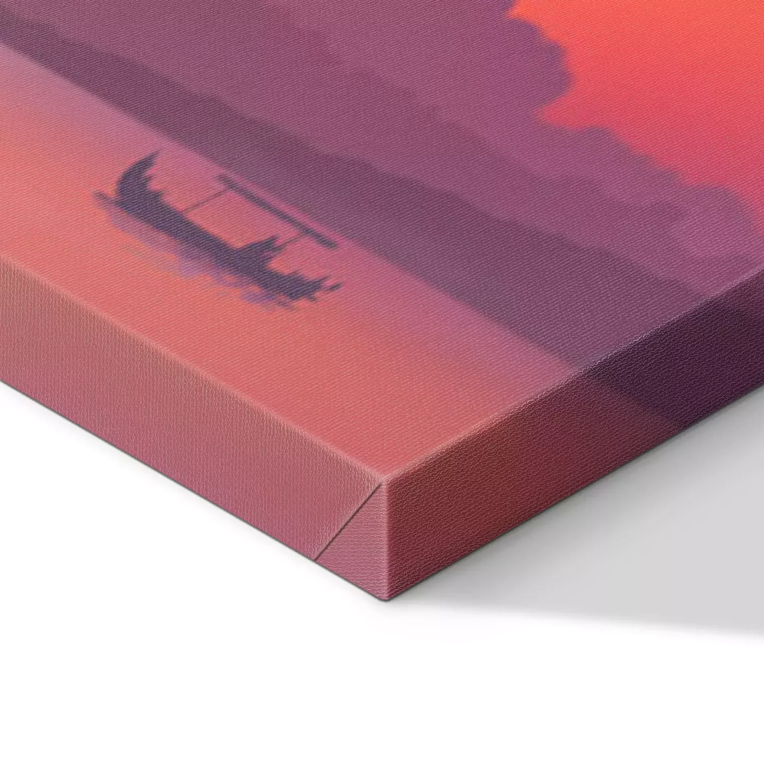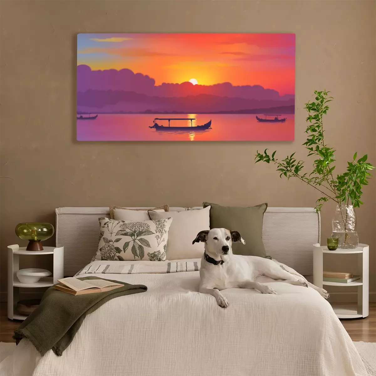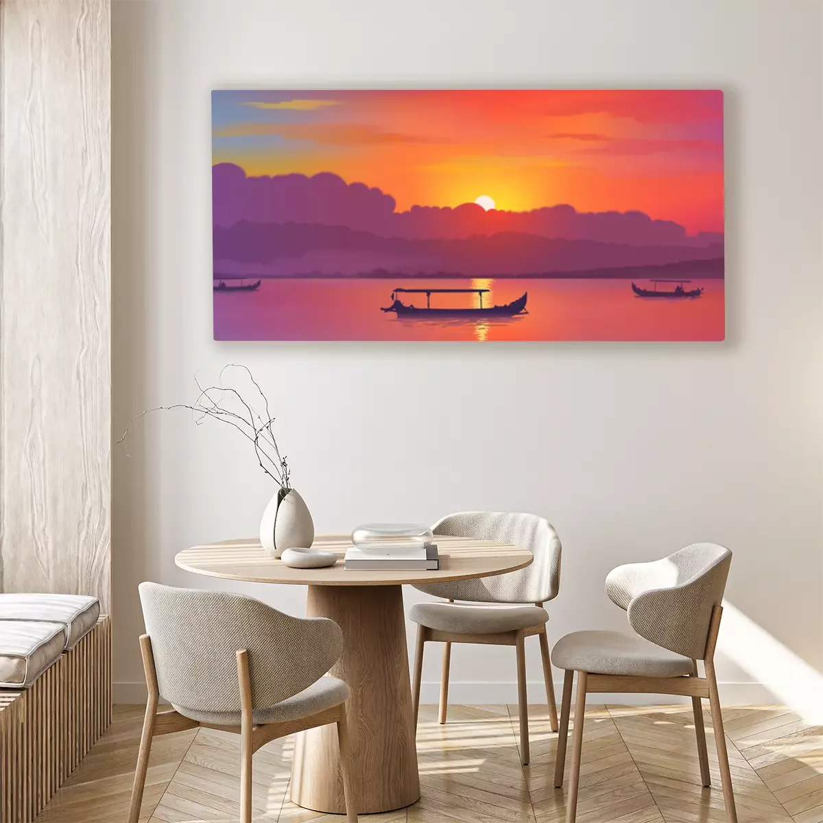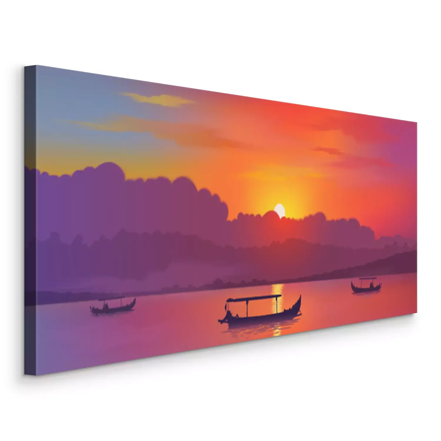 Canvas: Bright colors sunset sky with sun reflection in lake with traditional fisherman asian boats silhouettes, vector banner illustration