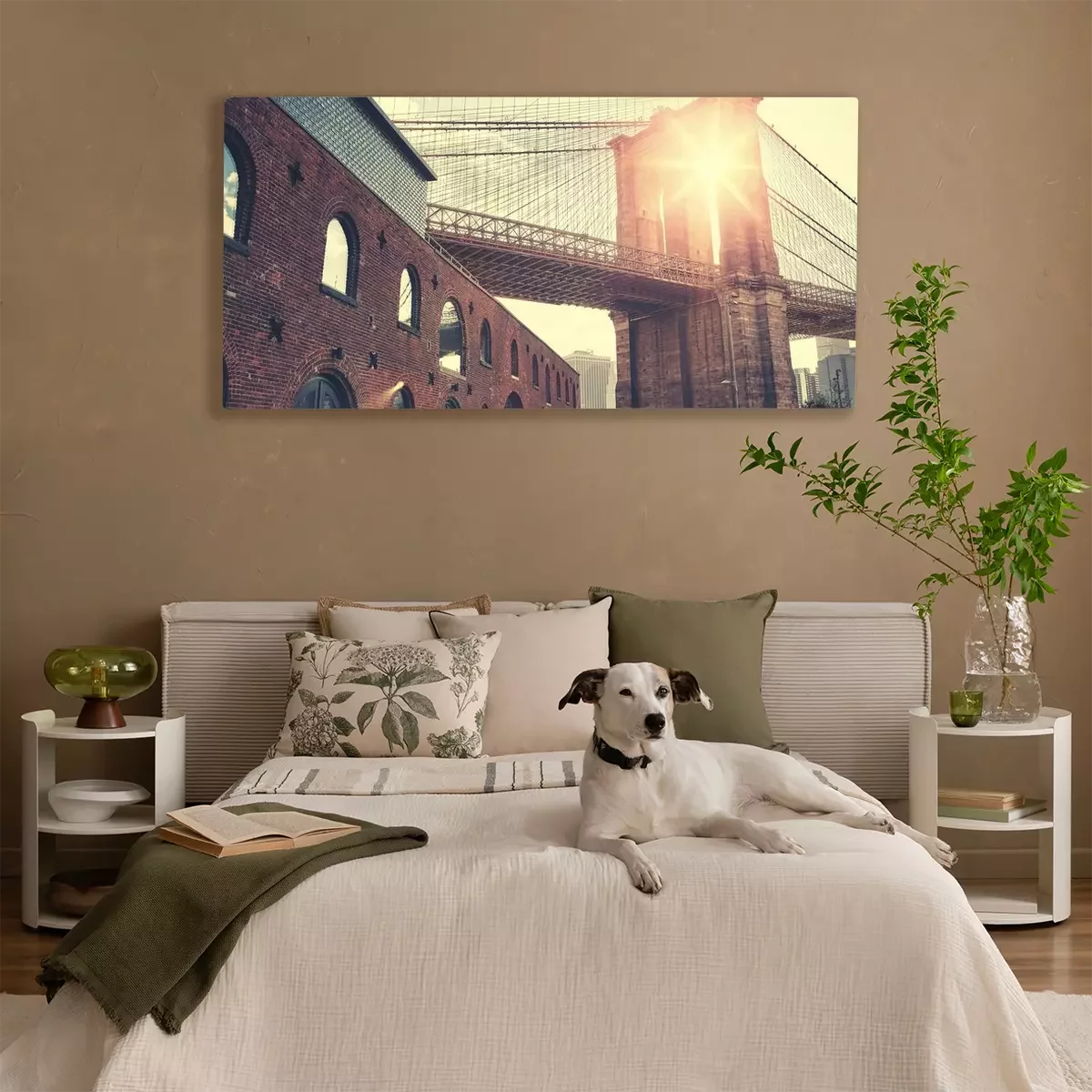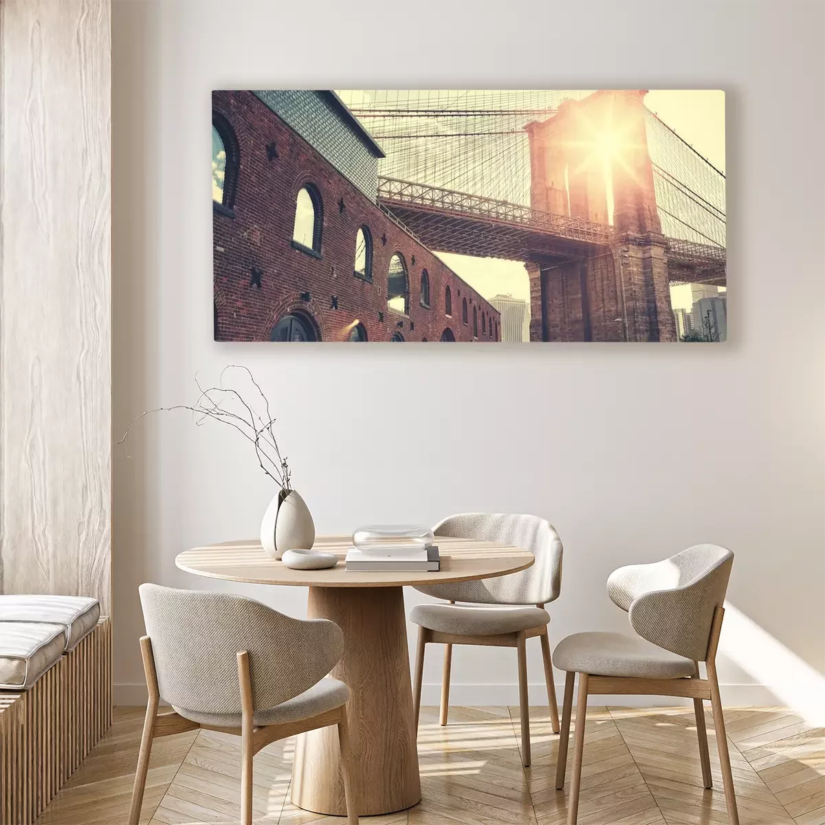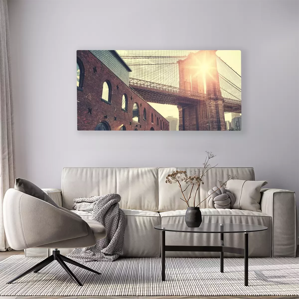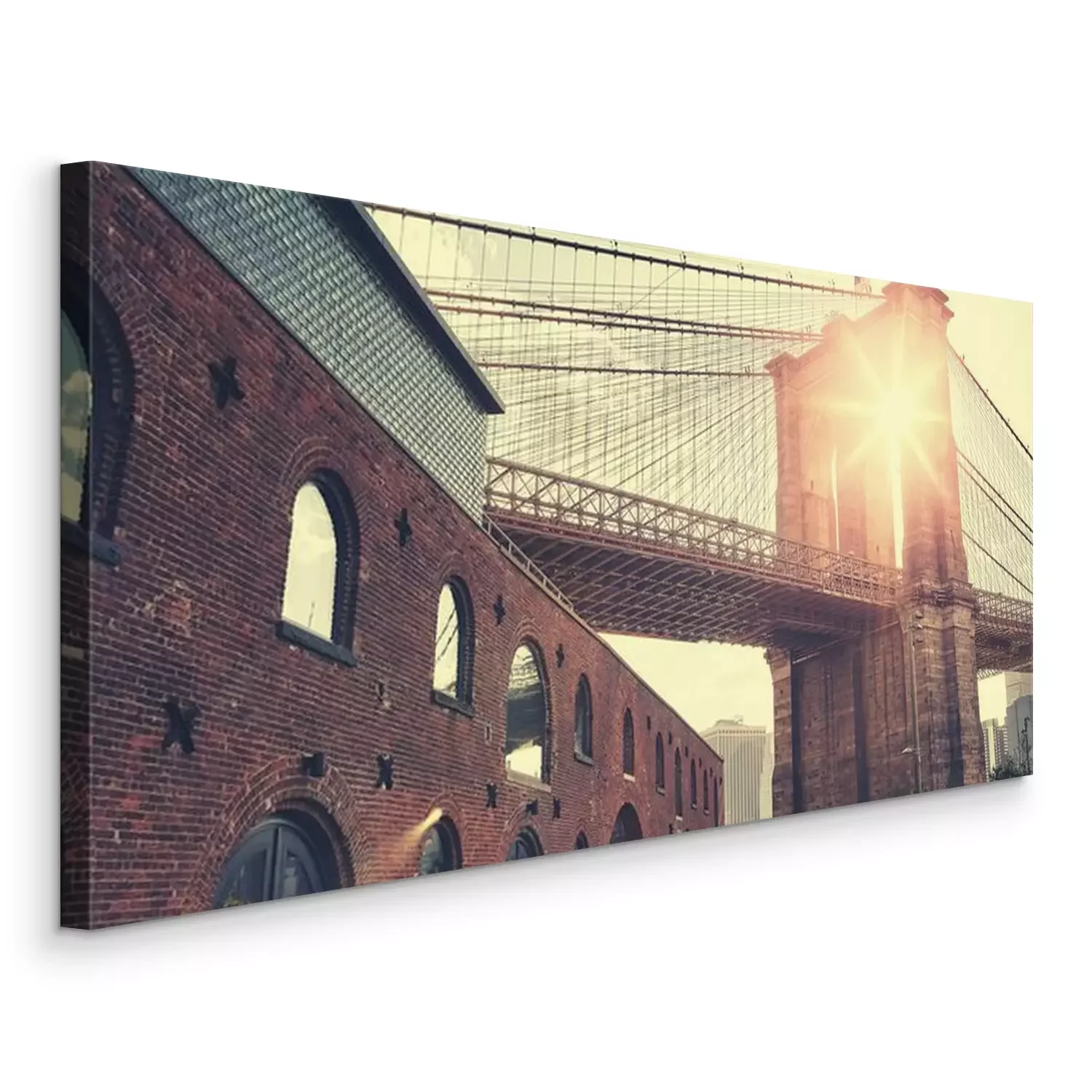 Canvas: Brooklyn Bridge bij zonsondergang met lens flare, kleur toning toegepast, New York City, USA.