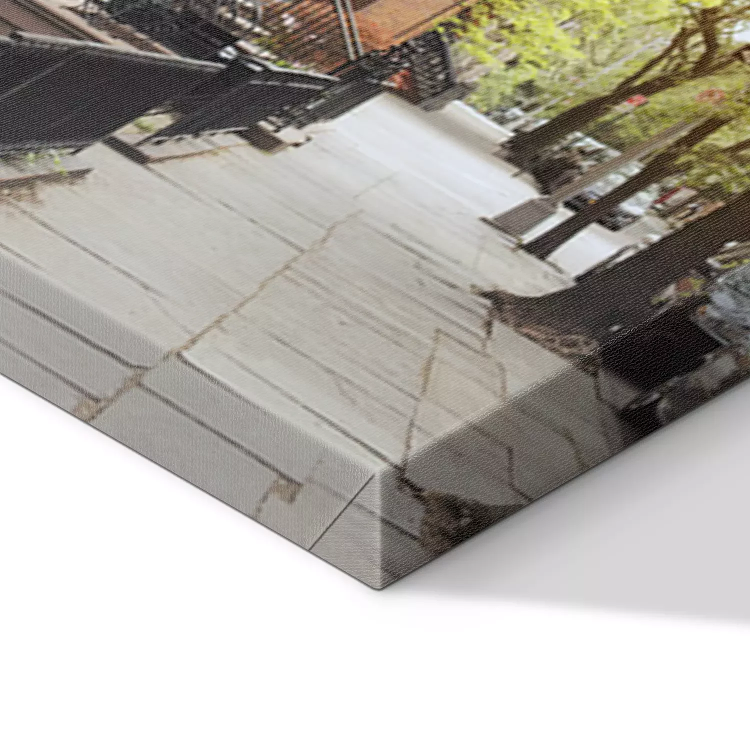 De print wordt aangebracht op hoogwaardig canvas dat op een schildersweefgetouw (spieraam) wordt gespannen. Omdat de print de zijranden bedekt, hoeft het ontwerp niet met een extra kader te worden omlijst. Wij raden ook composities aan die uit meerdere foto's bestaan en zo een coherente compositie vormen.