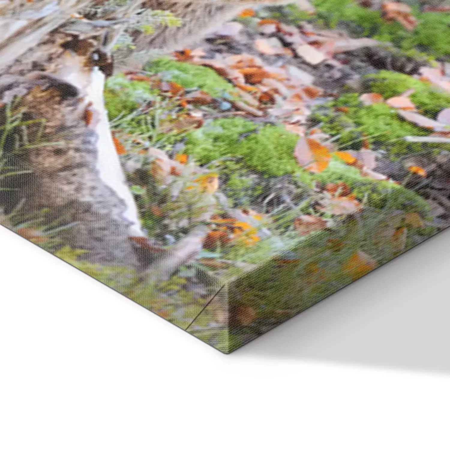 De print wordt aangebracht op hoogwaardig canvas dat op een schildersweefgetouw (spieraam) wordt gespannen. Omdat de print de zijranden bedekt, hoeft het ontwerp niet met een extra kader te worden omlijst. Wij raden ook composities aan die uit meerdere foto's bestaan en zo een coherente compositie vormen.