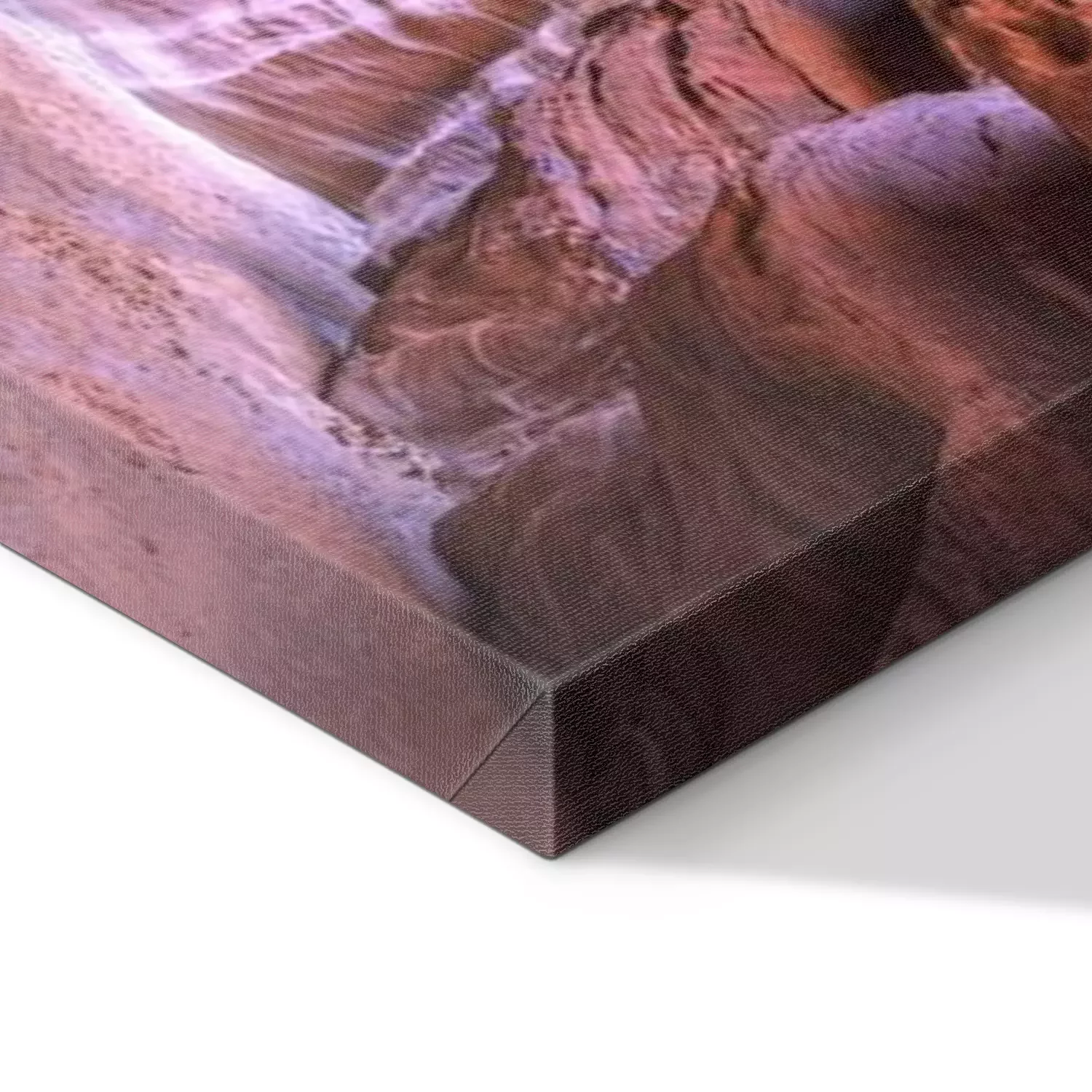De print wordt aangebracht op hoogwaardig canvas dat op een schildersweefgetouw (spieraam) wordt gespannen. Omdat de print de zijranden bedekt, hoeft het ontwerp niet met een extra kader te worden omlijst. Wij raden ook composities aan die uit meerdere foto's bestaan en zo een coherente compositie vormen.