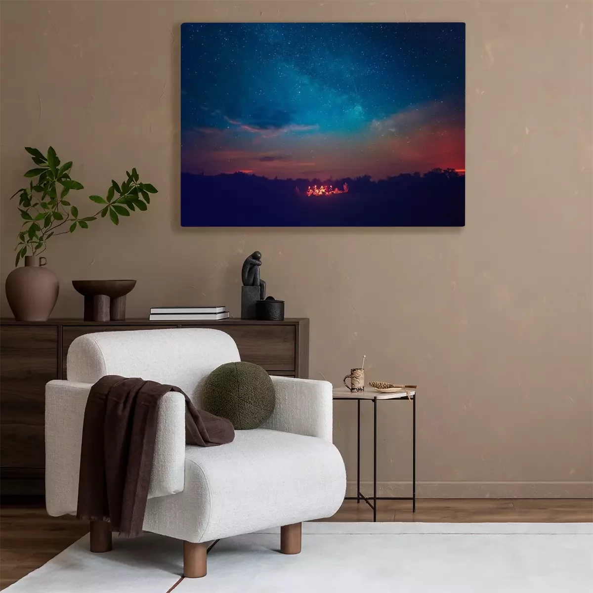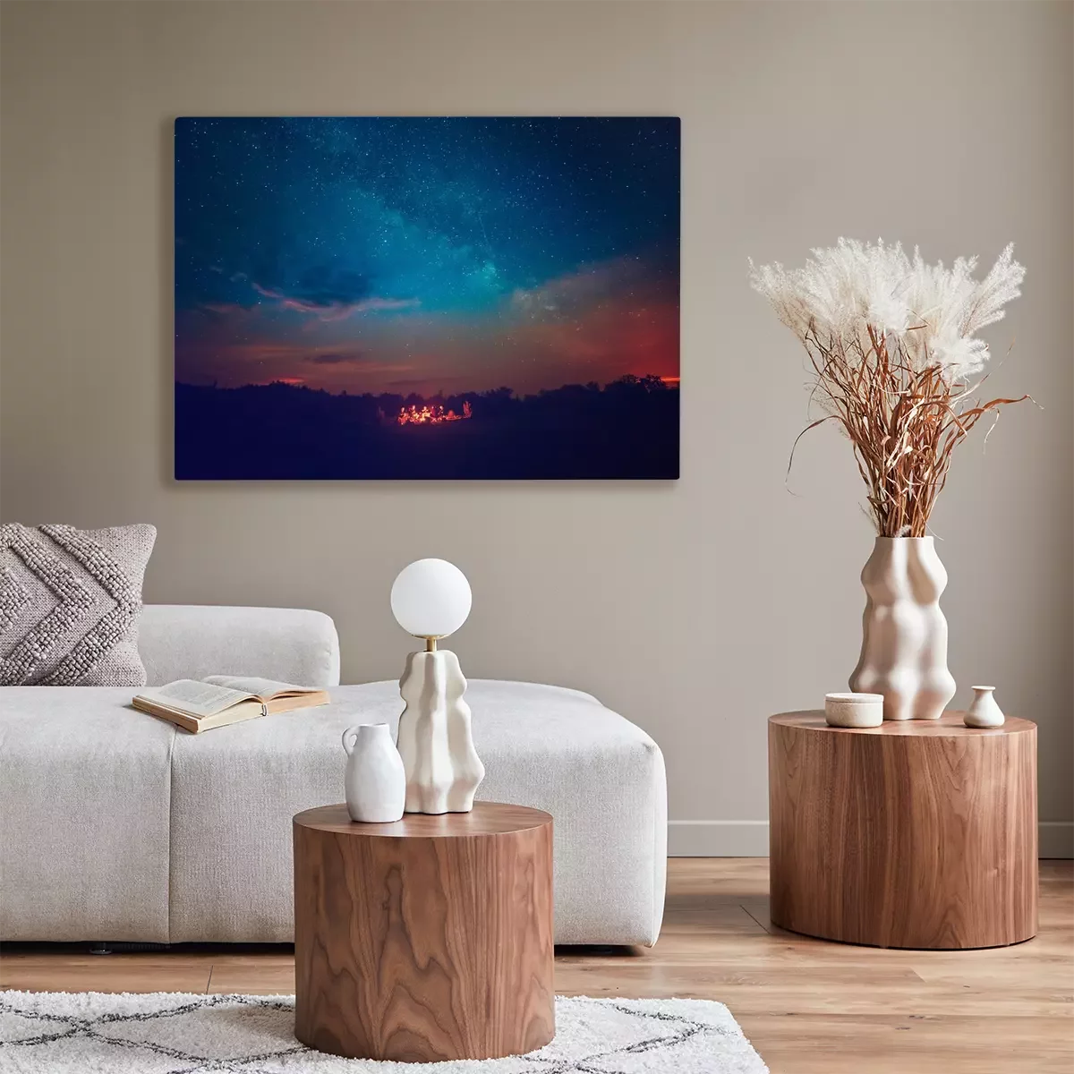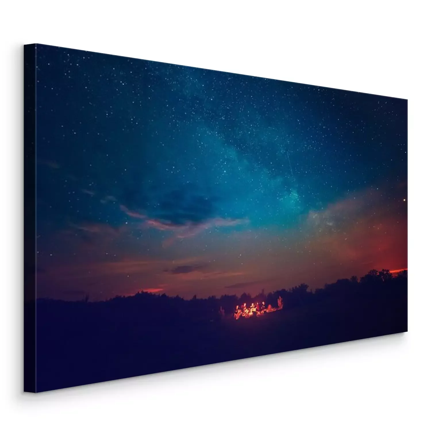 Canvas: Camping vuur onder de prachtige blauwe sterrenhemel met veel glinsterende sterren en wolken. Reis recreatieve outdoor activiteit concept.