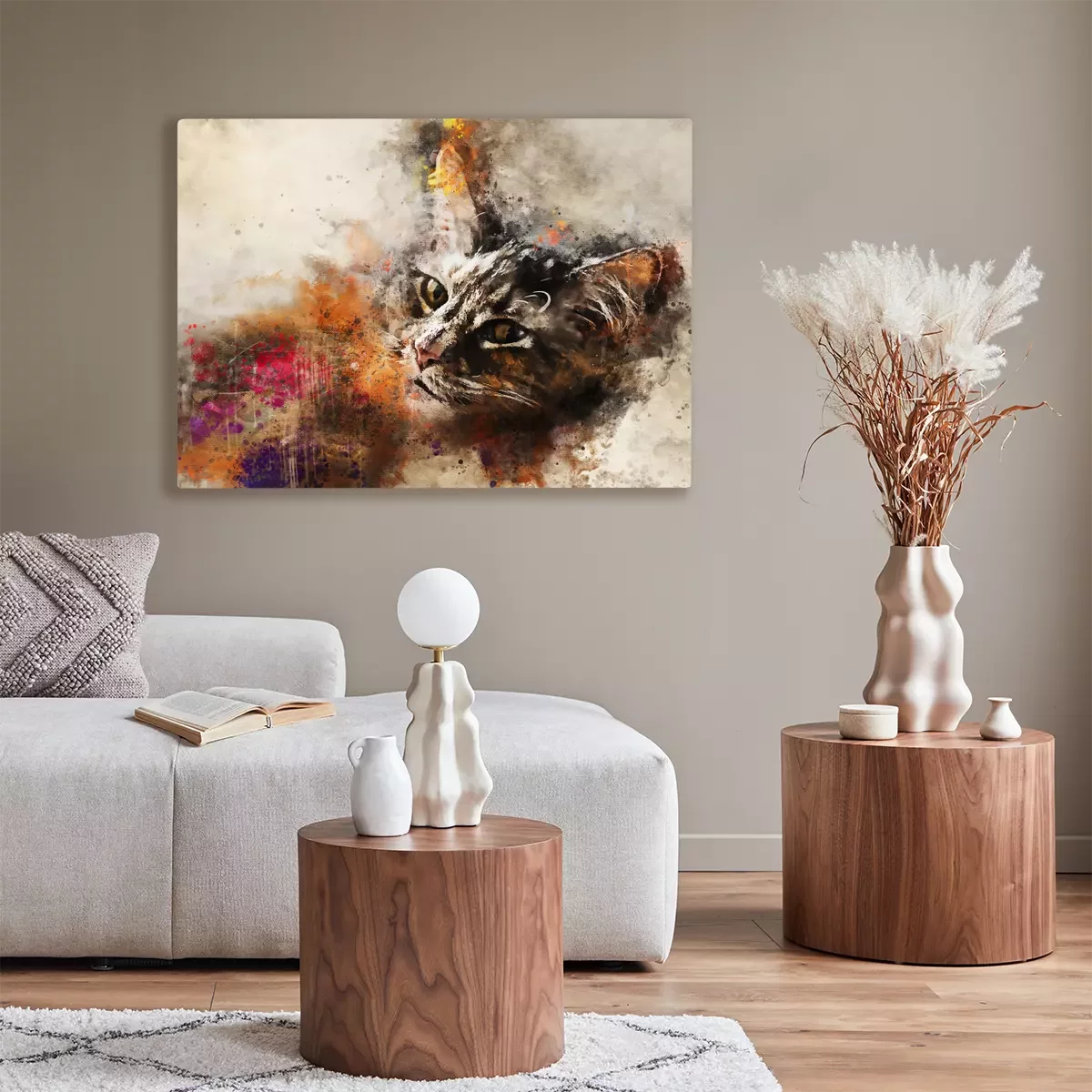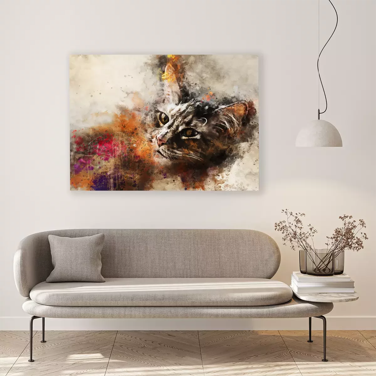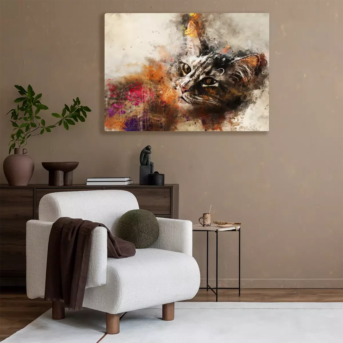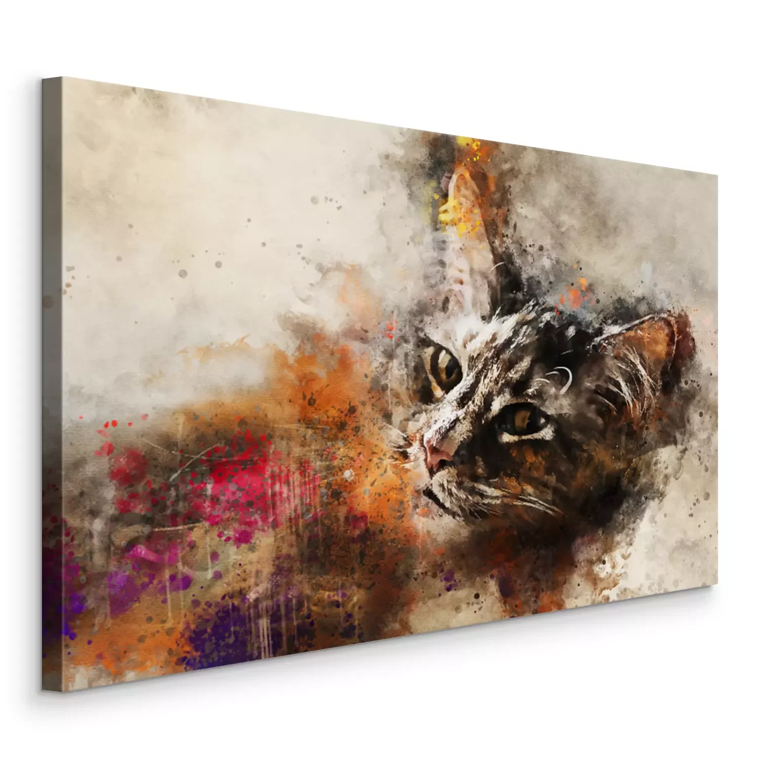 Canvas: Cat kunst. Mooi abstract kattenkunstwerk - waterverftekening, gemengde media. Het gezicht van een kat in een eigentijdse stijl van abstracte kunst.