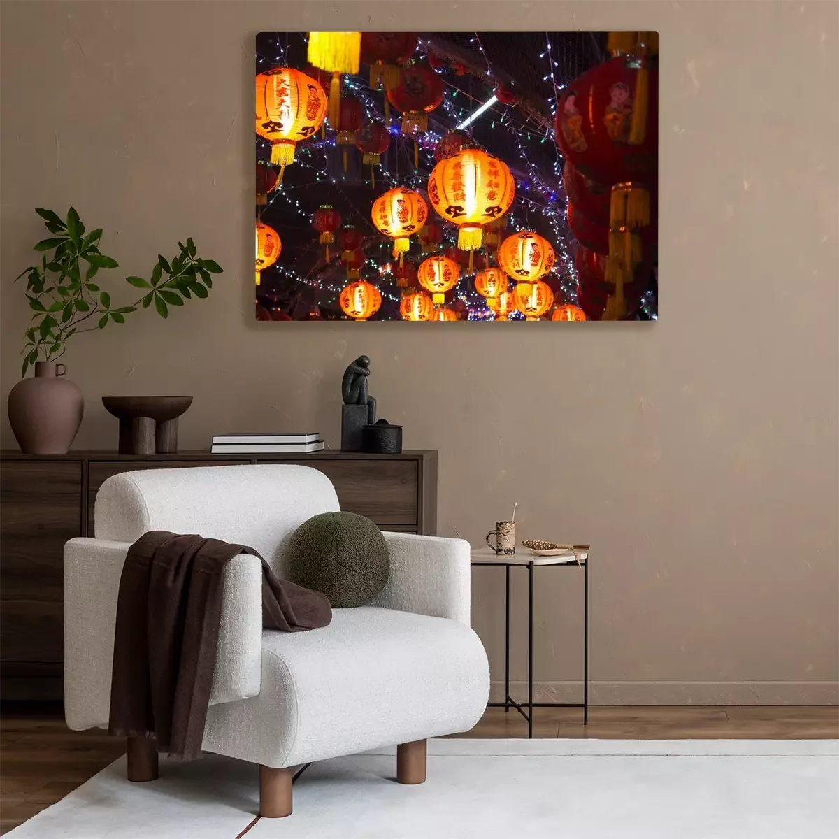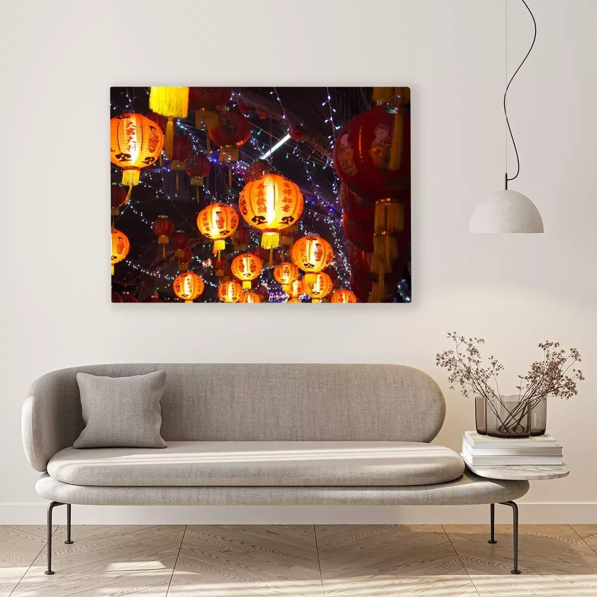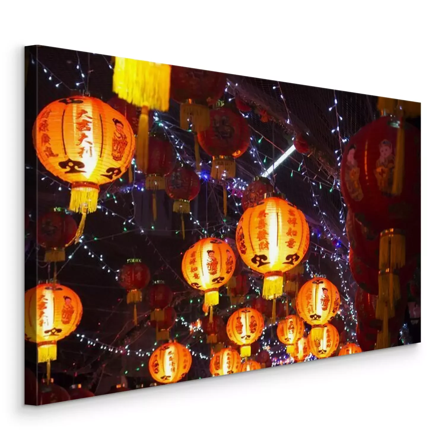 Canvas: Chinese lantaarns 's nachts, Chinees Nieuwjaar decoraties (tekst betekent veel geluk)