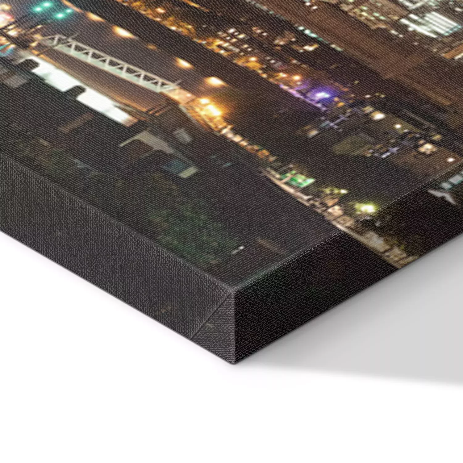 De print wordt aangebracht op hoogwaardig canvas dat op een schildersweefgetouw (spieraam) wordt gespannen. Omdat de print de zijranden bedekt, hoeft het ontwerp niet met een extra kader te worden omlijst. Wij raden ook composities aan die uit meerdere foto's bestaan en zo een coherente compositie vormen.