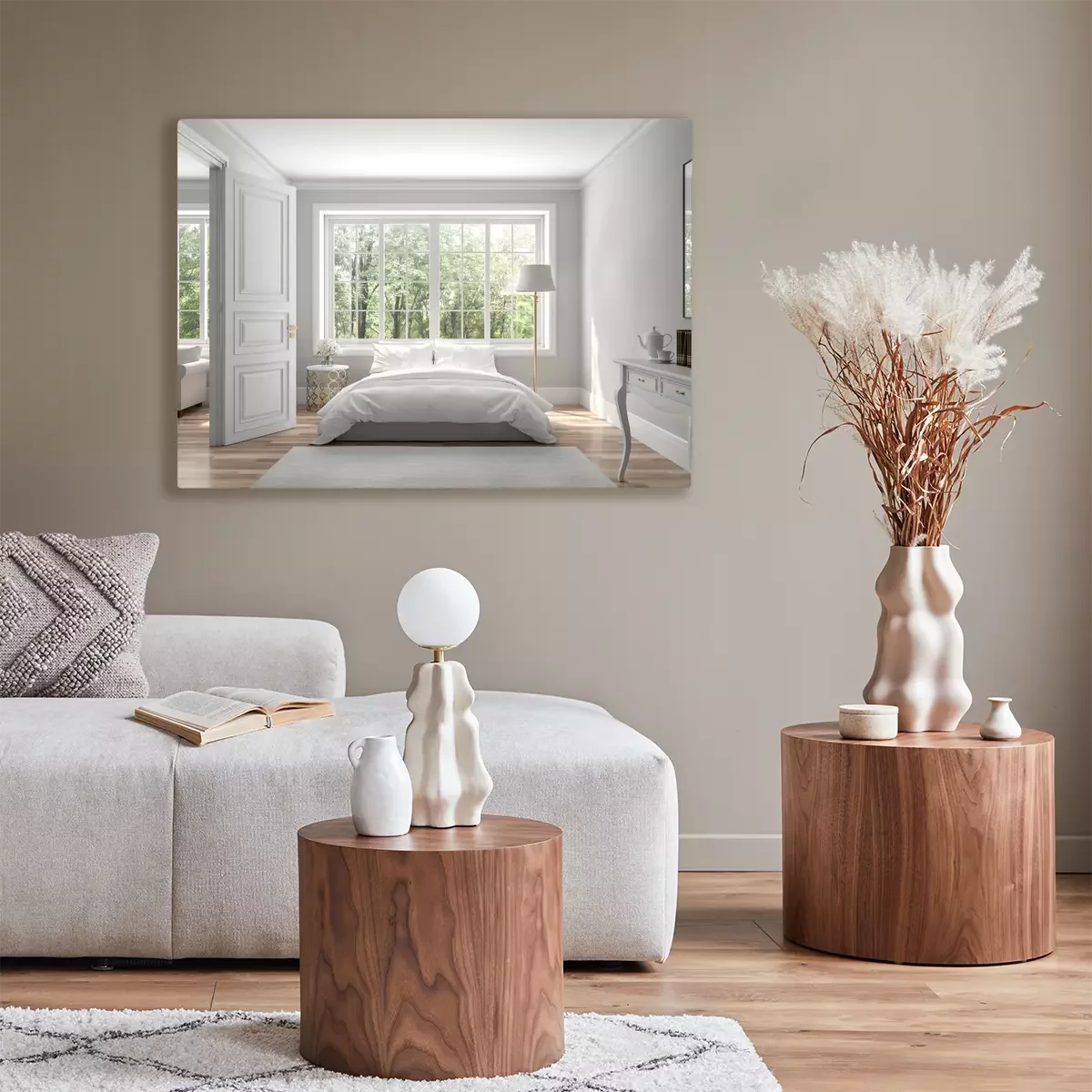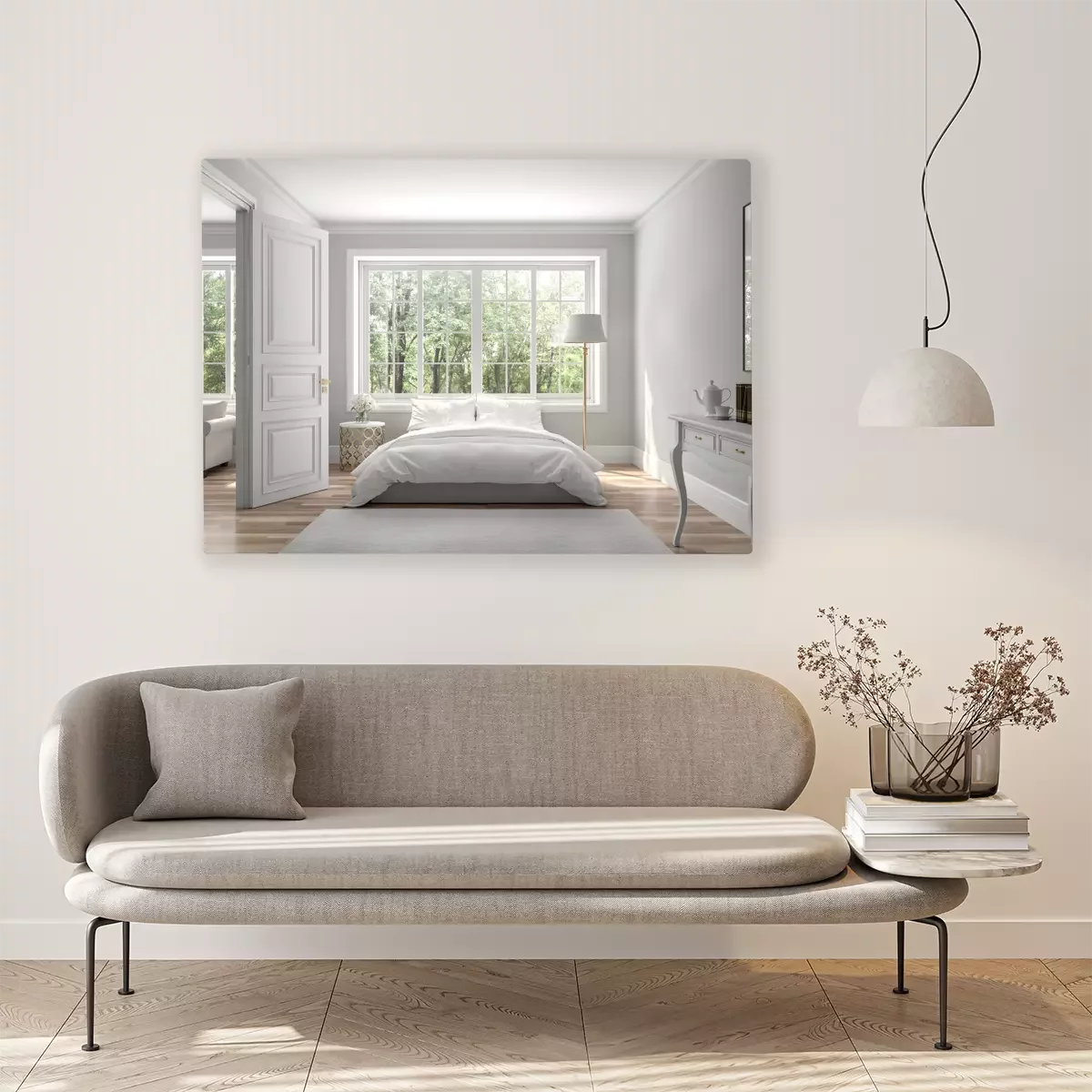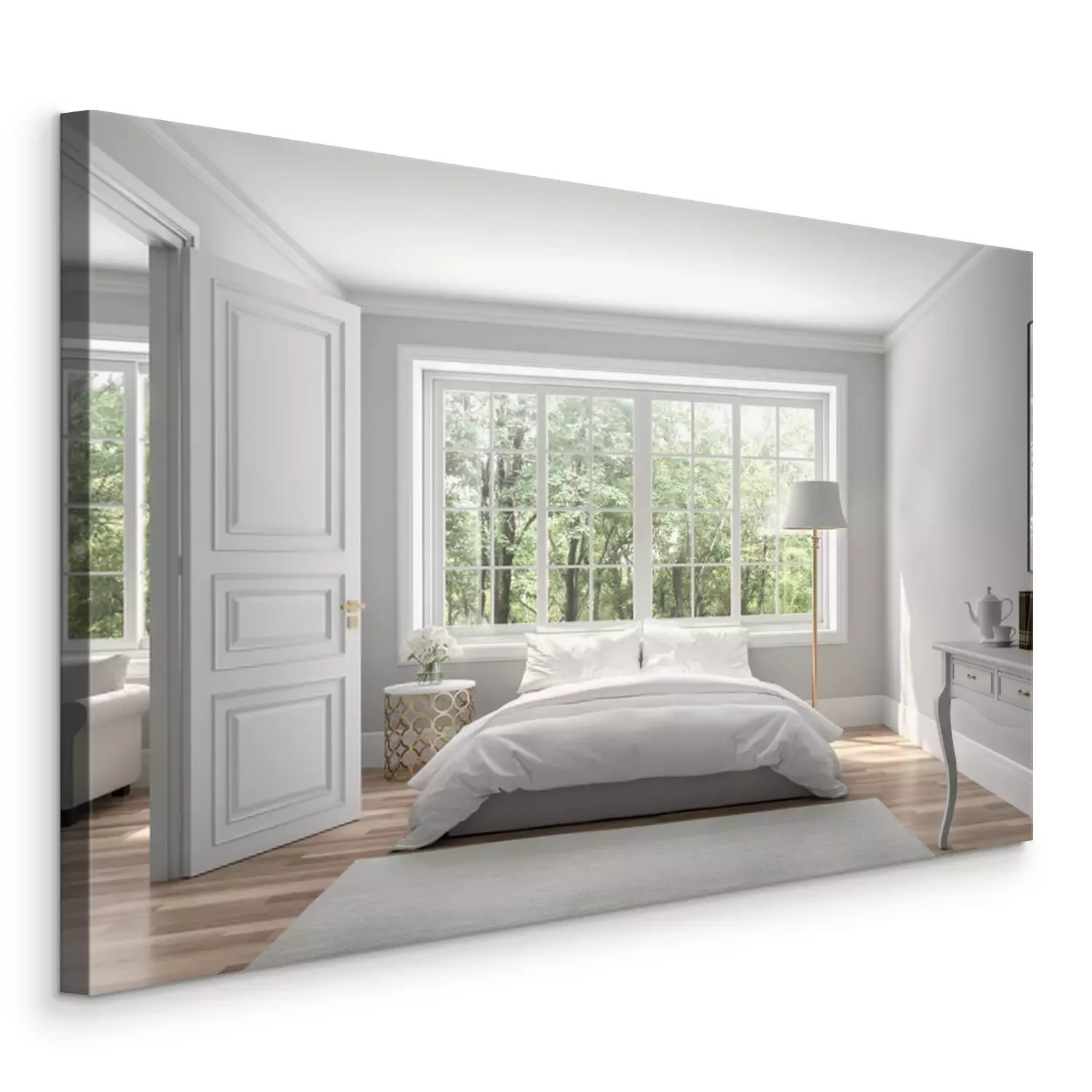 Canvas Classical bedroom and living room 3d render,The rooms have wooden floors and gray walls ,decorate with white and gold furniture,There are large window looking out to the nature view.