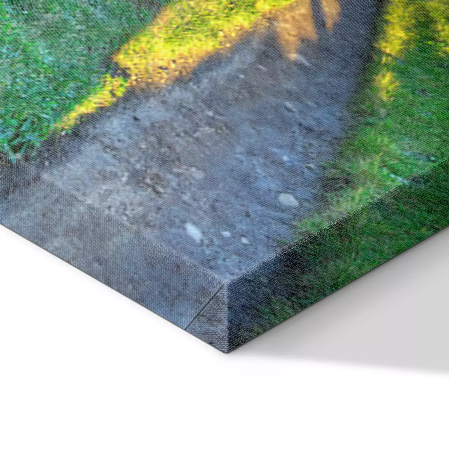 De print wordt aangebracht op hoogwaardig canvas dat op een schildersweefgetouw (spieraam) wordt gespannen. Omdat de print de zijranden bedekt, hoeft het ontwerp niet met een extra kader te worden omlijst. Wij raden ook composities aan die uit meerdere foto's bestaan en zo een coherente compositie vormen.