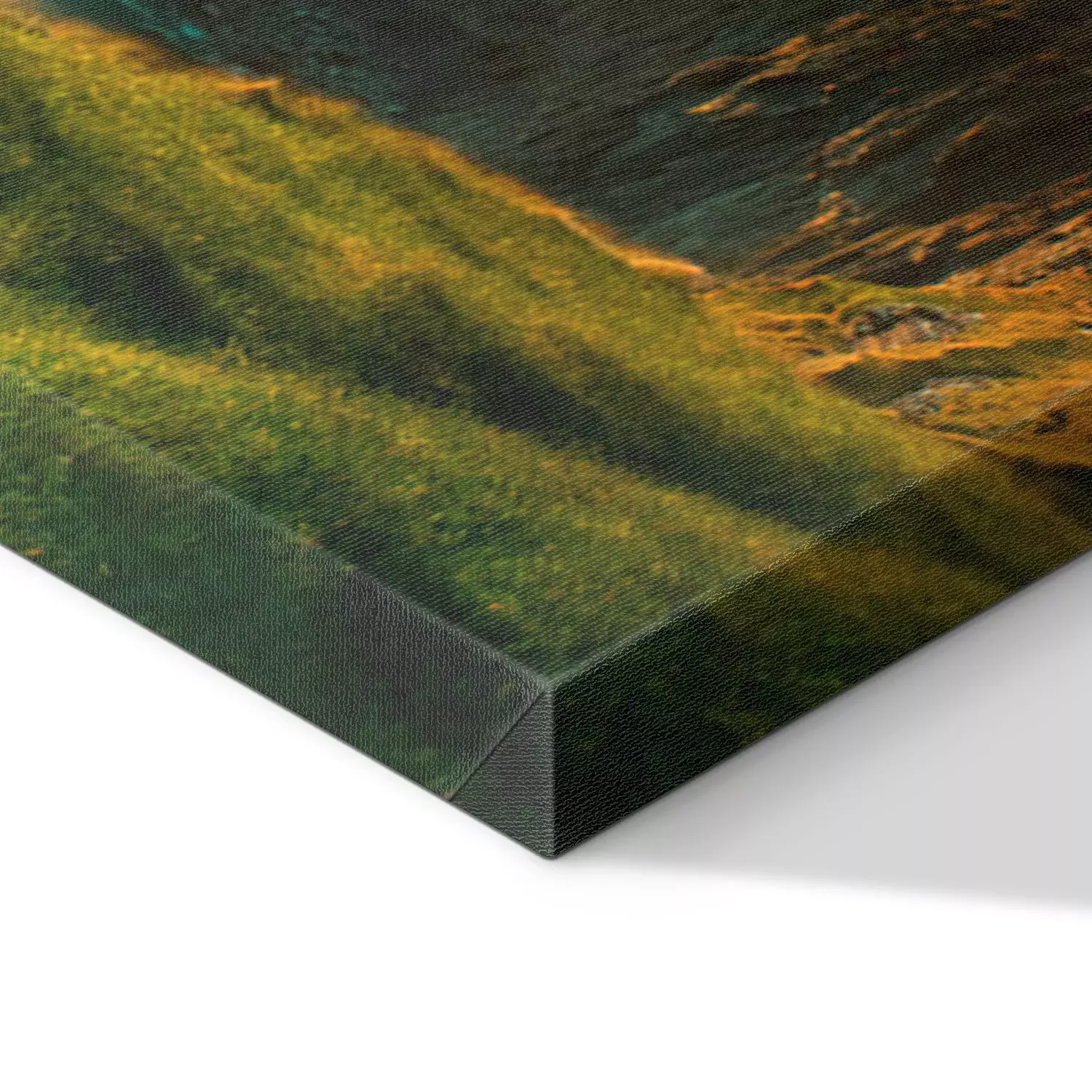 De print wordt aangebracht op hoogwaardig canvas dat op een schildersweefgetouw (spieraam) wordt gespannen. Omdat de print de zijranden bedekt, hoeft het ontwerp niet met een extra kader te worden omlijst. Wij raden ook composities aan die uit meerdere foto's bestaan en zo een coherente compositie vormen.
