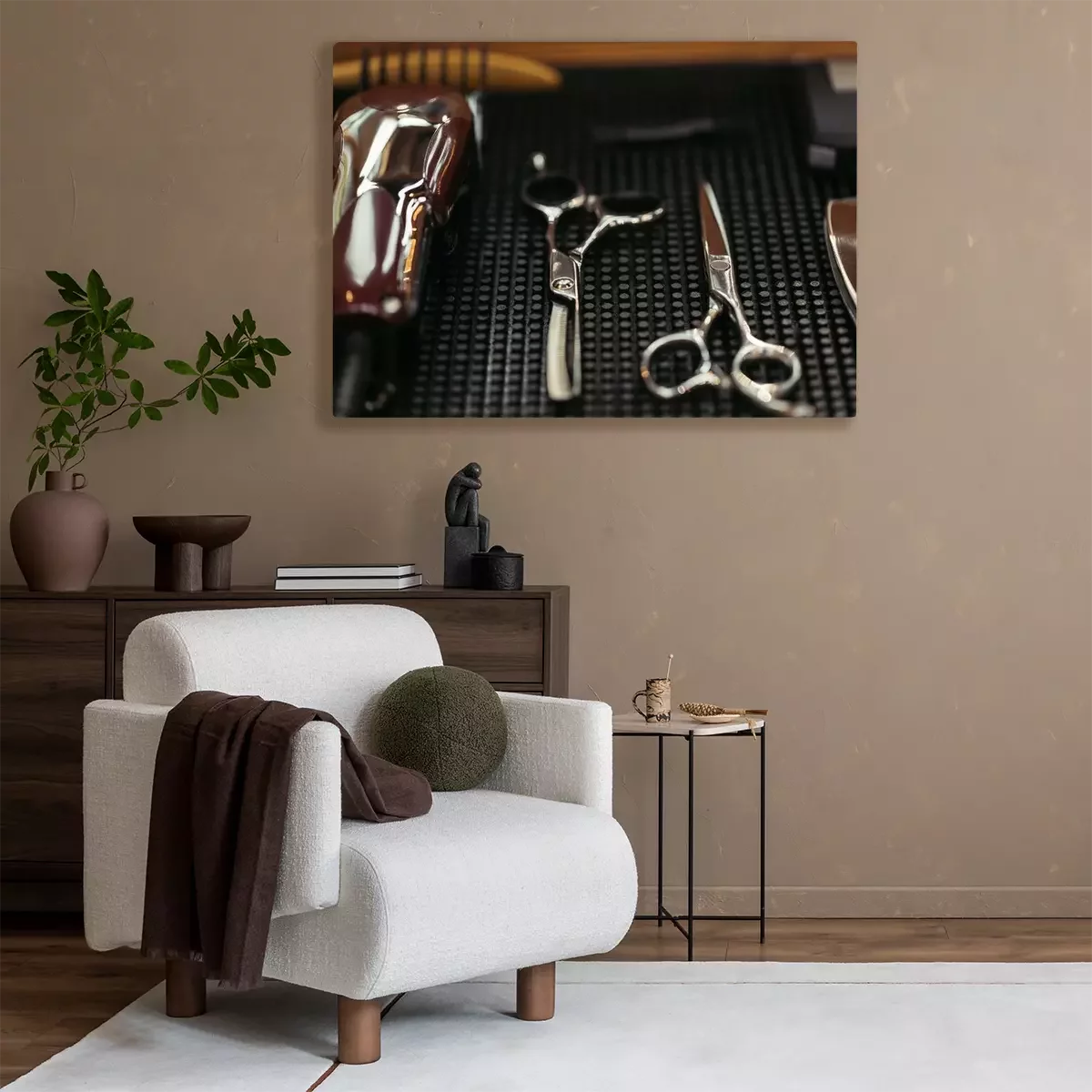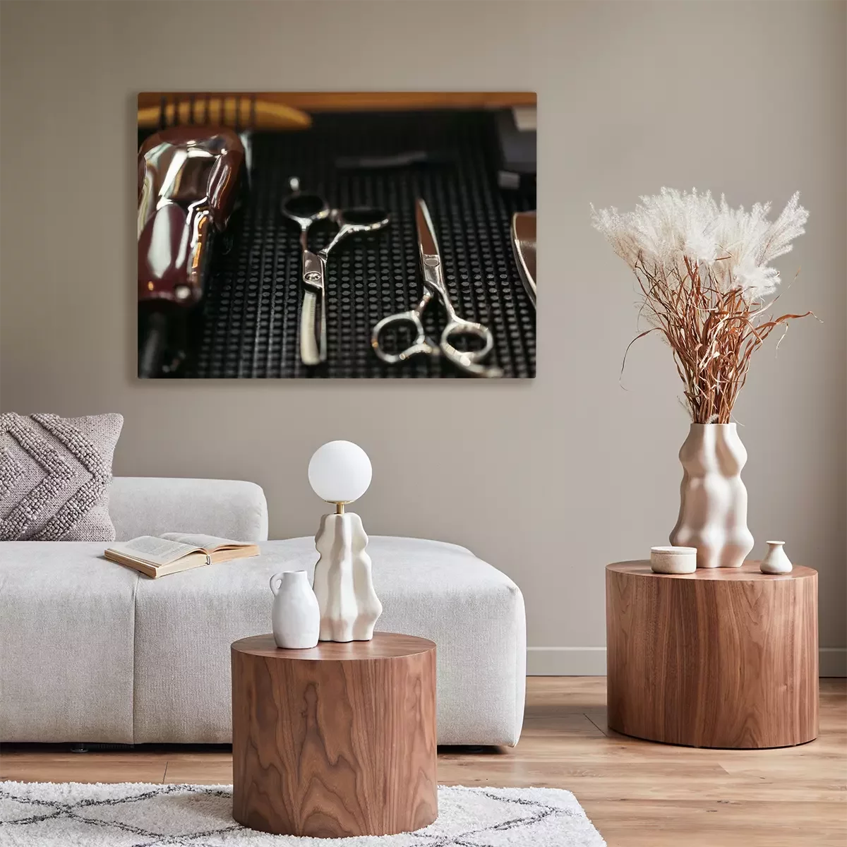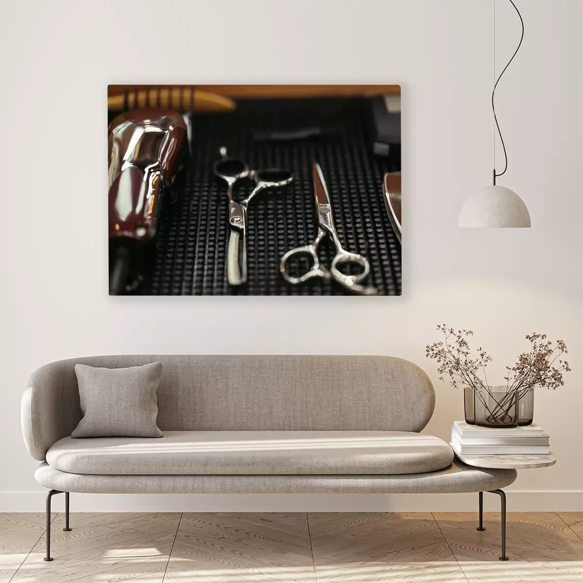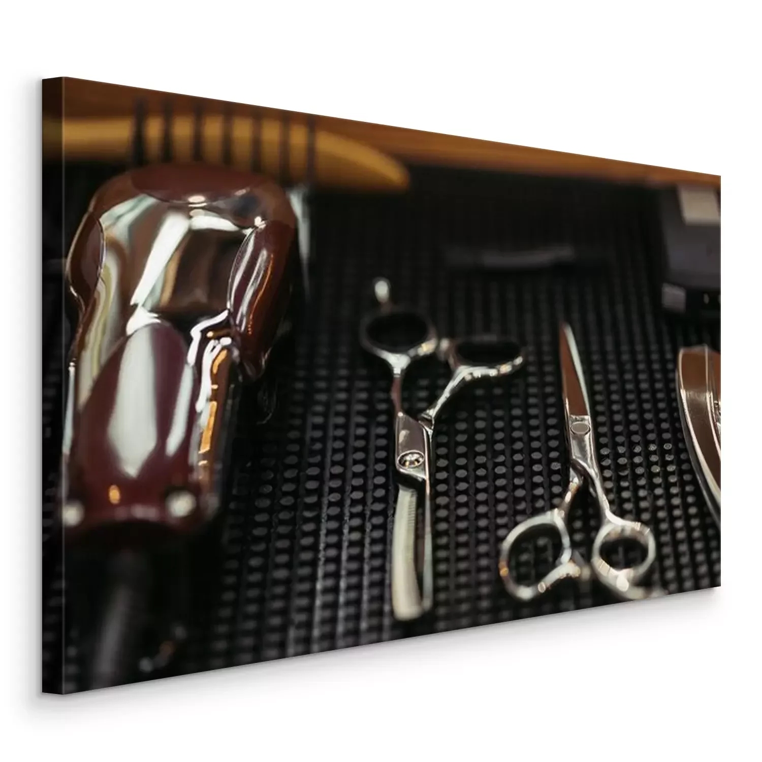 Canvas: close-up beeld van professionele schaar en elektrische clipper in kapperszaak