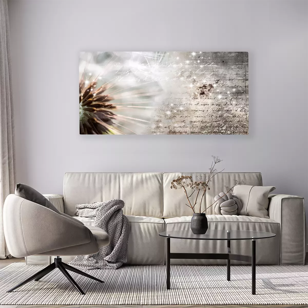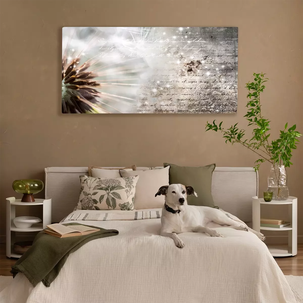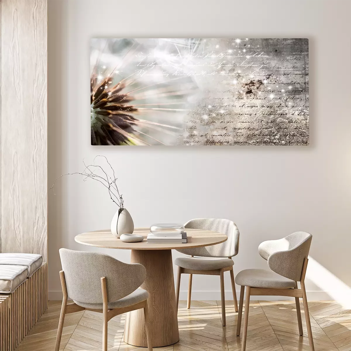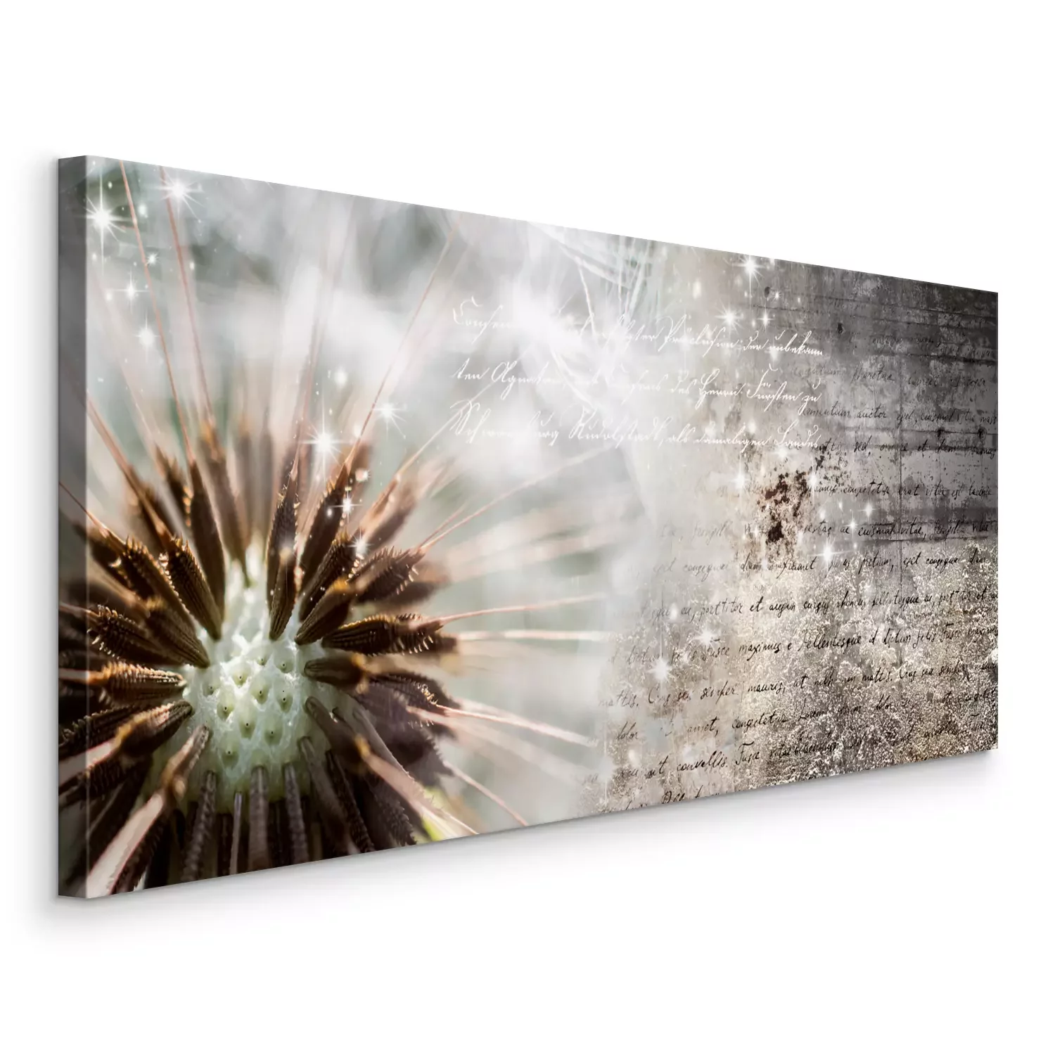 Close-up van een paardenbloem met tekst in tinten bruin en grijs
