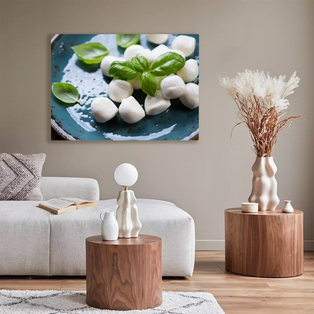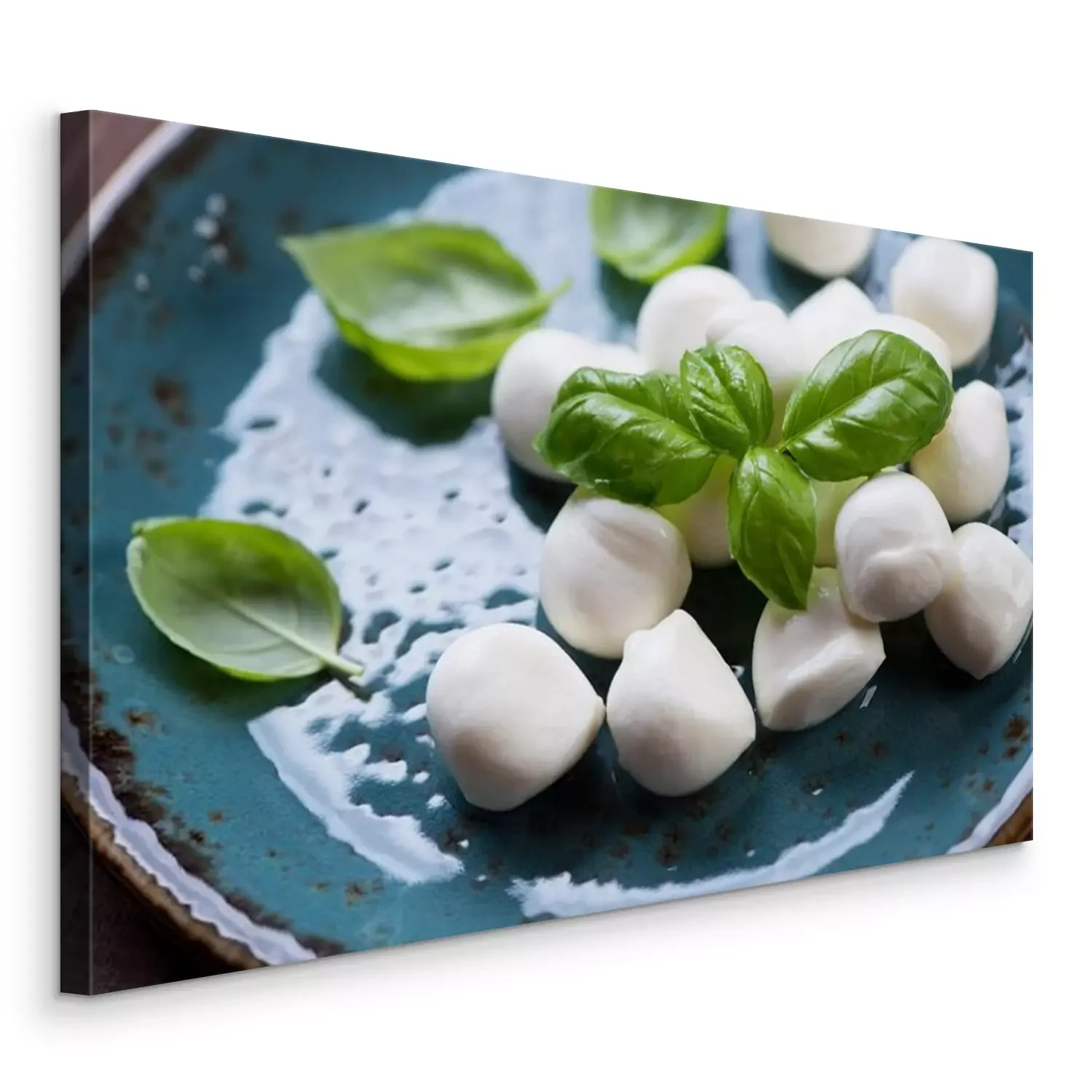 Canvas: Close-up van mini mozzarella met groene basilicum op een bord