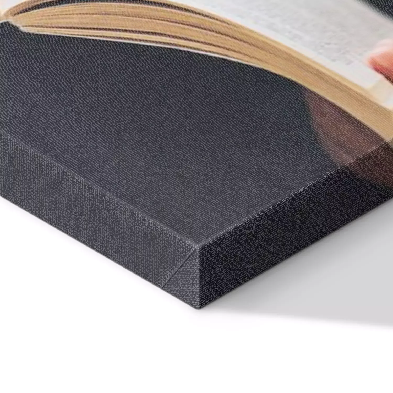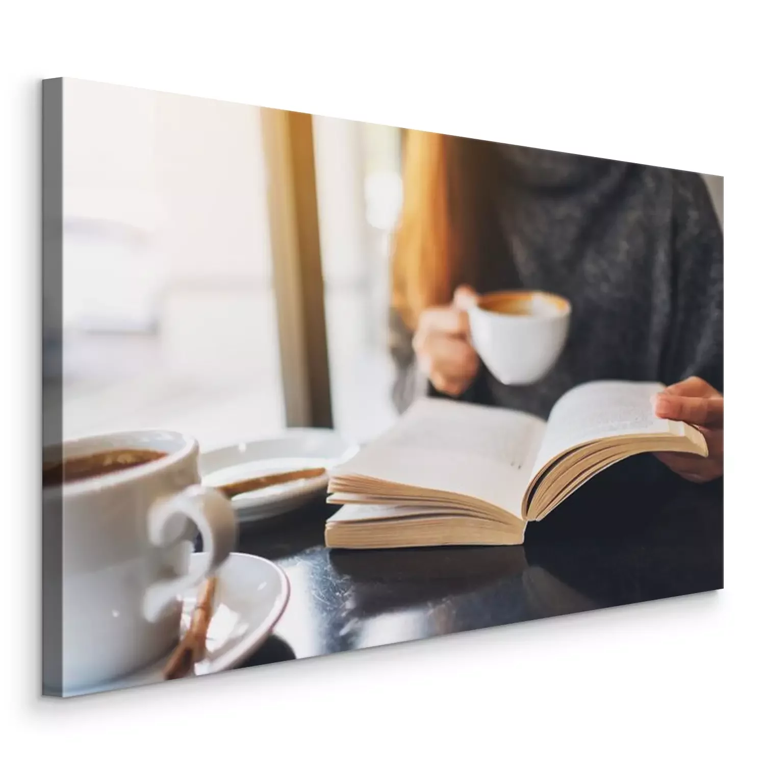 Canvas Closeup image of a woman reading a book while drinking coffee in cafe