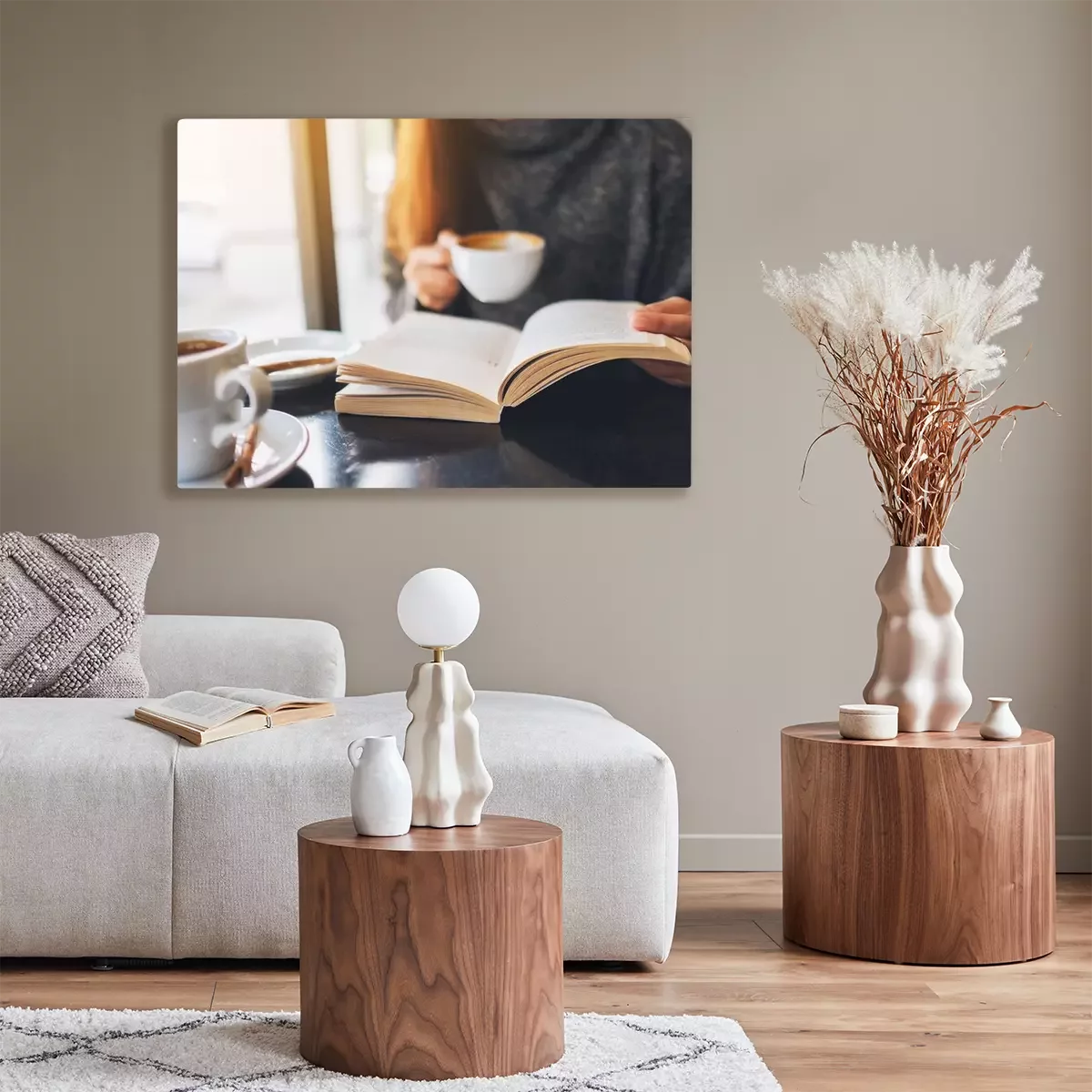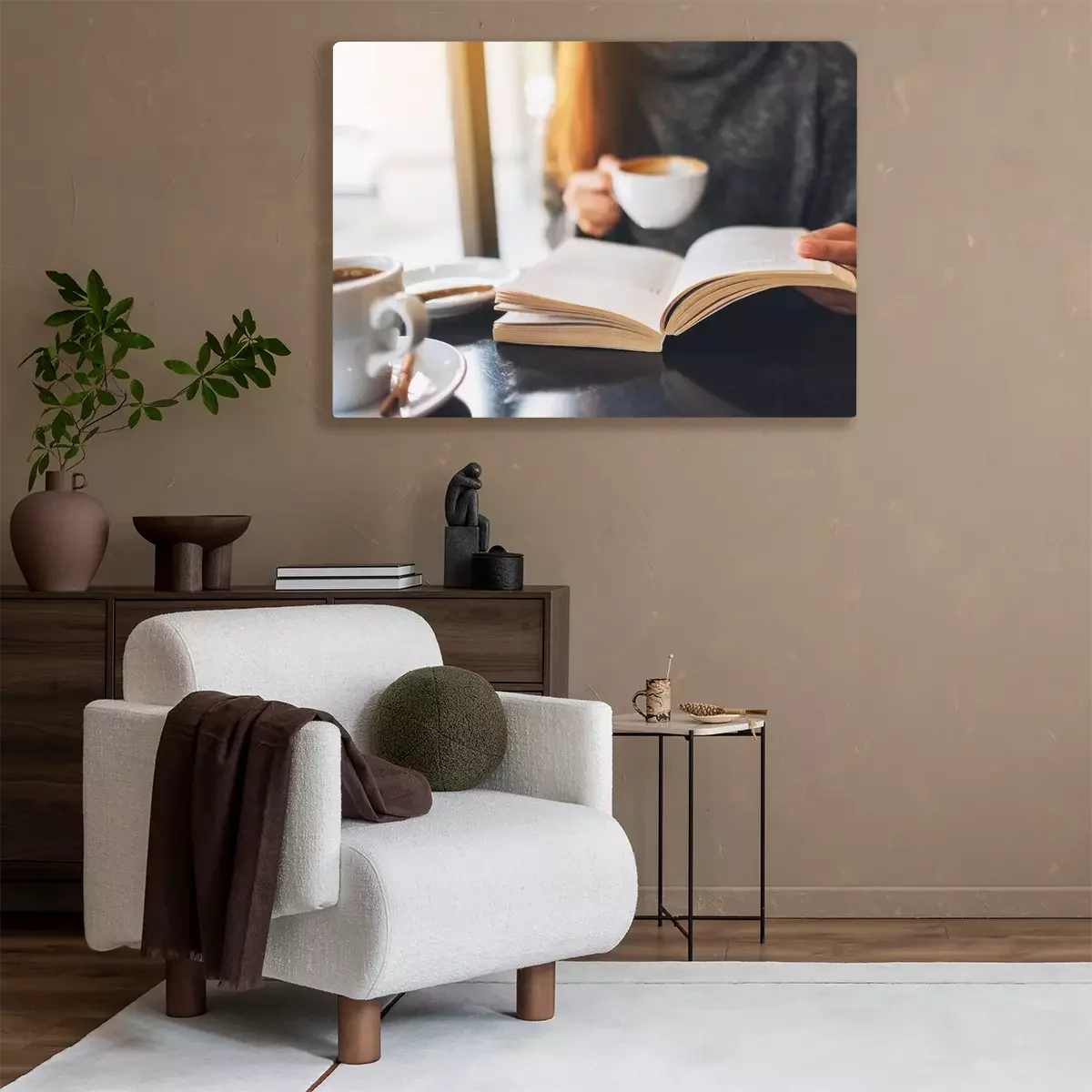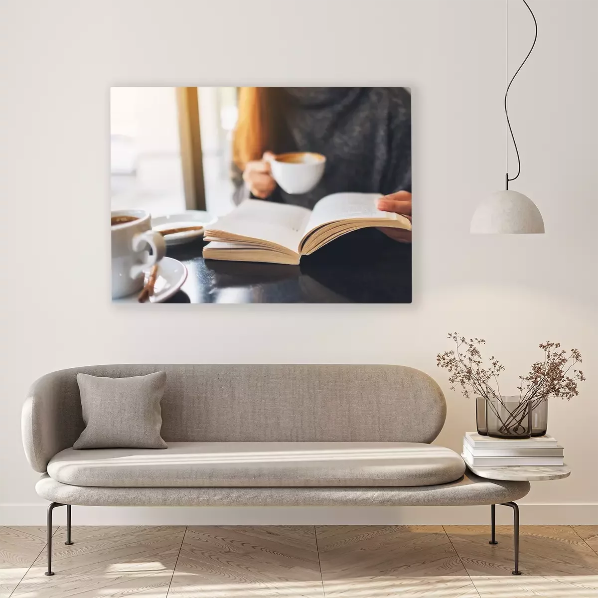 Canvas: Closeup image of a woman reading a book while drinking coffee in cafe