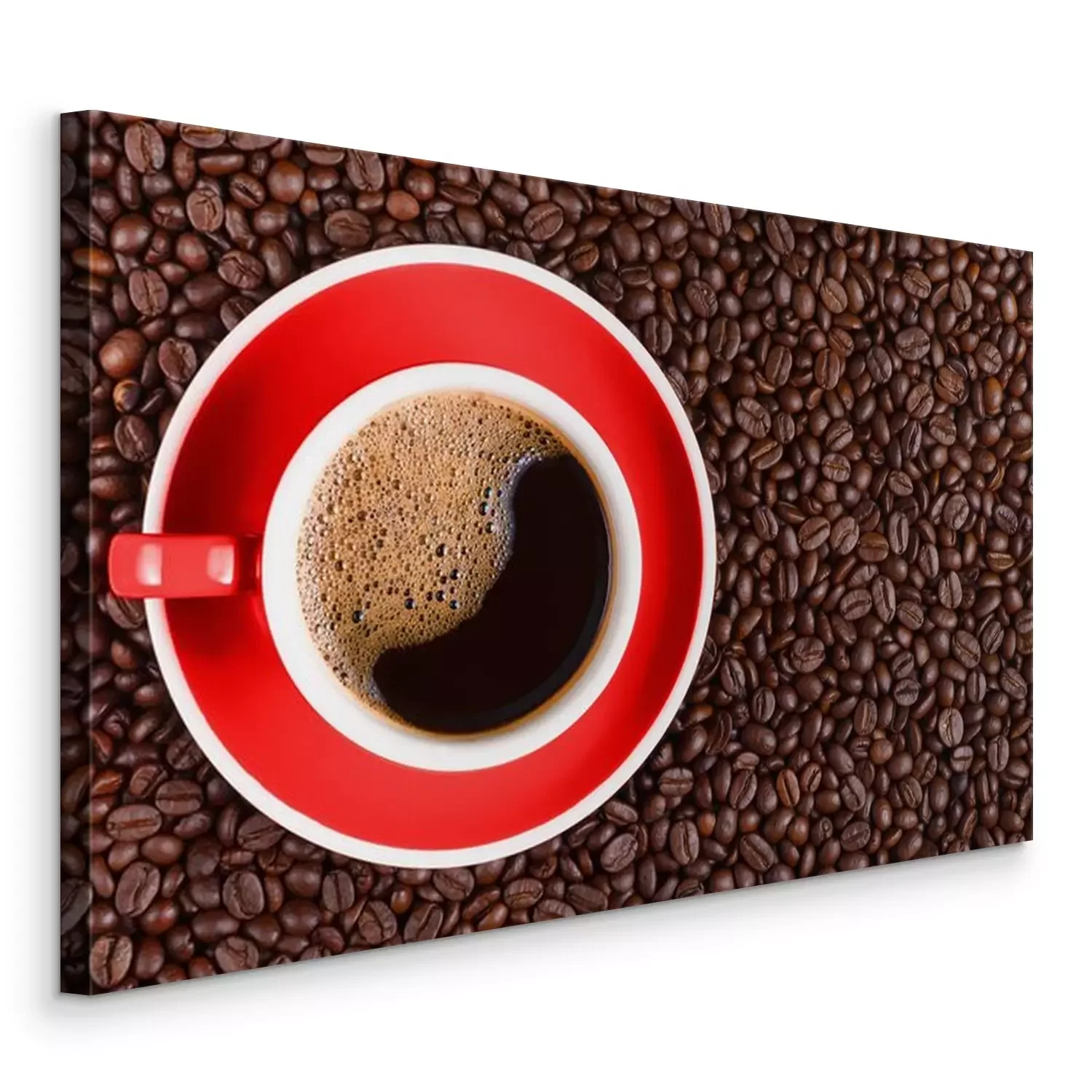 Canvas coffee background of hot black coffee in red cup on roasted arabica coffee beans background