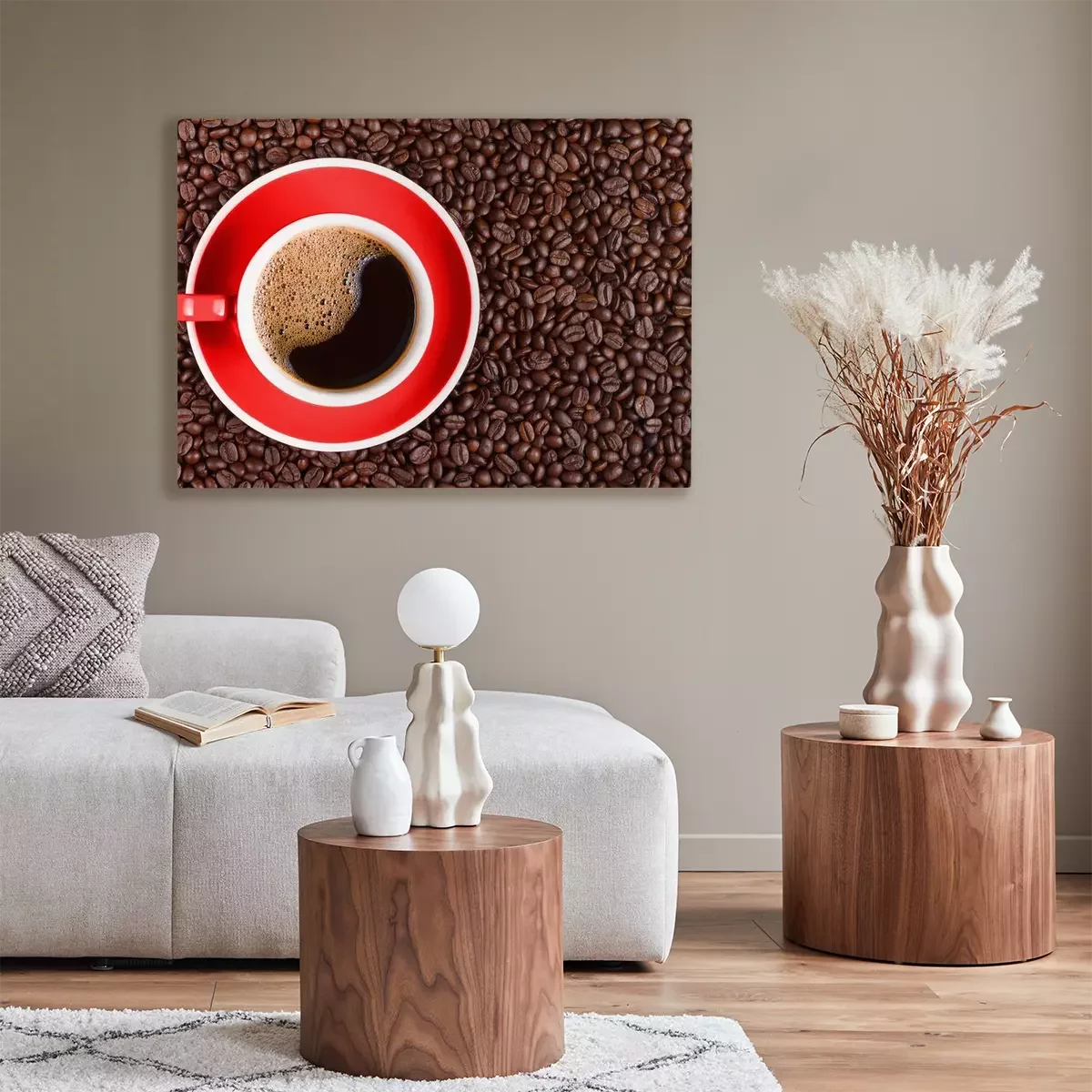Canvas: coffee background of hot black coffee in red cup on roasted arabica coffee beans background