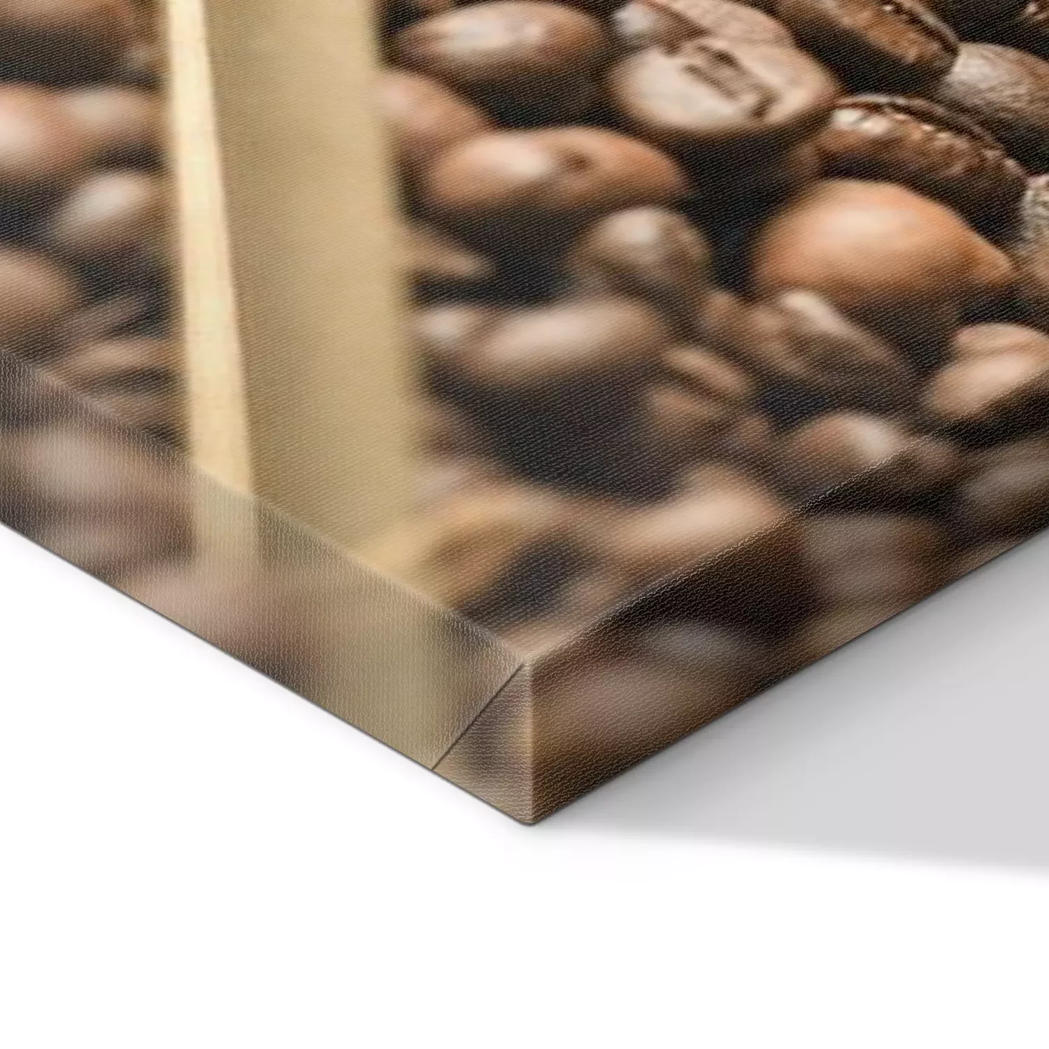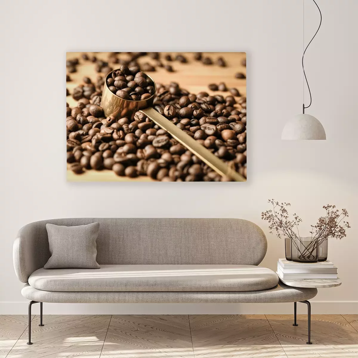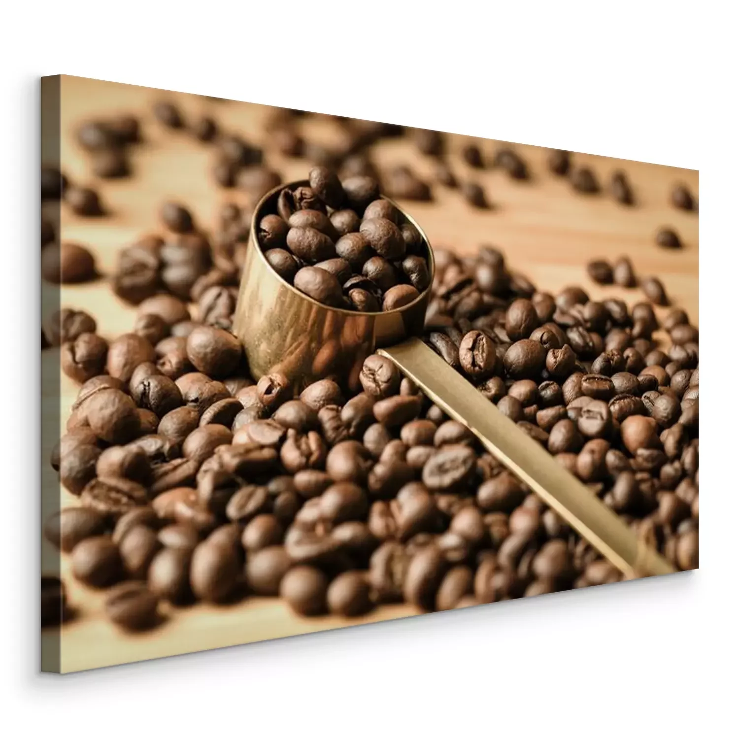Canvas: Coffee beans are poured on a wooden surface and in the middle is a coffee spoon full of beans