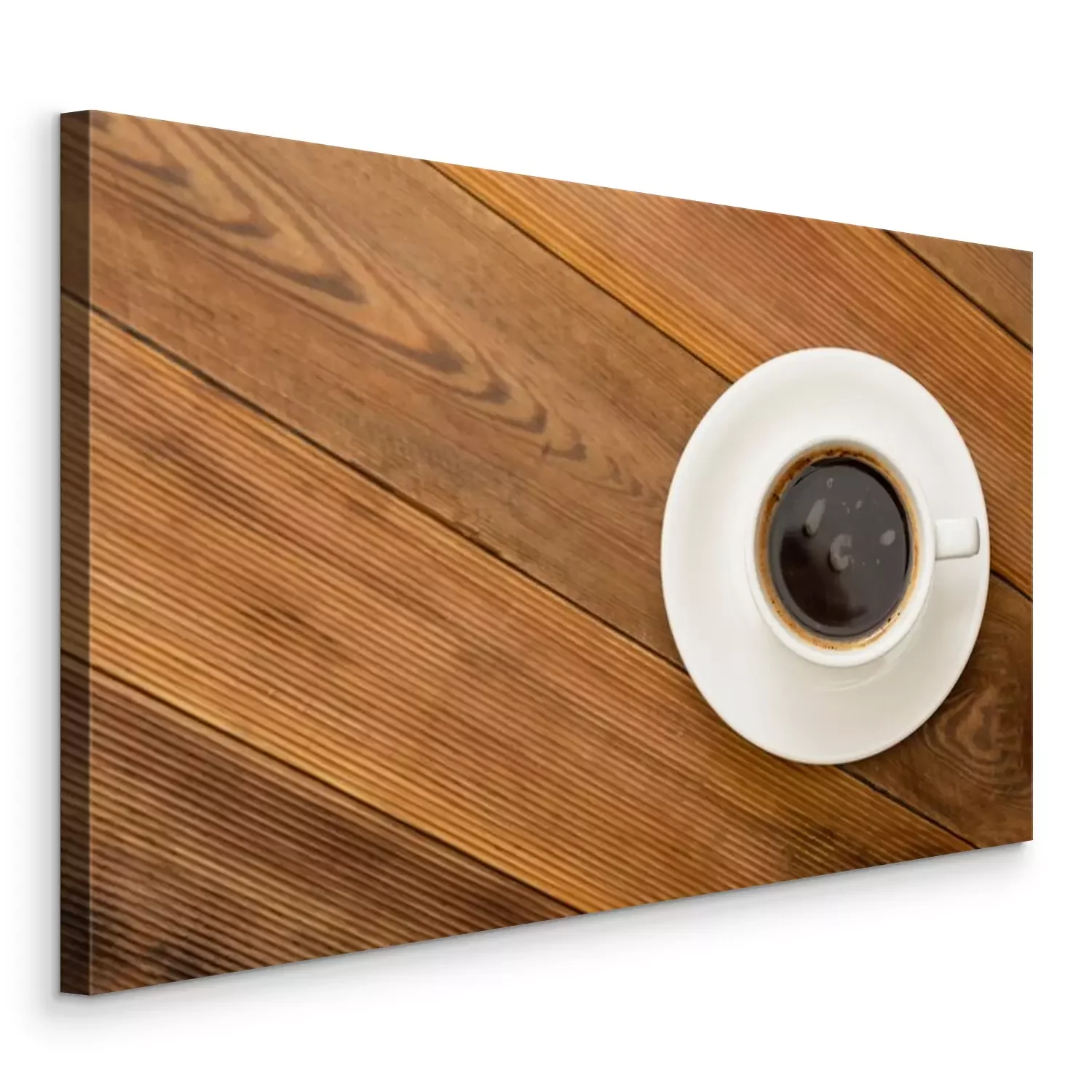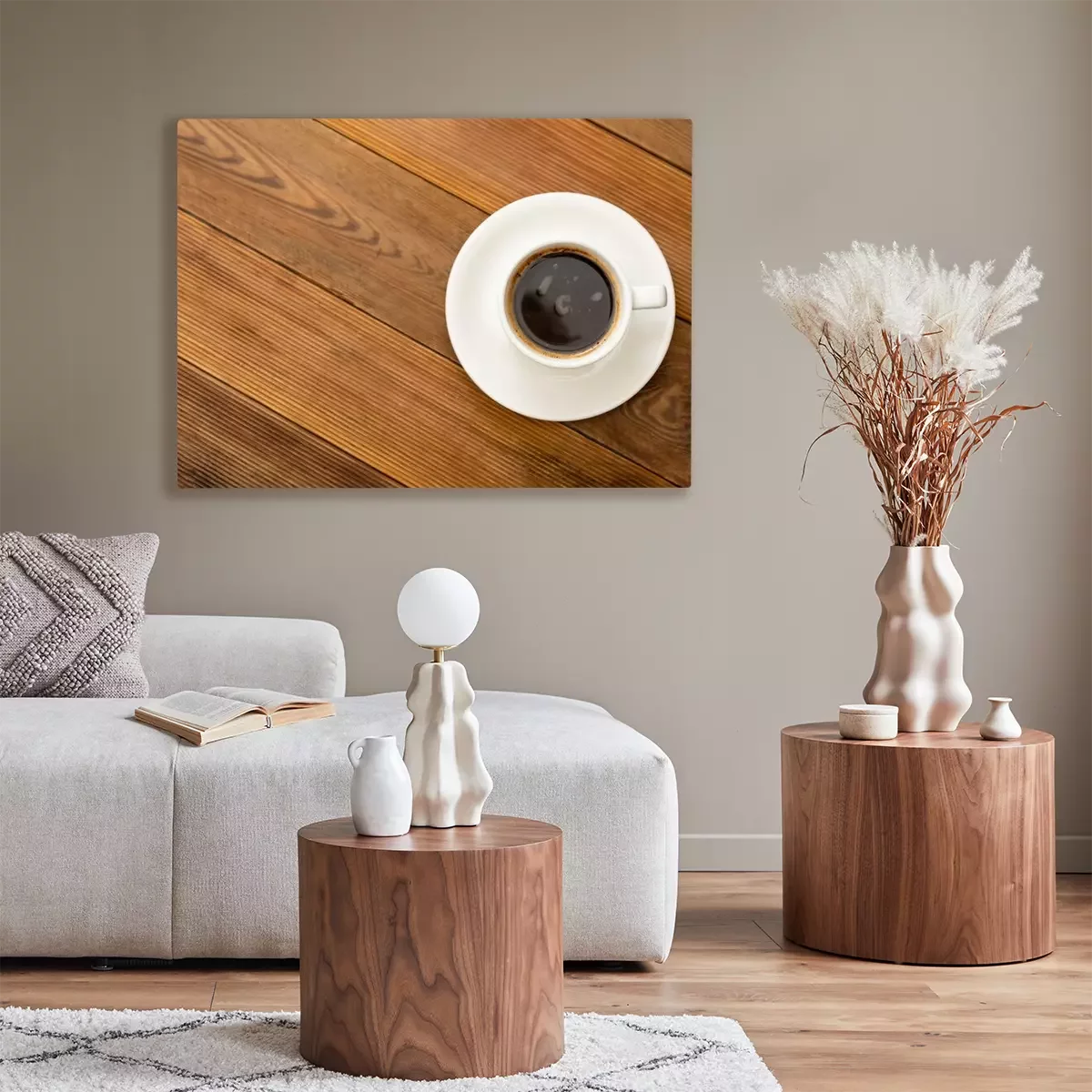 Canvas: Coffee cup isolated on wooden table. Top view, flat lay coffee drink with copy space.