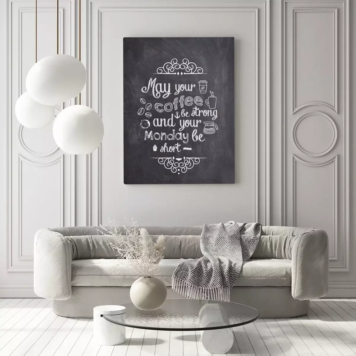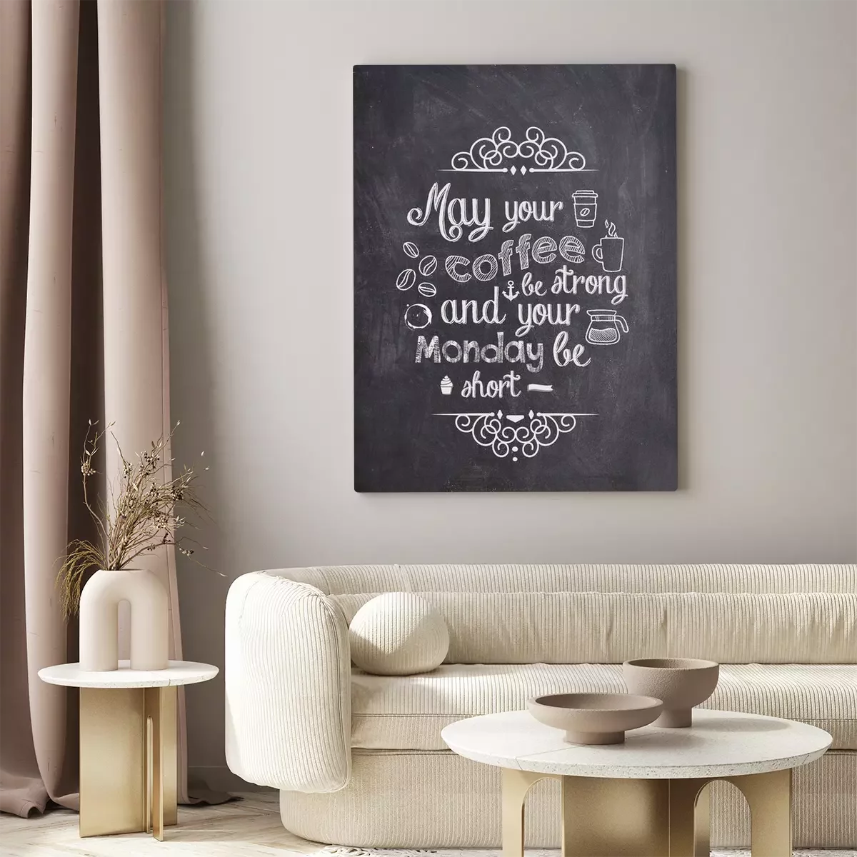 Canvas: Coffee Quote geschreven met krijt op een zwarte raad