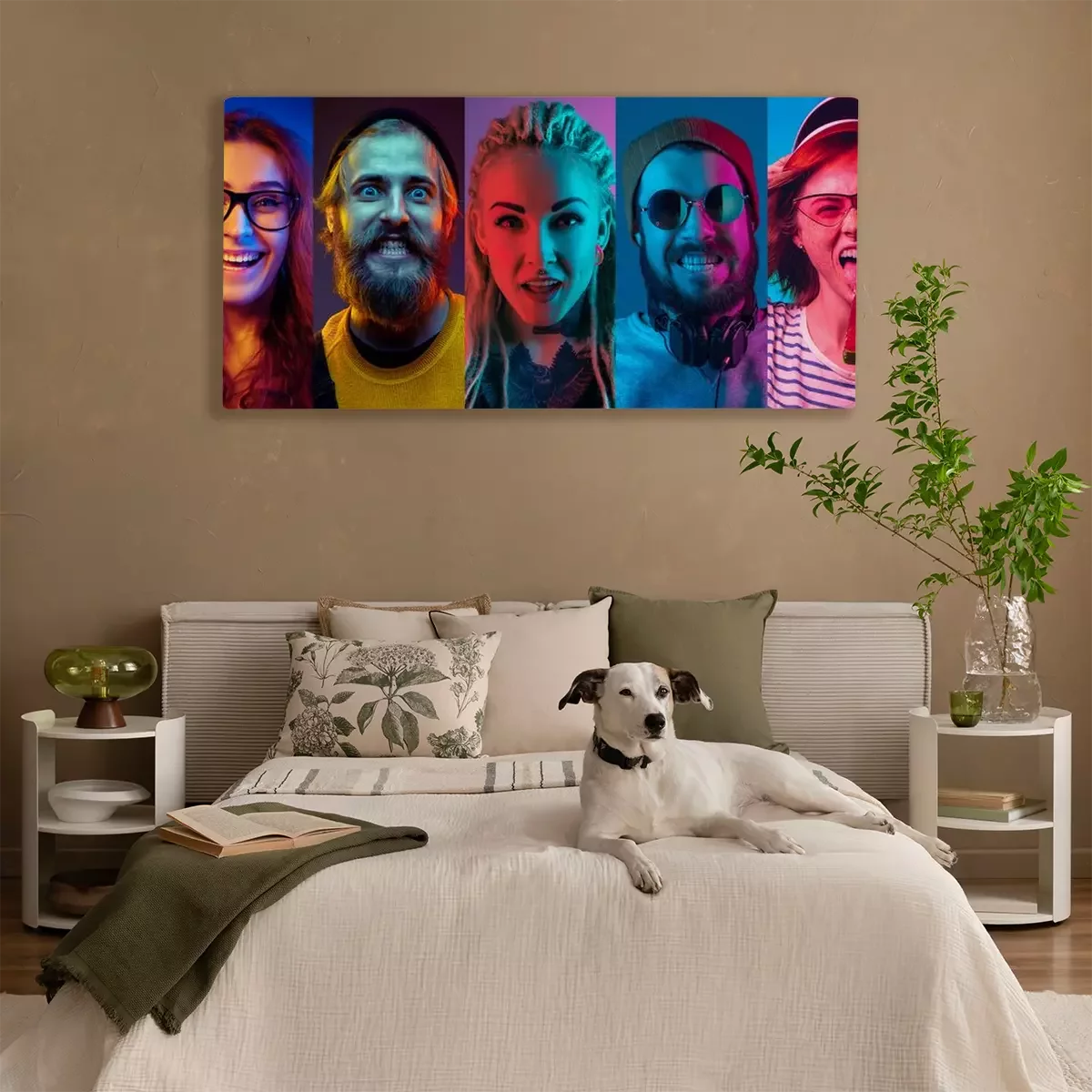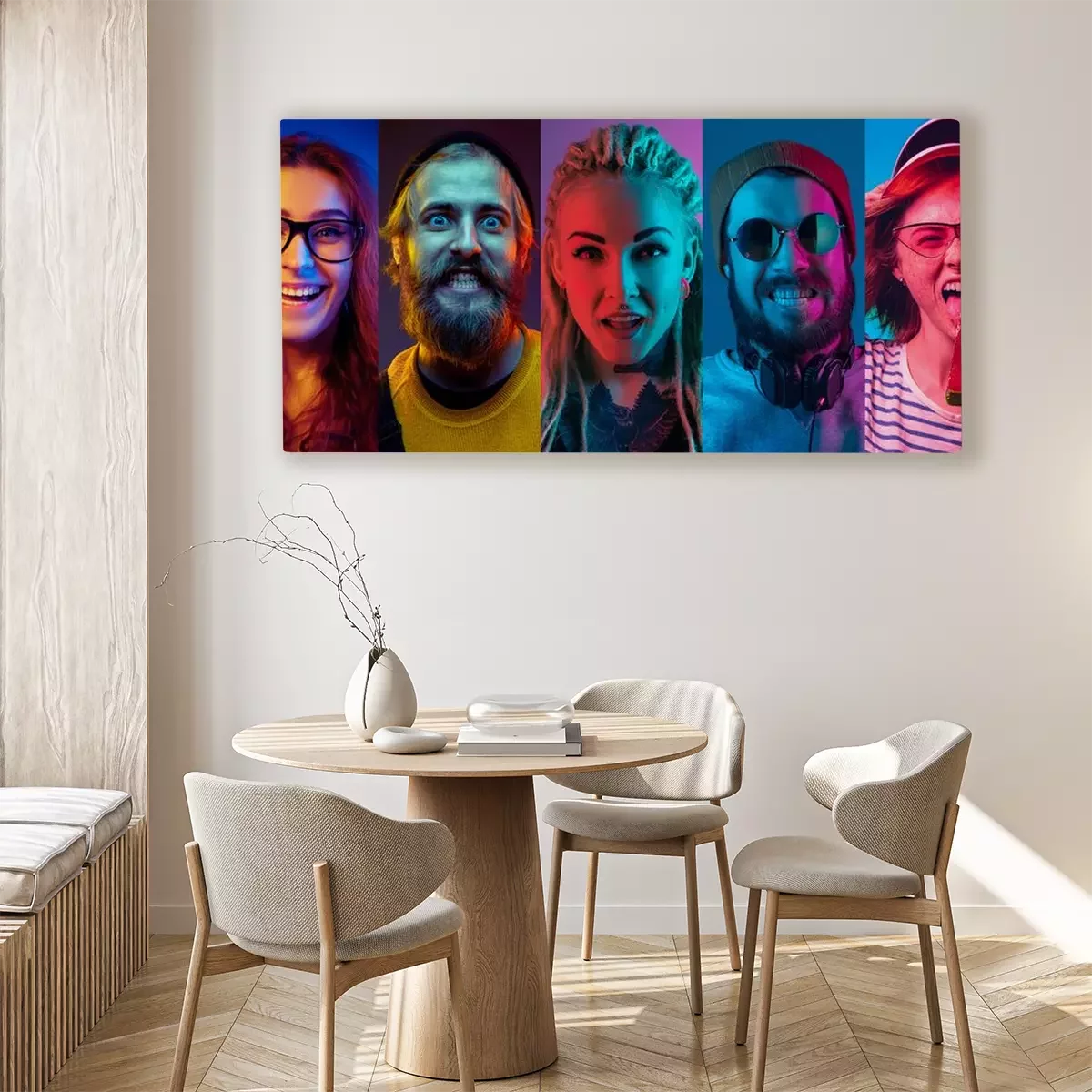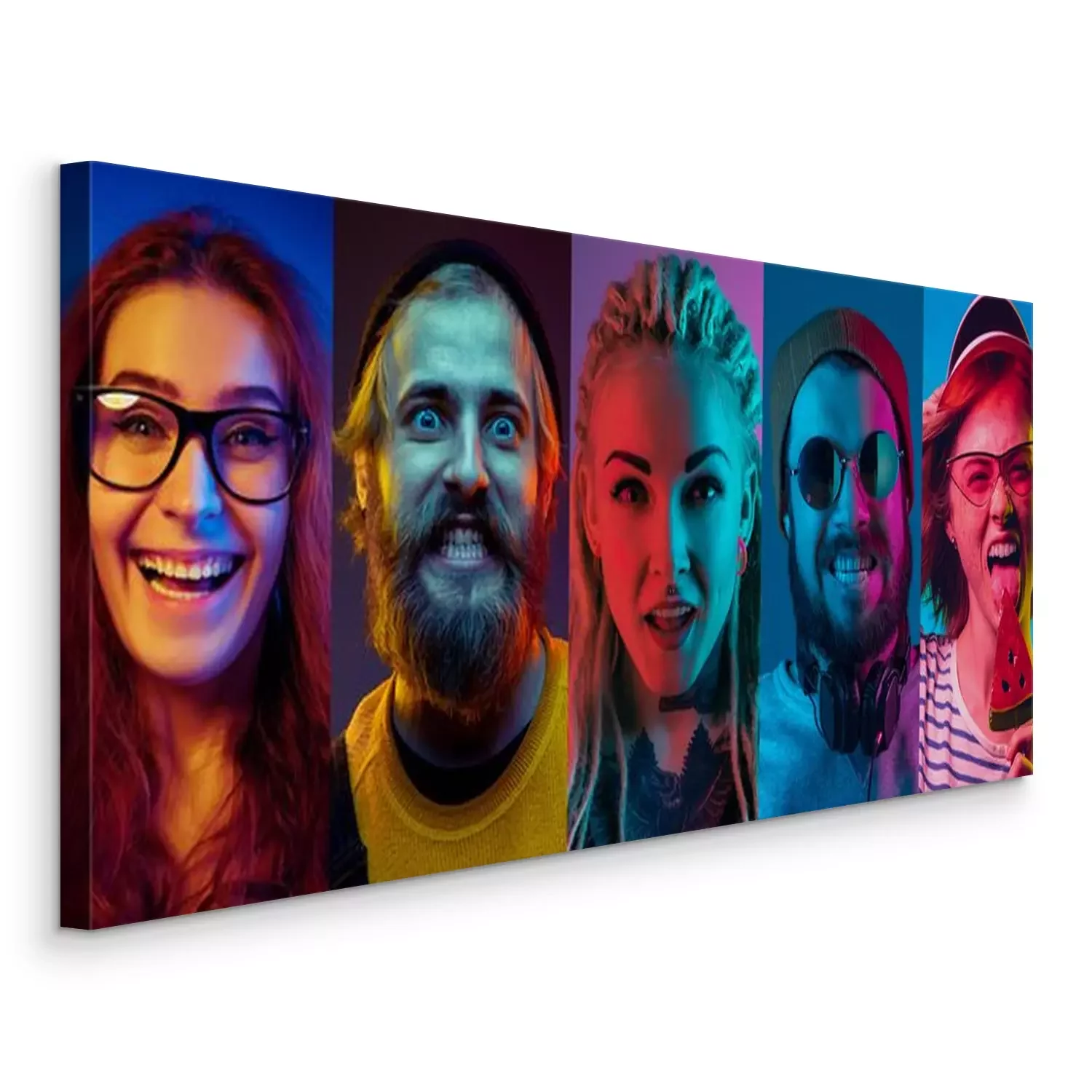 Canvas Collage of portraits of young emotional people on multicolored background in neon light. Concept of human emotions, facial expression, sales. Smiling, listen to music, happy. Flyer for ad, proposal.