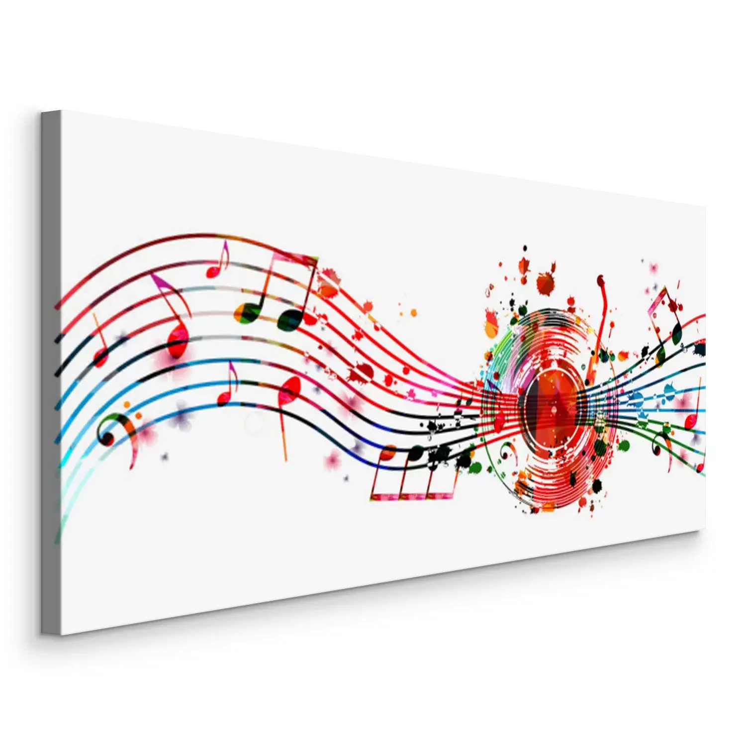 Canvas Colorful music background with music notes and vinyl record disc isolated vector illustration design. Artistic music festival poster, events, party flyer, music notes signs and symbols