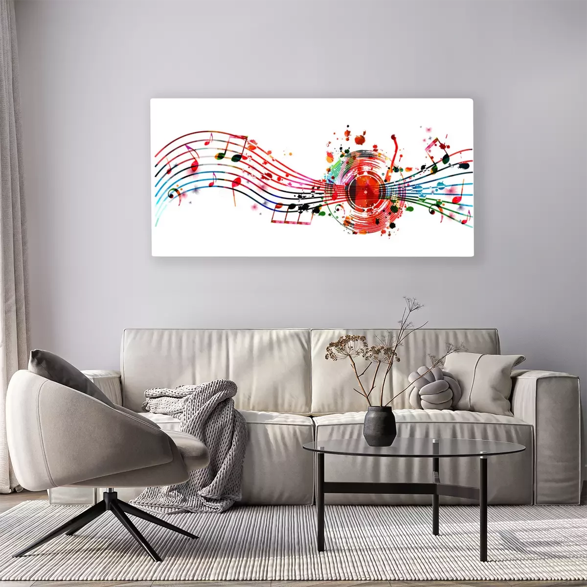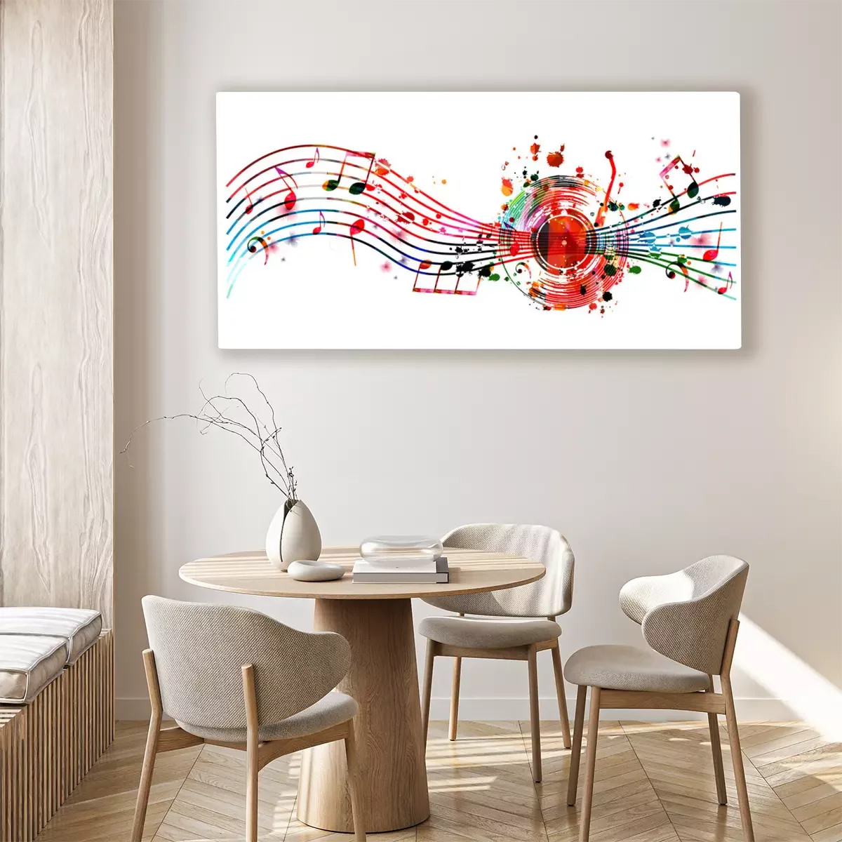 Canvas: Colorful music background with music notes and vinyl record disc isolated vector illustration design. Artistic music festival poster, events, party flyer, music notes signs and symbols