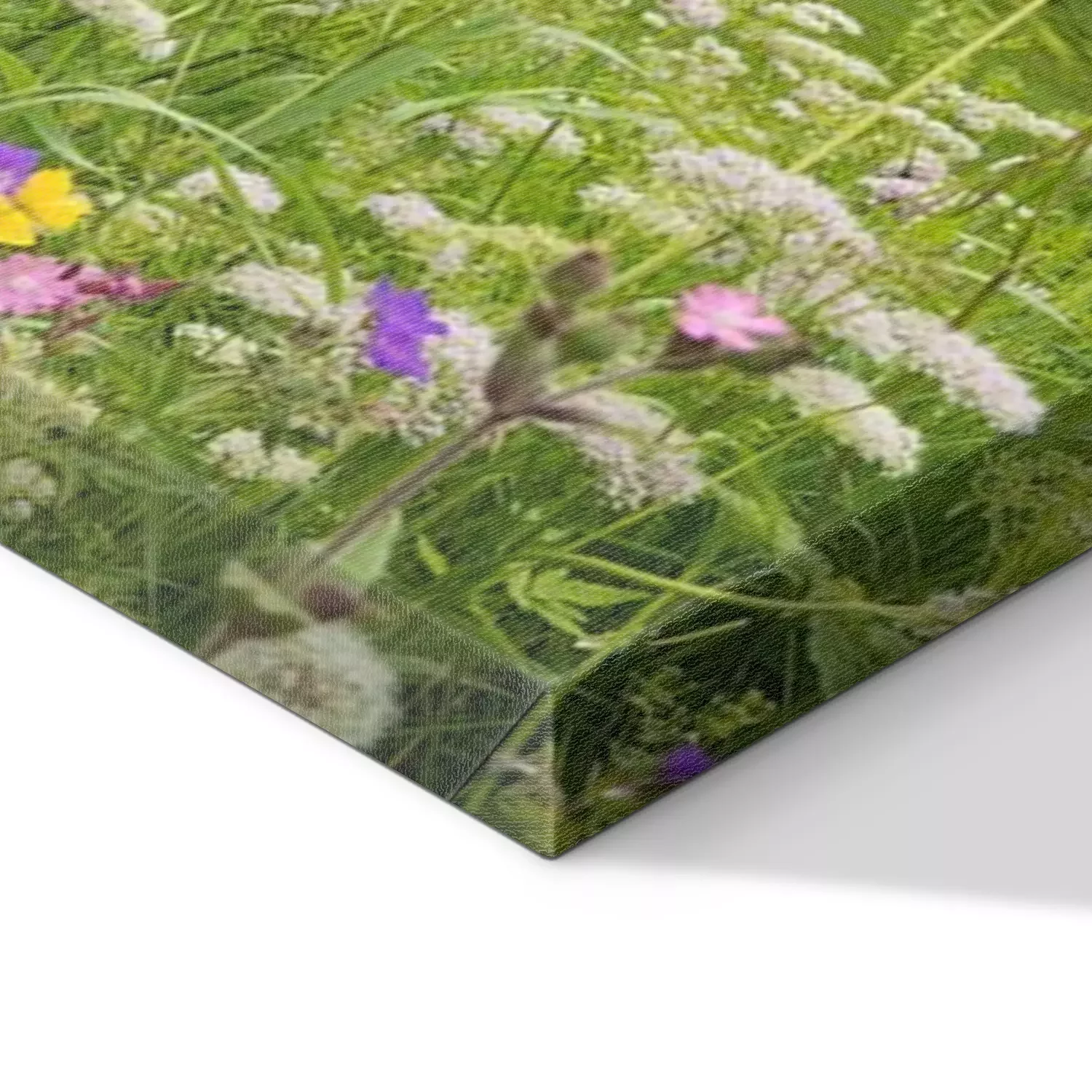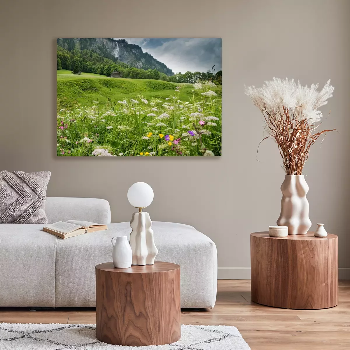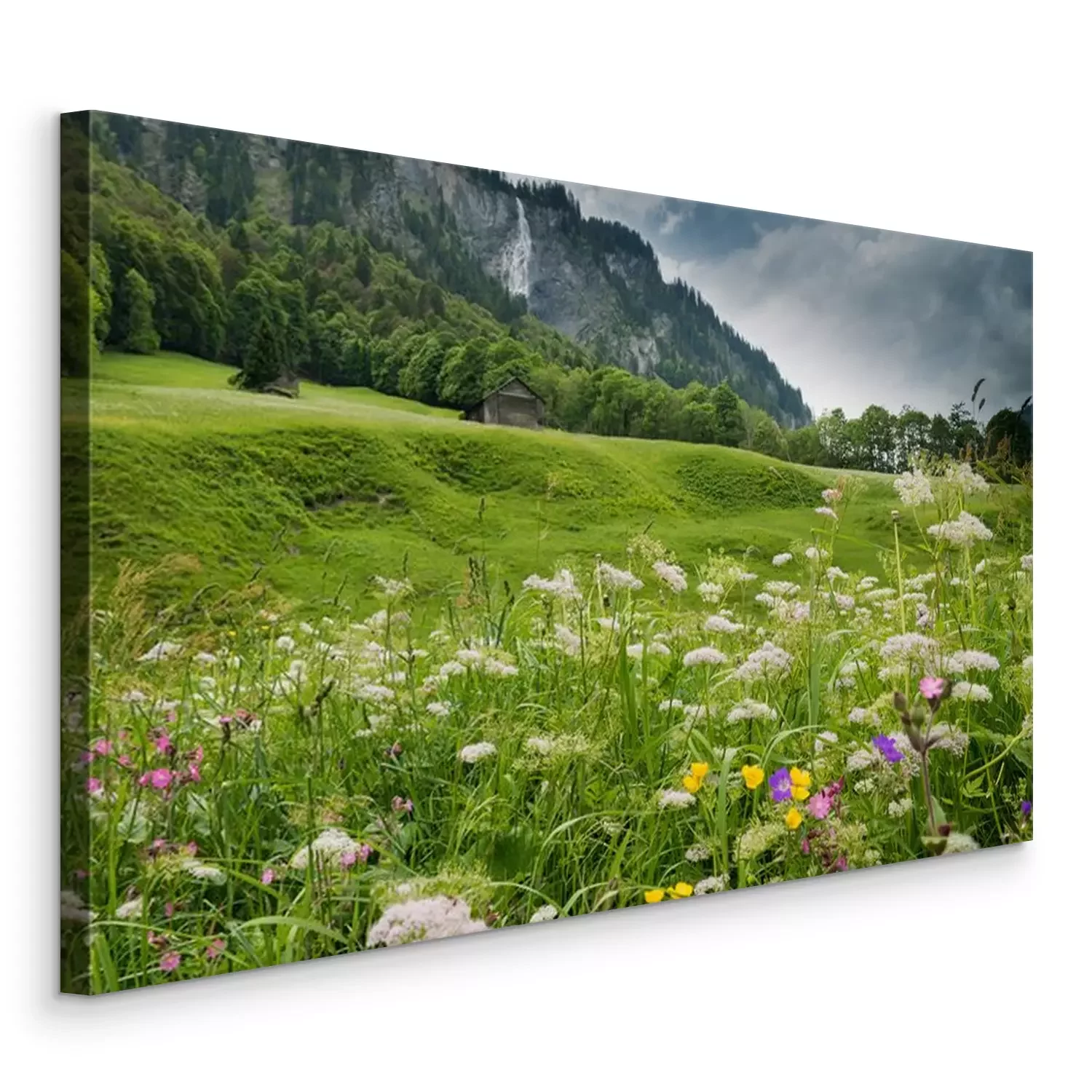 Canvas: colorful wildflower meadow and old hut in a mountain landscape with waterfall