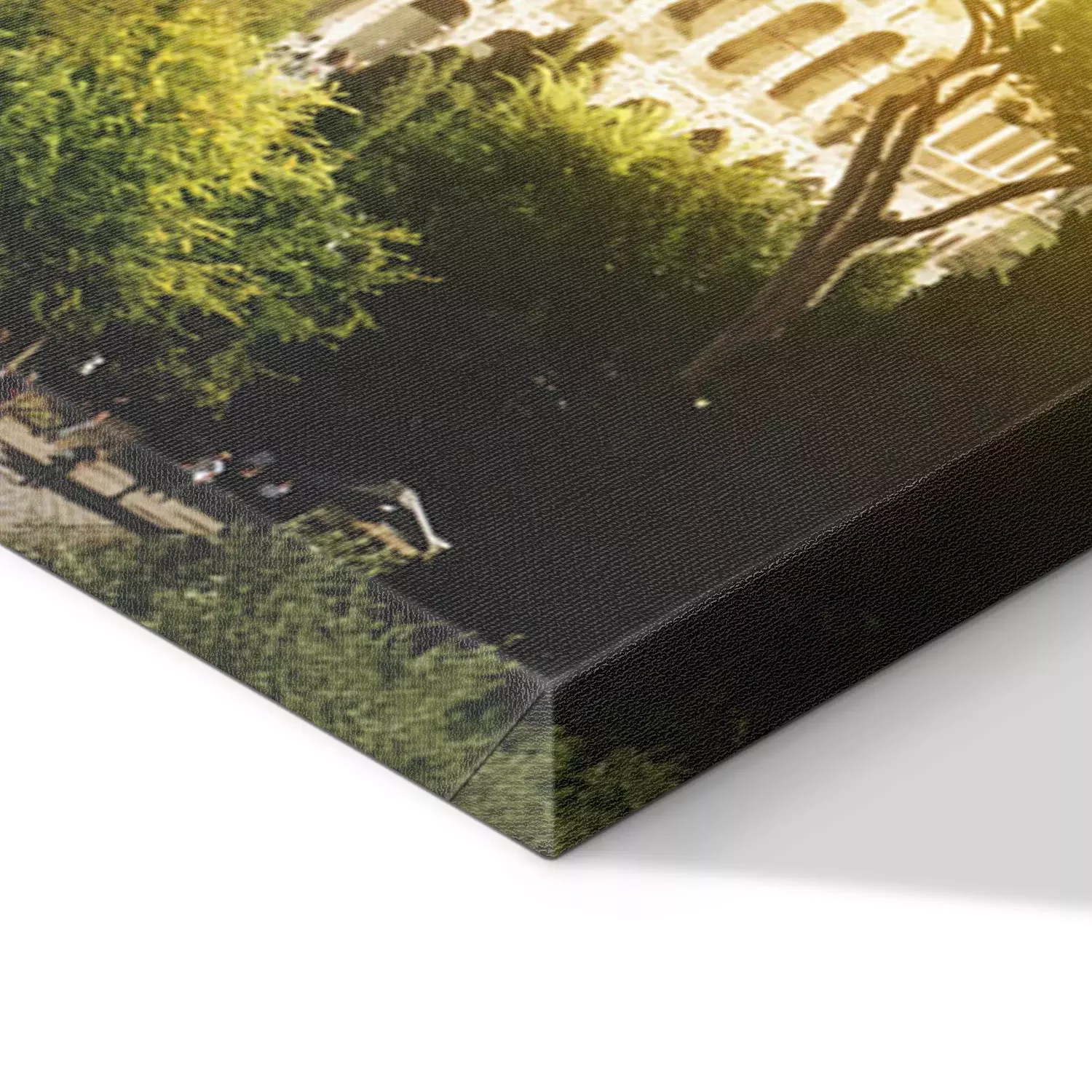 De print wordt aangebracht op hoogwaardig canvas dat op een schildersweefgetouw (spieraam) wordt gespannen. Omdat de print de zijranden bedekt, hoeft het ontwerp niet met een extra kader te worden omlijst. Wij raden ook composities aan die uit meerdere foto's bestaan en zo een coherente compositie vormen.