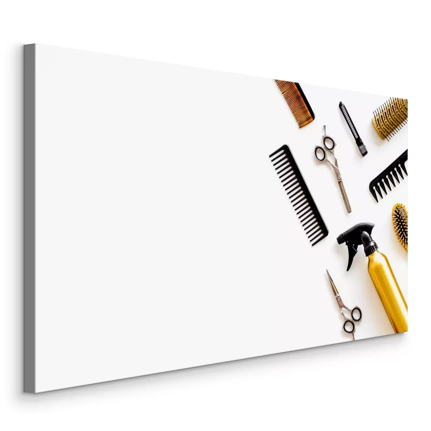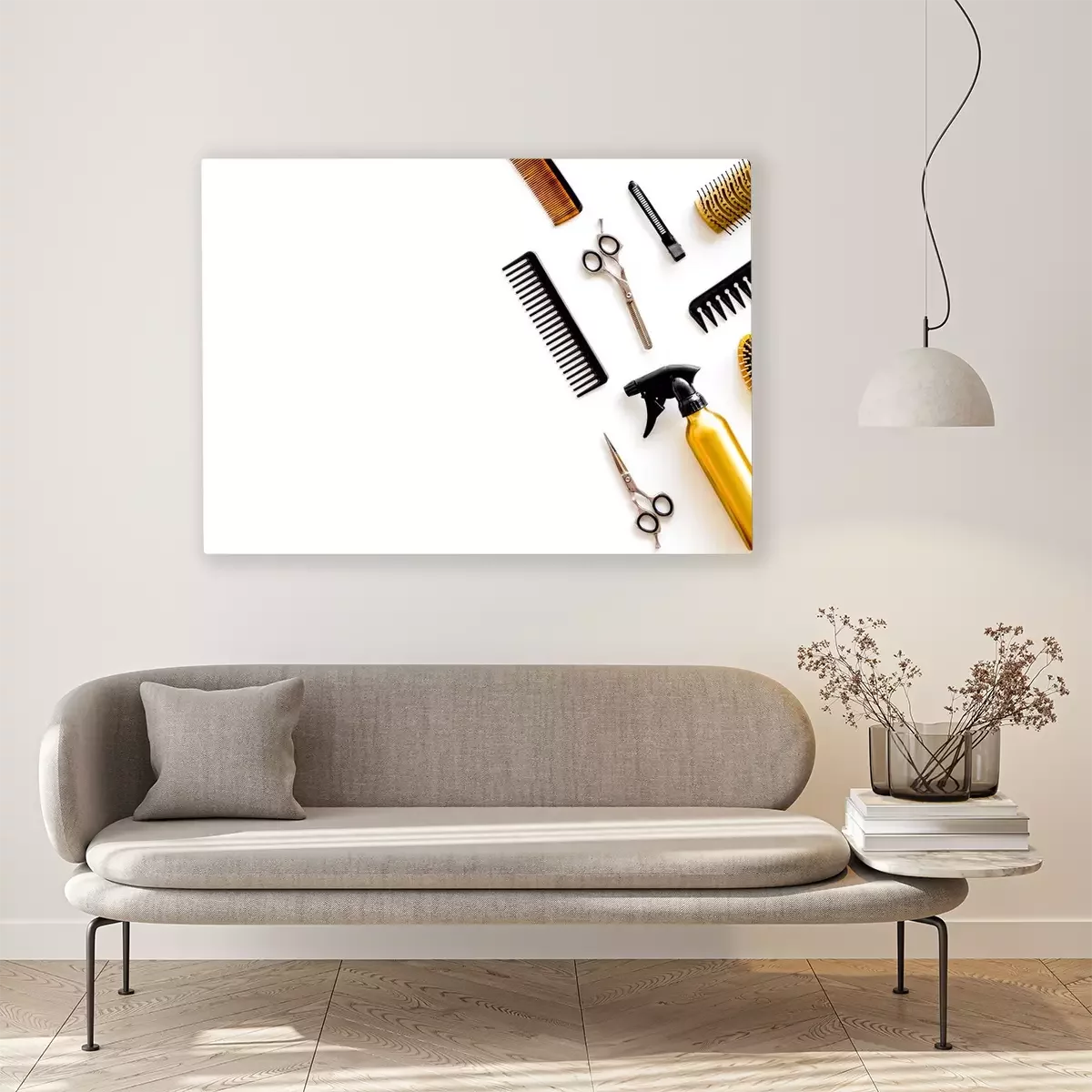 Canvas: Combs, spray and hairdresser tools in beauty salon work desk on white background top view mockup