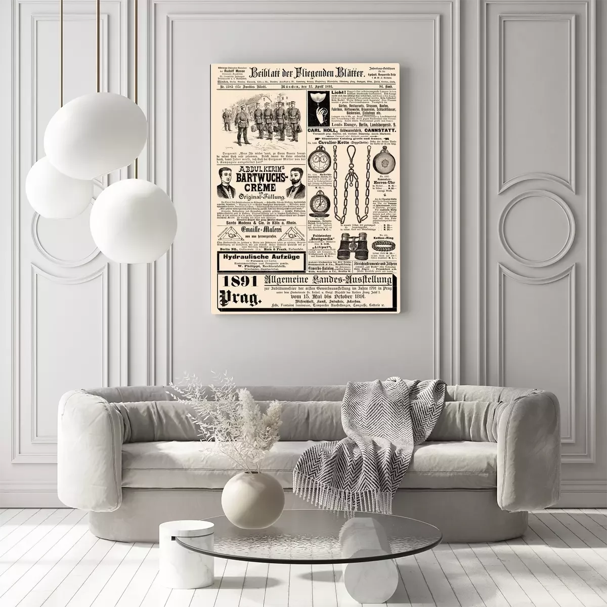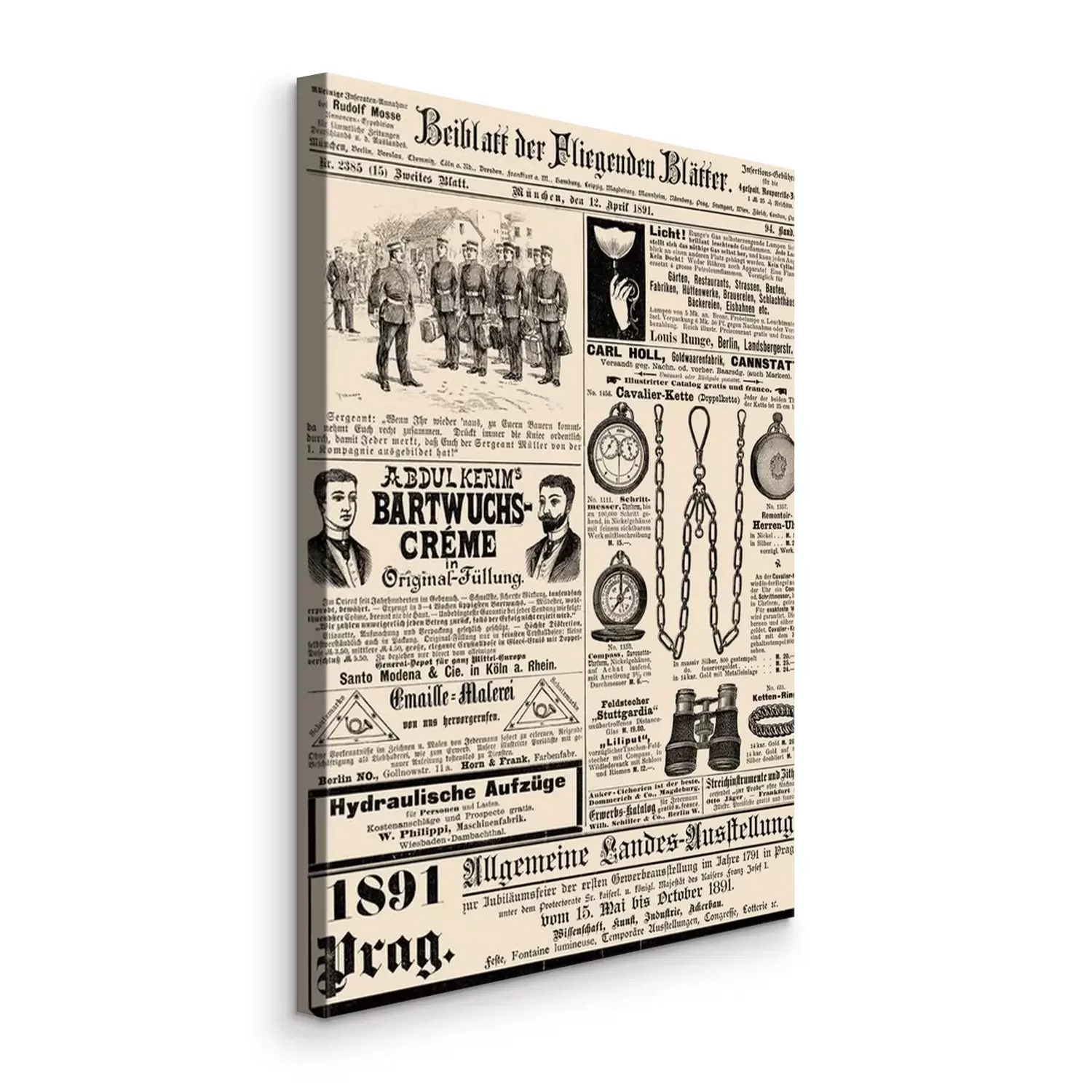 Canvas: Commercial magazine advertising page in German with many promotion banners,vignettes and caricatures; dated 1891