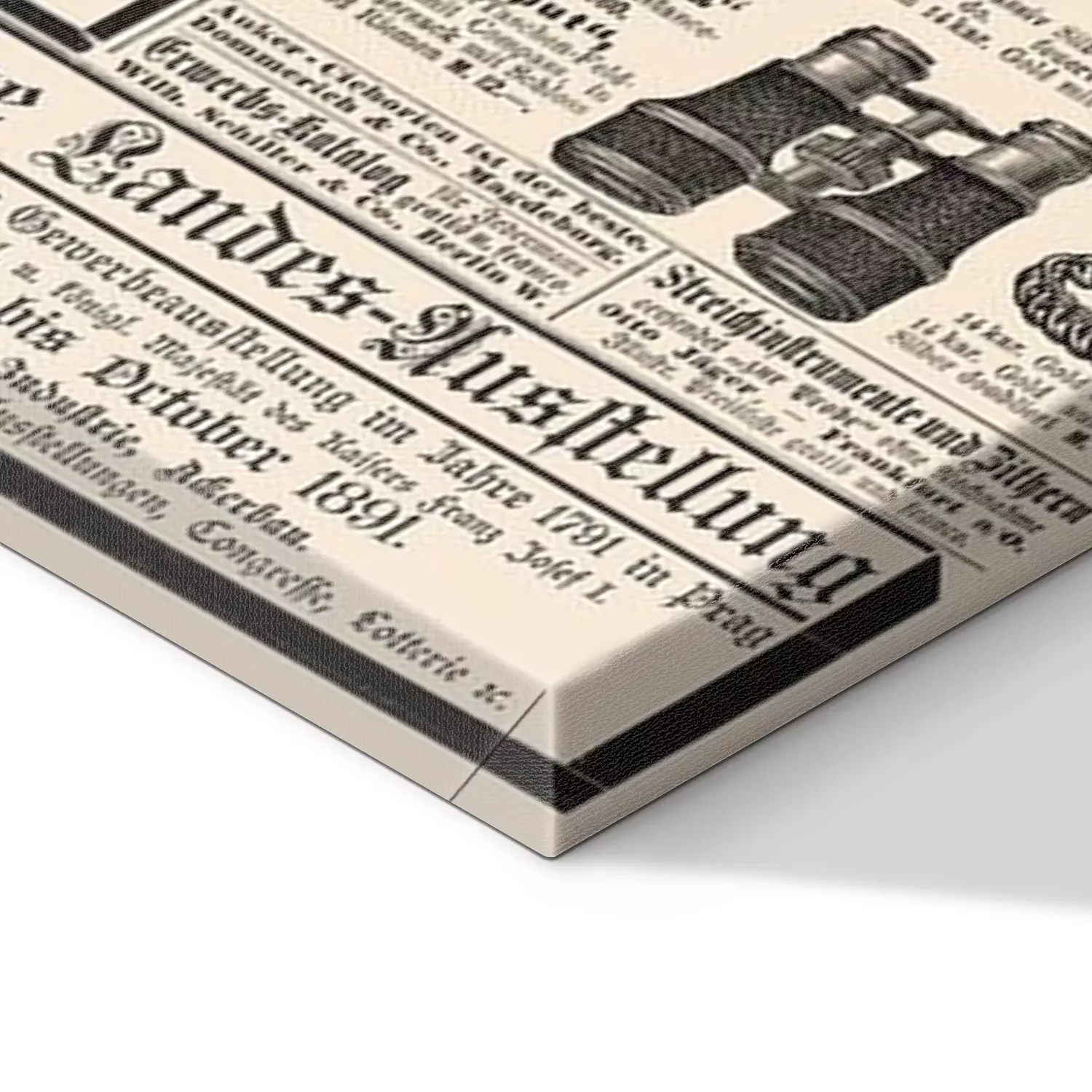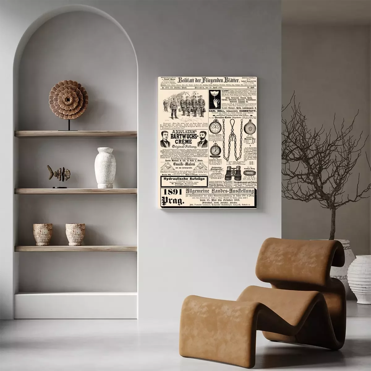 Canvas Commercial magazine advertising page in German with many promotion banners,vignettes and caricatures; dated 1891