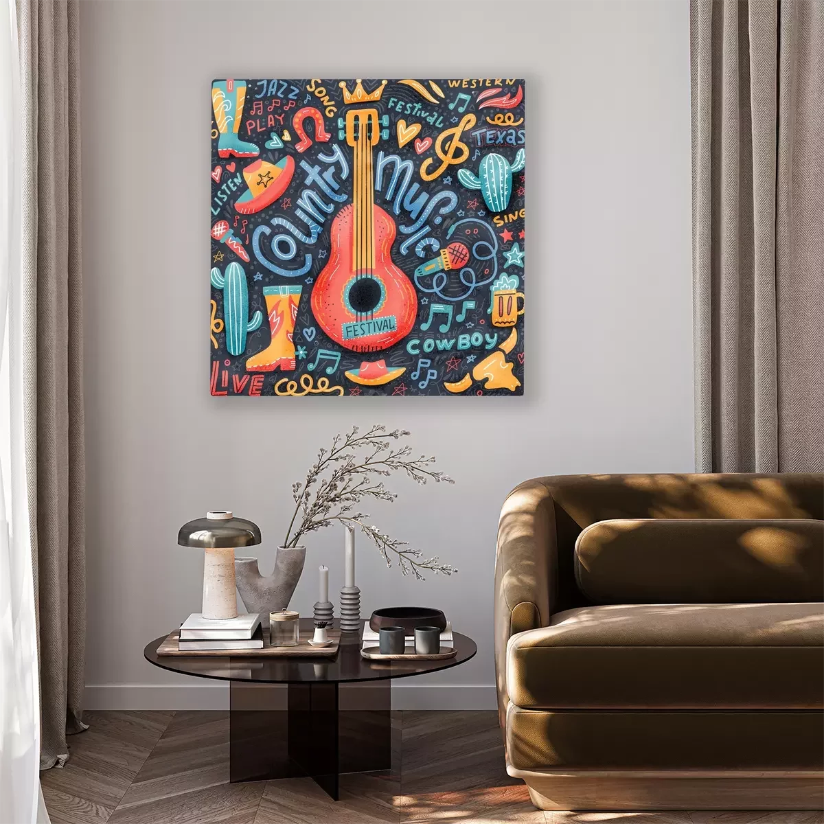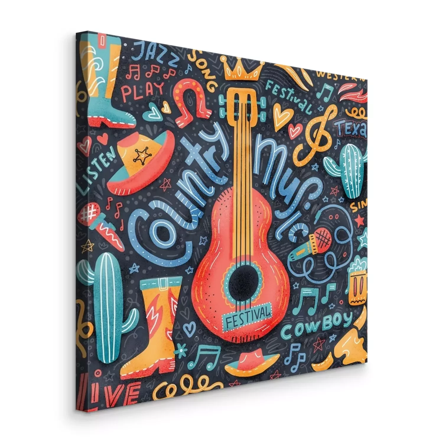 Canvas Country music print concept for postcards or festival banners. hand drawn illustration in textured flat doodle style. Guitar with written lettering.