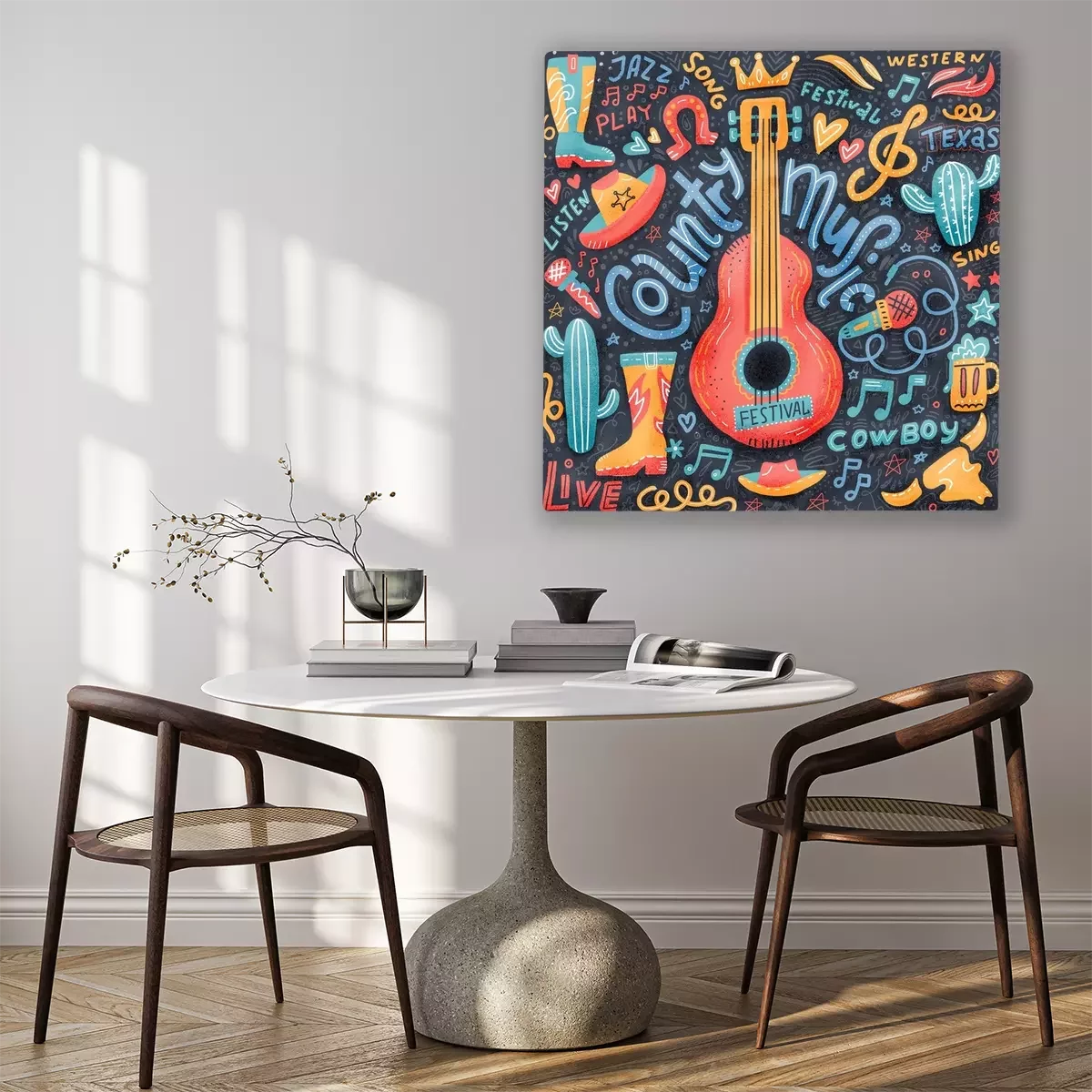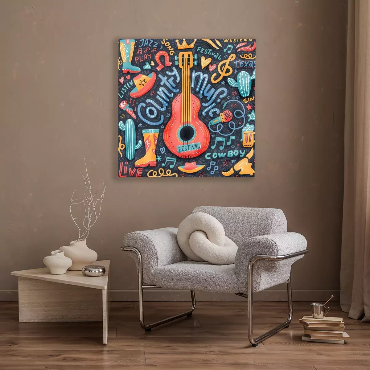 Canvas: Country music print concept for postcards or festival banners. hand drawn illustration in textured flat doodle style. Guitar with written lettering.